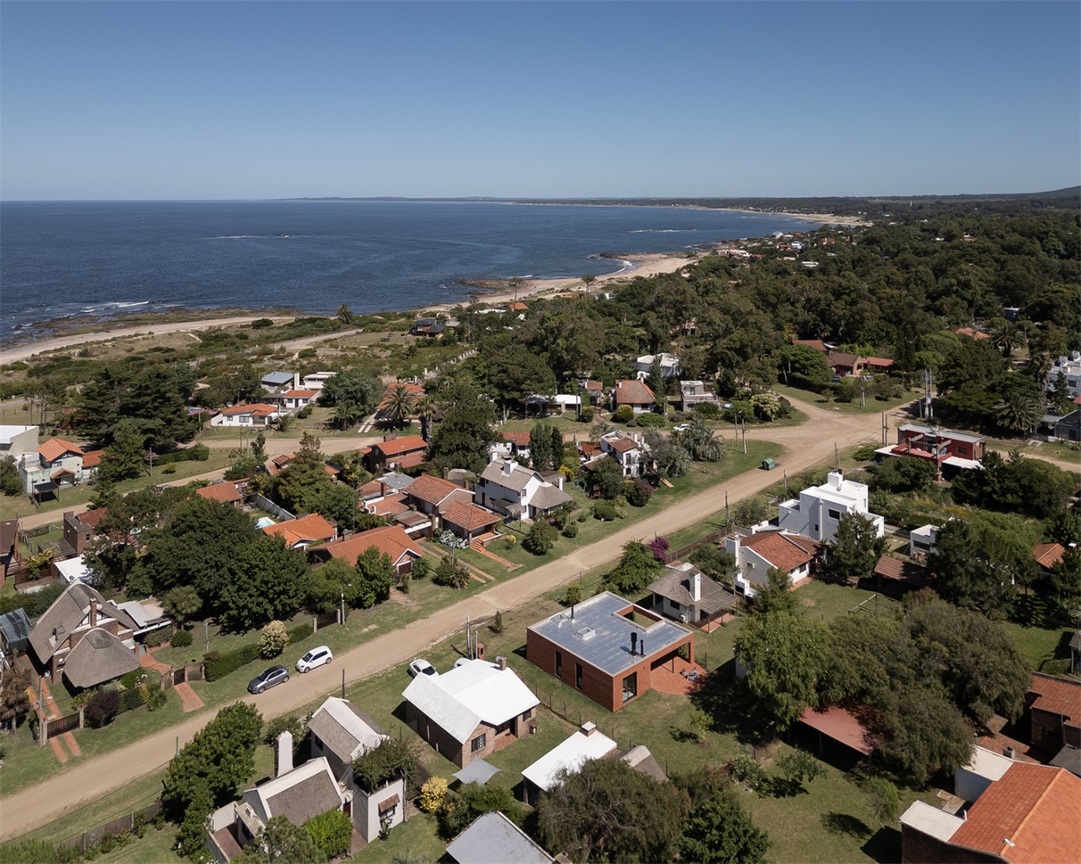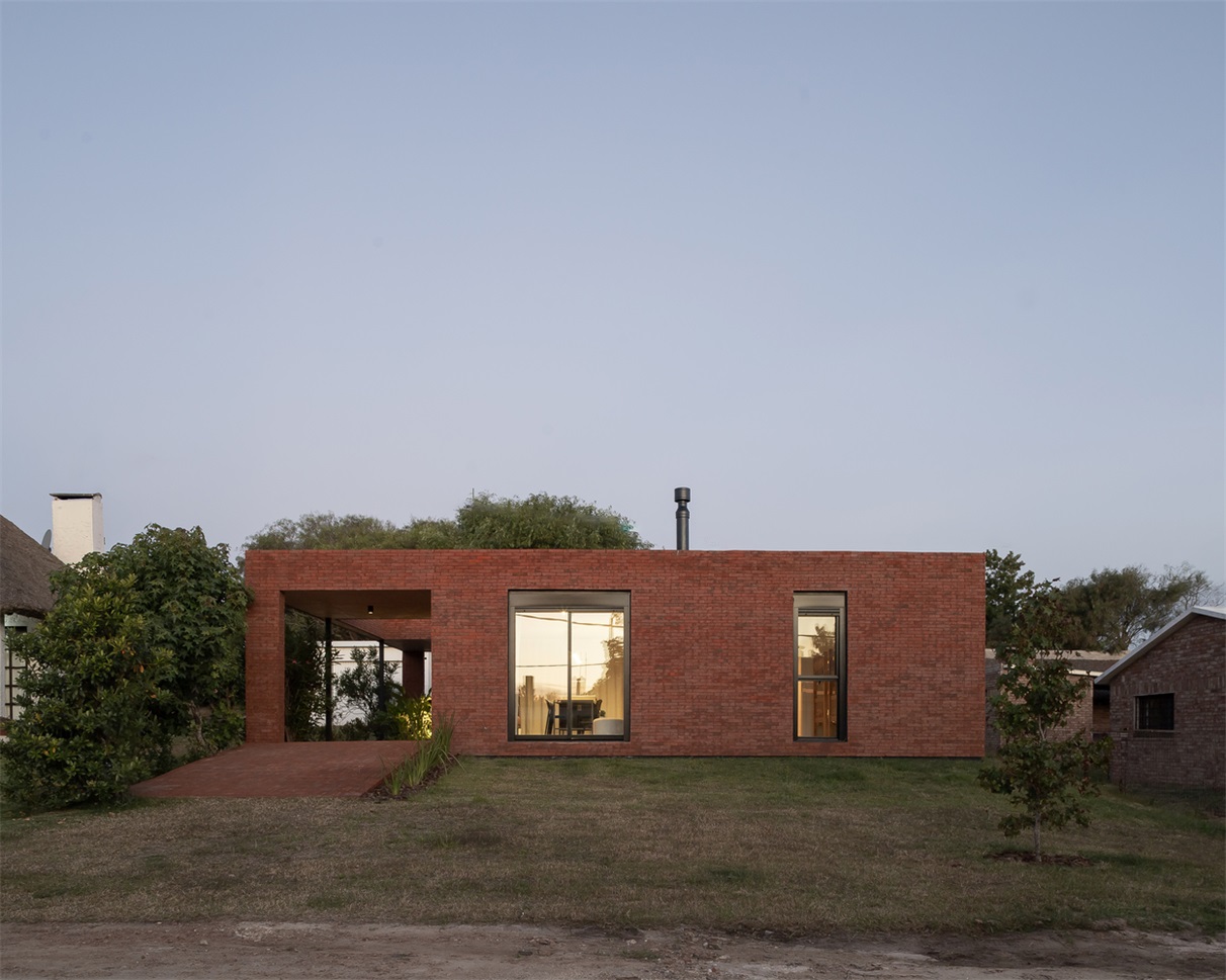 pRoA红砖平房设计是一个尺寸为 12×12×3 米的棱柱体建筑,位于乌拉圭马尔多纳多的普拉亚韦尔德(Playa Verde)和普拉亚埃尔莫萨(Playa Hermosa)之间。