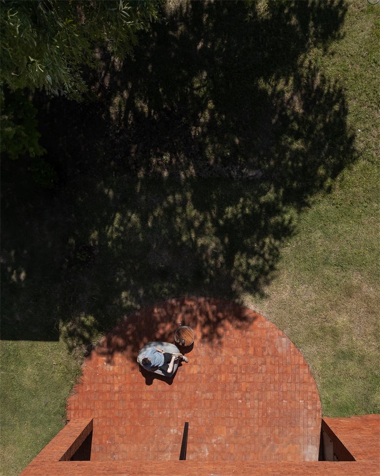 建筑结构的垂直构件包括混凝土柱和金属柱。混凝土柱(截面较大)被战略性地布置以勾勒出棱柱体的轮廓,外部包覆砖块;金属柱(截面较小)则用于确定半圆形的中心位置,并勾勒出开放式庭院的边界。