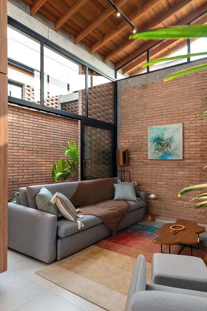 另一个重要设计是在前部退距悬挑下方设置储物区,用于存放自行车和其他设备。由于燃气供应设施也布置在此区域,立面采用了穿孔砖 “cobogó”(巴西传统通风砖),确保空气流通。最后,我们利用后院设置了带顶棚的洗衣区,包含晴朗天气下的露天晾衣区和一片草地 —— 后者尤其适合养宠家庭。