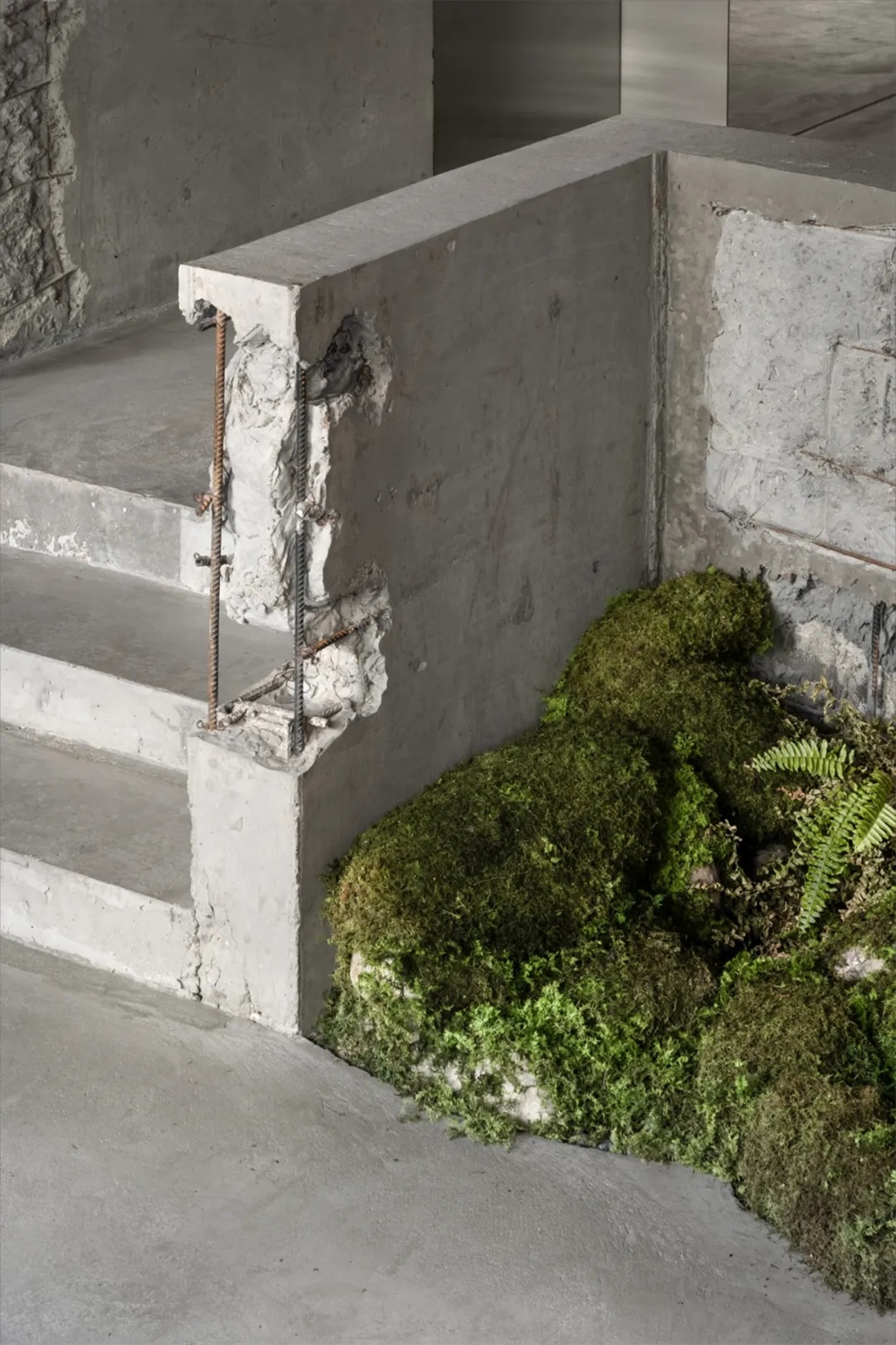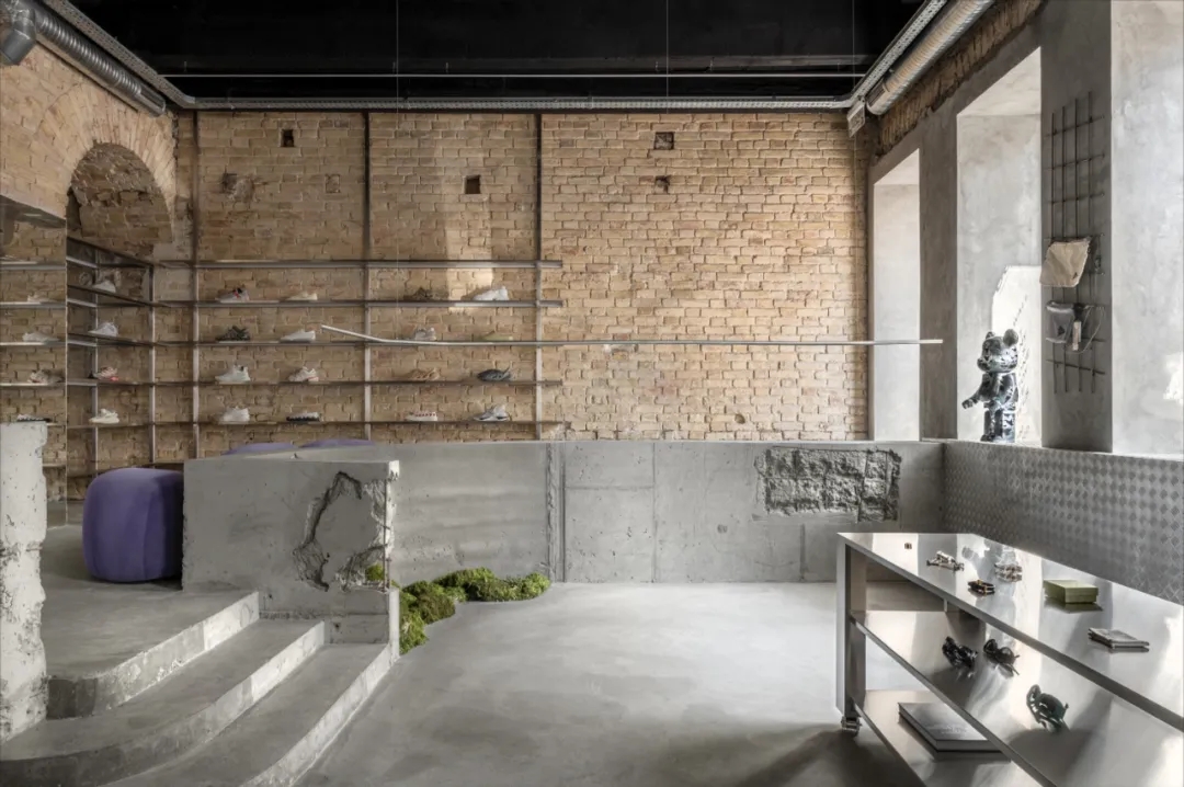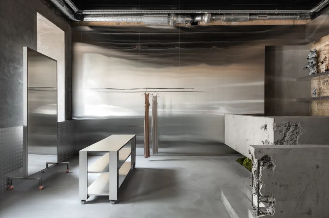 STORAGE 的设计,从品牌 “现代时尚与文化保护” 的核心理念出发,将曾为美容院的空间重新改造,既保留原有层次感,又适配现代零售功能,处处透着 “粗犷却精致” 的工业美学。踏入店内,男装区的金属与混凝土材质率先营造出强烈的工业氛围 —— 冷冽的金属线条、带着原始质感的混凝土墙面,让时尚单品多了几分硬朗张力。最吸睛的当属接待台:表面故意保留的 “腐烂痕迹” 打破了商业空间的精致套路,以不完美的粗犷感,成为空间设计的记忆点,也暗合 “保护文化、留存真实” 的品牌主张。空间的核心,是一道巨大的拱顶门 —— 这里被用来展示鞋类系列,拱顶的弧形线条自带高端排他感,让鞋履成为视觉焦点;与之形成有趣对比的,是一旁的时尚摄影区:以利落的钢墙为背景,墙面嵌入控制面板,连接着可升降的金属衣架 —— 顾客需要拍照时,只需轻按按钮,衣架便能轻松吊起,既解决了拍摄遮挡问题,又让工业风的空间多了几分灵活与创意。
