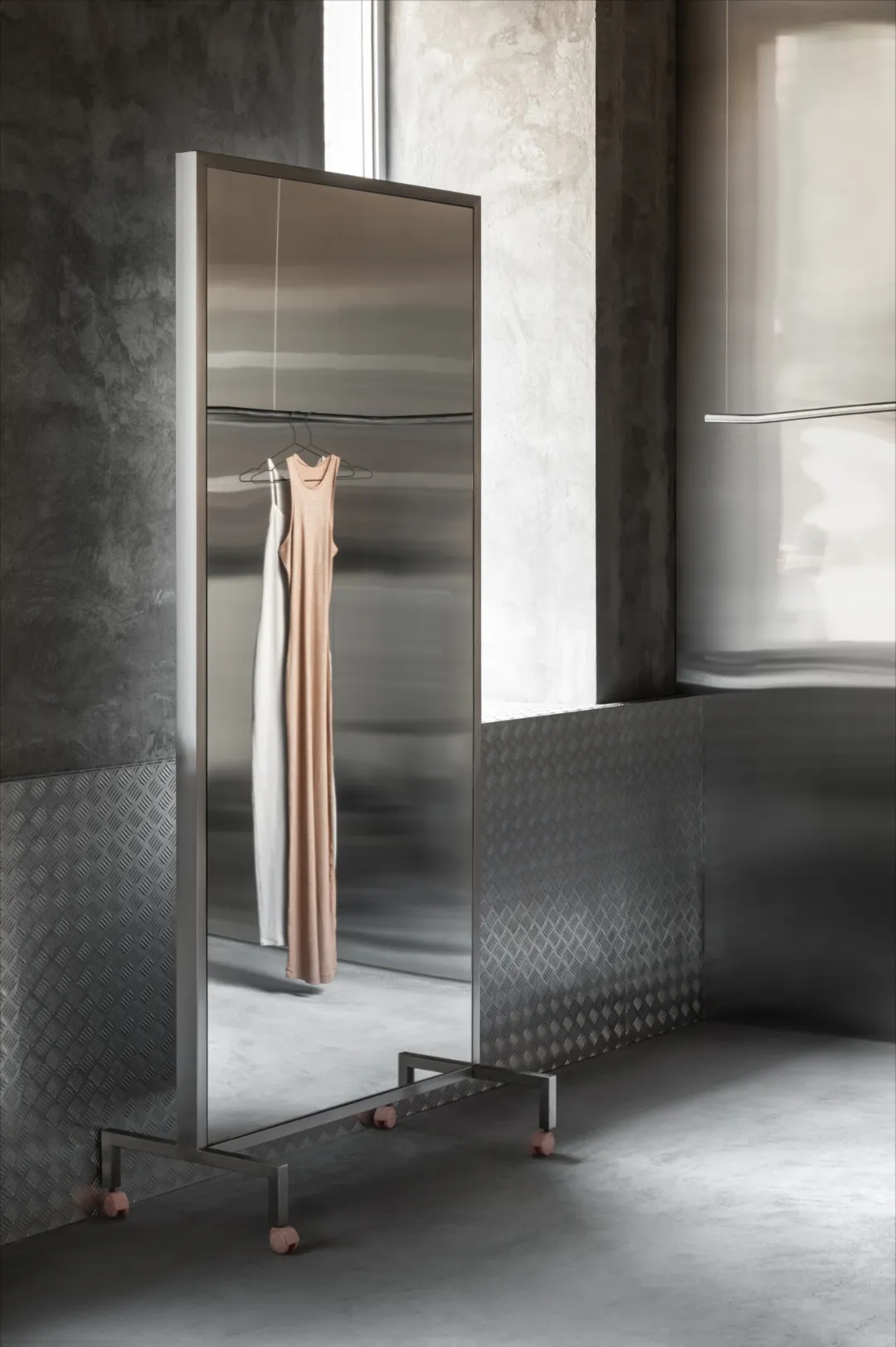 若说 STORAGE 是工业风的 “硬派表达”,Domaine17 则完全转向柔和 —— 针对女性客户需求,设计师用圆形元素、多彩色调与波纹钢砖墙碰撞,打造出温暖又现代的购物空间,每一处细节都藏着 “梦幻与互动” 的巧思。刚进店,波浪框架的镜子与粉红色地板卷轴便牢牢抓住视线:波浪线条消解了直角的生硬,粉色则注入温柔活力,瞬间勾勒出女性喜爱的浪漫氛围;而店内的互动艺术装置更添趣味 —— 老式电视与相机实时捕捉顾客动作,再将画面投射到屏幕上,让购物不再是单向的挑选,而是与艺术互动的沉浸式体验。细节处更见设计巧思:远端的试衣间被镜面完全覆盖,踏入其中便陷入 “光影幻境”,模糊了空间边界;沉重的试衣间门象征着对隐私的守护,带来踏实安全感;而角落的不对称粉红色 Bug 桌子,则以俏皮的造型与轻盈的色彩,中和了镜面与门的厚重感,为空间注入灵动气息。