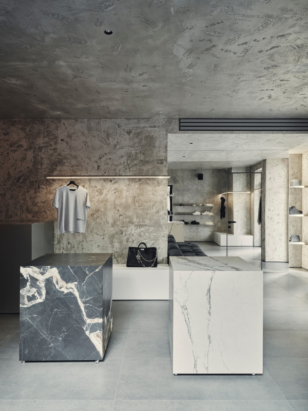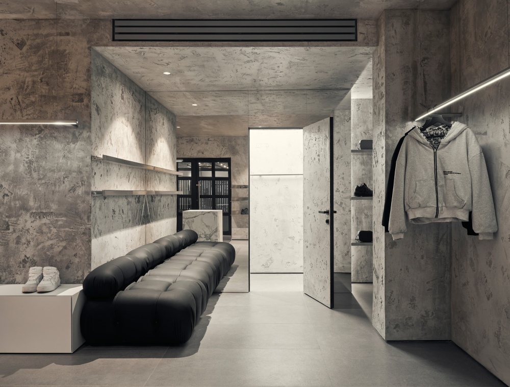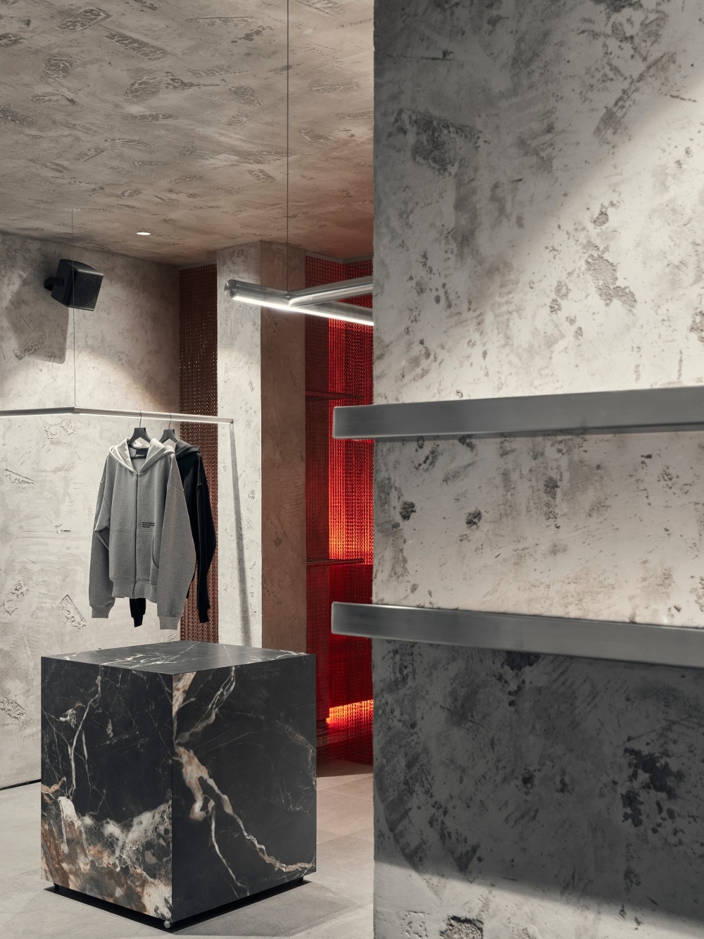 空间以 “粗犷混凝土” 为主要材质,墙面与顶面保留了混凝土的原始肌理 —— 斑驳的痕迹、不规则的凹凸,传递出莫斯科野蛮主义建筑的力量感与在地性。这种 “未完成感” 的材质选择,既是对城市建筑遗产的致敬,又为时尚单品提供了 “中性而有张力” 的展示背景,让服装、鞋包的设计细节在粗犷肌理中愈发突出。在野蛮主义的粗犷基底上,巴黎美学以 “金属、石材与灯光” 的形式悄然渗透。不锈钢展示架的冷冽光泽、大理石展台的天然纹理、线性灯光的柔和漫射,如同巴黎街头的精致橱窗,为空间注入优雅质感。例如,黑白大理石展台的 “几何纯粹性”,直接呼应了巴黎现代主义设计的理性美学,与混凝土的粗犷形成 “刚与柔、粗与细” 的视觉对比,让风格碰撞成为空间的 “美学锚点”。