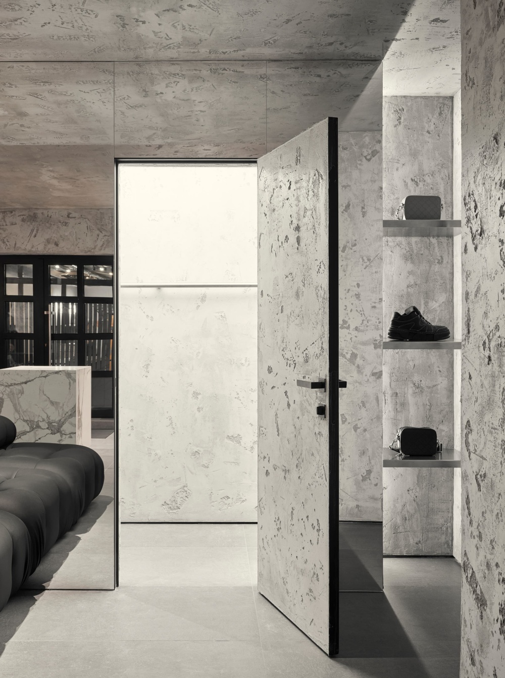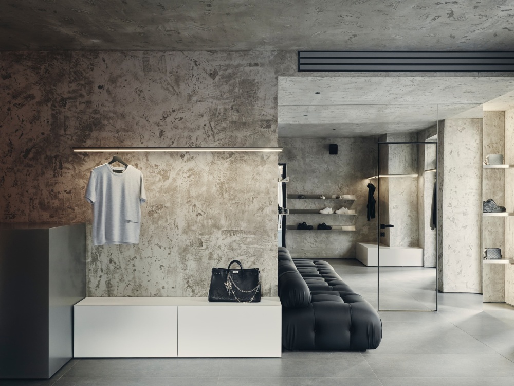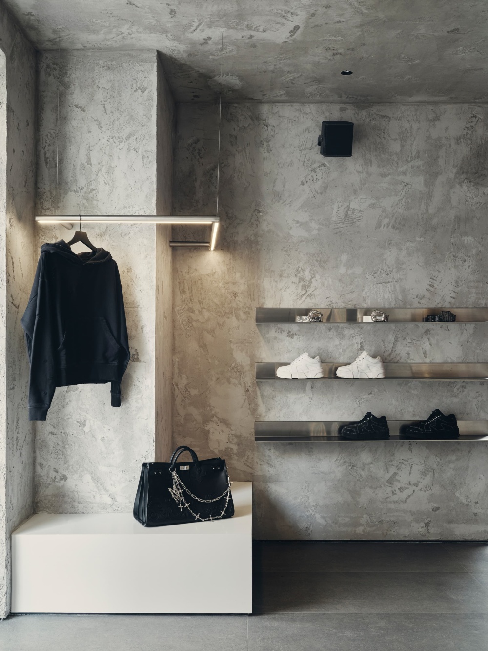 空间以 “粗犷混凝土” 为主要材质,墙面与顶面保留了混凝土的原始肌理 —— 斑驳的痕迹、不规则的凹凸,传递出莫斯科野蛮主义建筑的力量感与在地性。这种 “未完成感” 的材质选择,既是对城市建筑遗产的致敬,又为时尚单品提供了 “中性而有张力” 的展示背景,让服装、鞋包的设计细节在粗犷肌理中愈发突出。在野蛮主义的粗犷基底上,巴黎美学以 “金属、石材与灯光” 的形式悄然渗透。不锈钢展示架的冷冽光泽、大理石展台的天然纹理、线性灯光的柔和漫射,如同巴黎街头的精致橱窗,为空间注入优雅质感。例如,黑白大理石展台的 “几何纯粹性”,直接呼应了巴黎现代主义设计的理性美学,与混凝土的粗犷形成 “刚与柔、粗与细” 的视觉对比,让风格碰撞成为空间的 “美学锚点”。