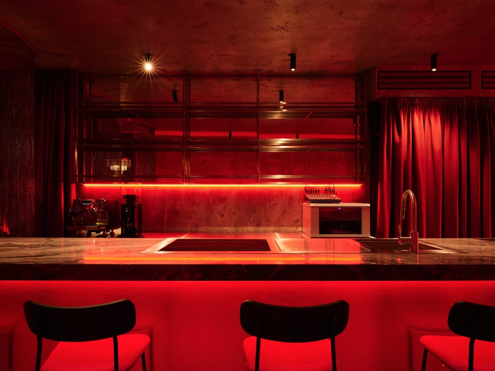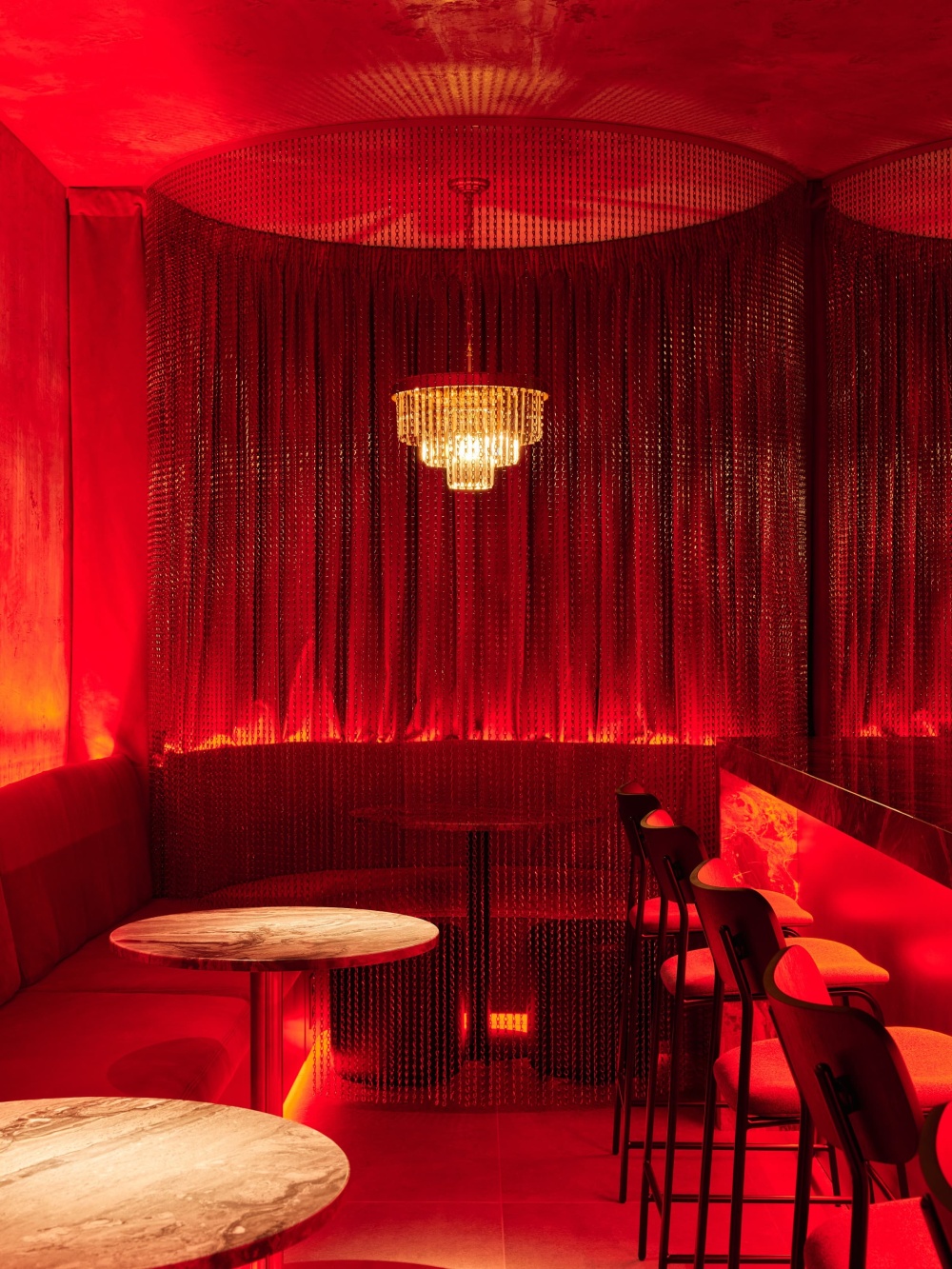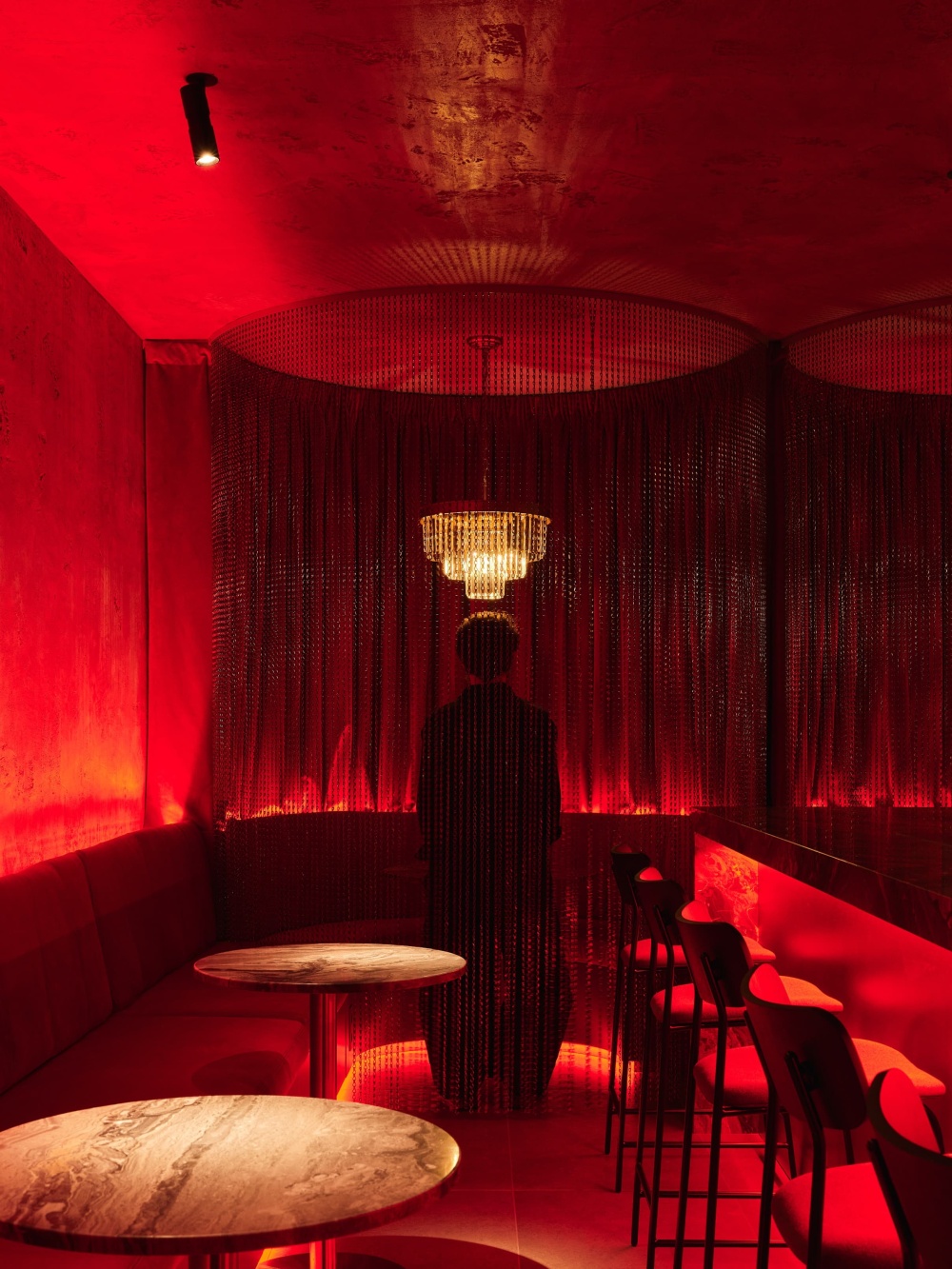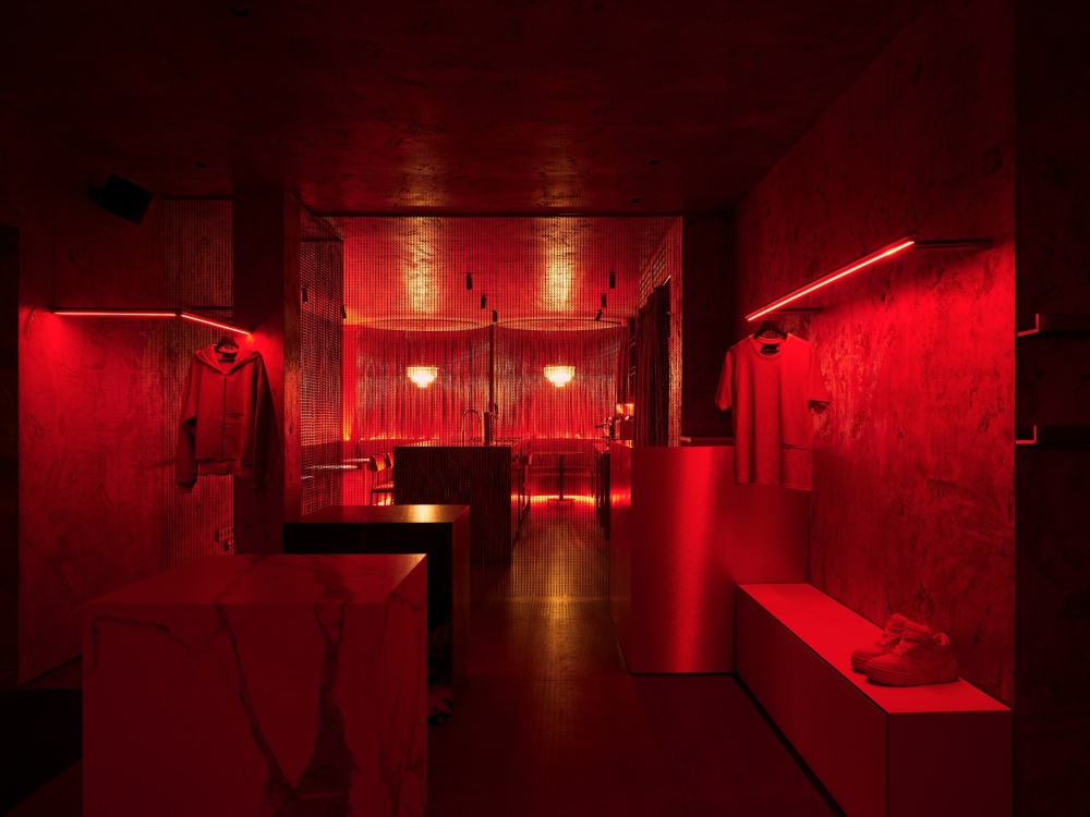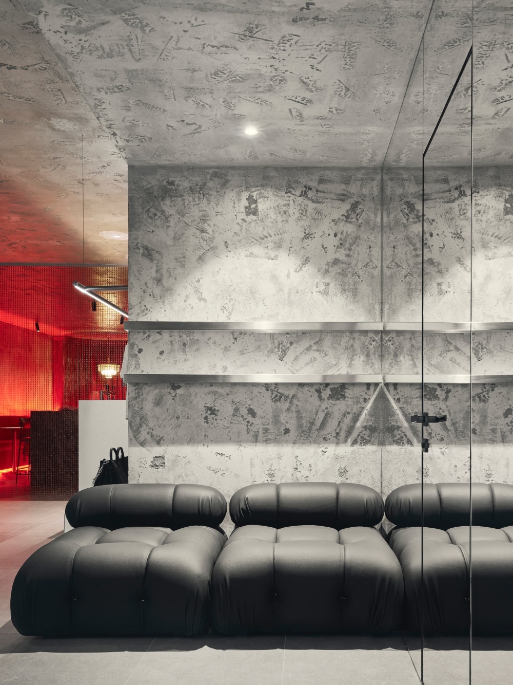 日间,空间以 “开放式布局 + 极简陈列” 呈现。不锈钢层架错落展示鞋包,白色展台与黑色皮质沙发形成 “黑白对话”,服装则通过线性灯光的聚焦,悬挂于混凝土墙面,让每一件单品都成为 “可被深度欣赏” 的时尚艺术品。此时,混凝土的粗犷肌理是 “背景板”,金属与石材的精致是 “主角光环”,共同构建出高级时装店的冷峻美学。夜幕降临,空间通过 “灯光切换 + 材质隐藏” 完成业态转换。红色灯光的注入,让混凝土墙面呈现出暧昧的暖调;金属链帘的降下,划分出私密的饮酒区域;水晶吊灯的点亮,为空间披上巴黎式的奢华外衣。此时,白天的时装展台被巧妙隐藏,取而代之的是大理石吧台与红色丝绒座椅,让空间从 “时尚秀场” 蜕变为 “都市夜宴”,实现了功能与氛围的双重反转。