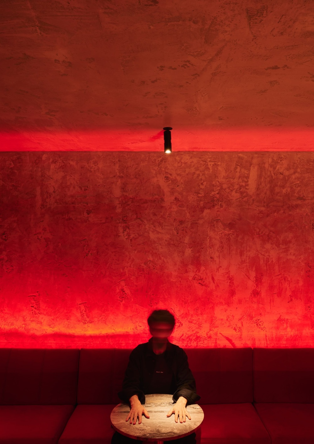 混凝土墙面与顶面的原始肌理,是空间的 “静态基底”,无论昼夜、无论业态,都以其粗犷的质感锚定空间的在地属性。这种材质的 “耐久性” 与 “可塑性”,让它能兼容时尚的精致与酒吧的暧昧,成为 “风格融合” 的核心媒介。不锈钢层架的 “工业感”、大理石展台的 “奢华感”,在日间是时装的 “最佳配角”,通过材质的冷硬质感凸显服装的设计细节;夜间则是酒吧的 “氛围担当”,金属的反光与石材的肌理在红色灯光下,营造出 “冷峻而迷人” 的夜场气质。金属链帘与红色丝绒的引入,是夜间酒吧氛围的 “转换器”—— 链帘的半透明质感划分空间又保留通透,丝绒的柔软触感中和了混凝土的坚硬;红色灯光与水晶吊灯的组合,则是 “氛围魔术” 的关键,让空间在明暗与色彩的切换中,完成从 “日” 到 “夜” 的情绪转变。