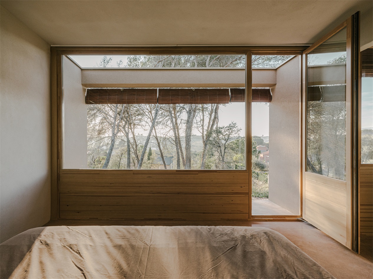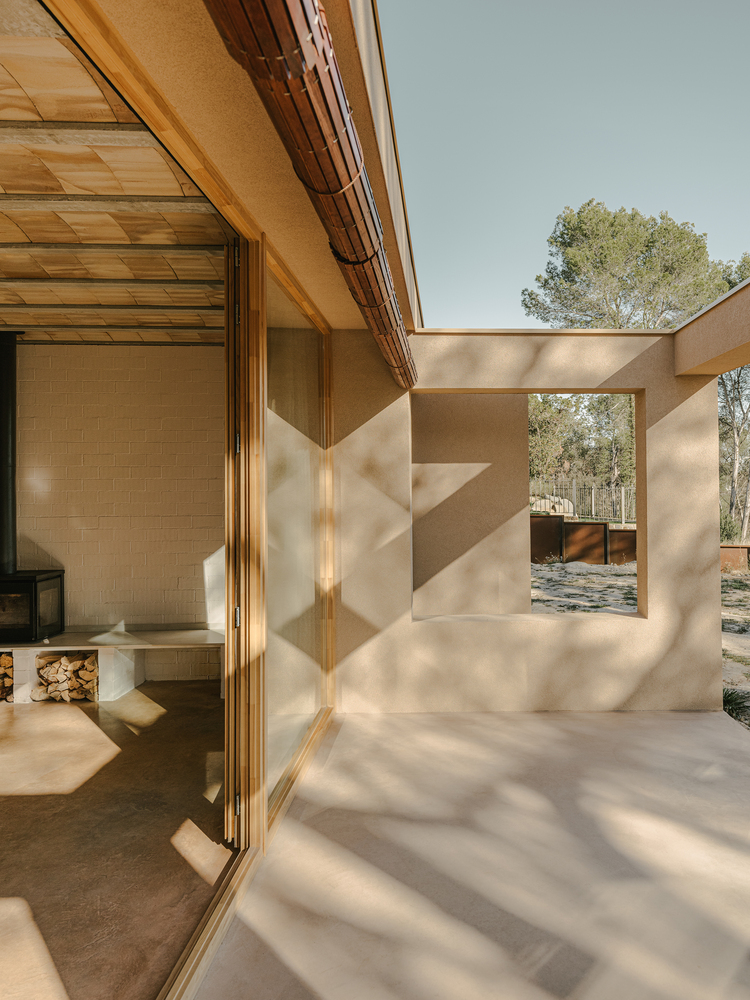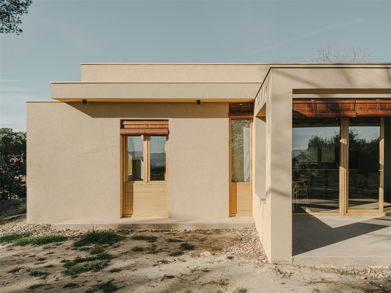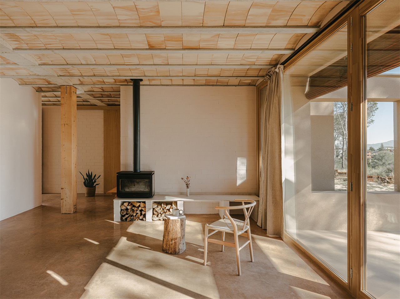 围护结构的热惯性,再加上建筑围护系统的高性能,使我们无需使用供暖系统。仅靠一个中央壁炉就能提供必要的舒适感。夏季的高温通过能遮挡直射辐射的门廊得以缓解,同时,穿堂风确保了空气流通,以维持最佳的舒适度。