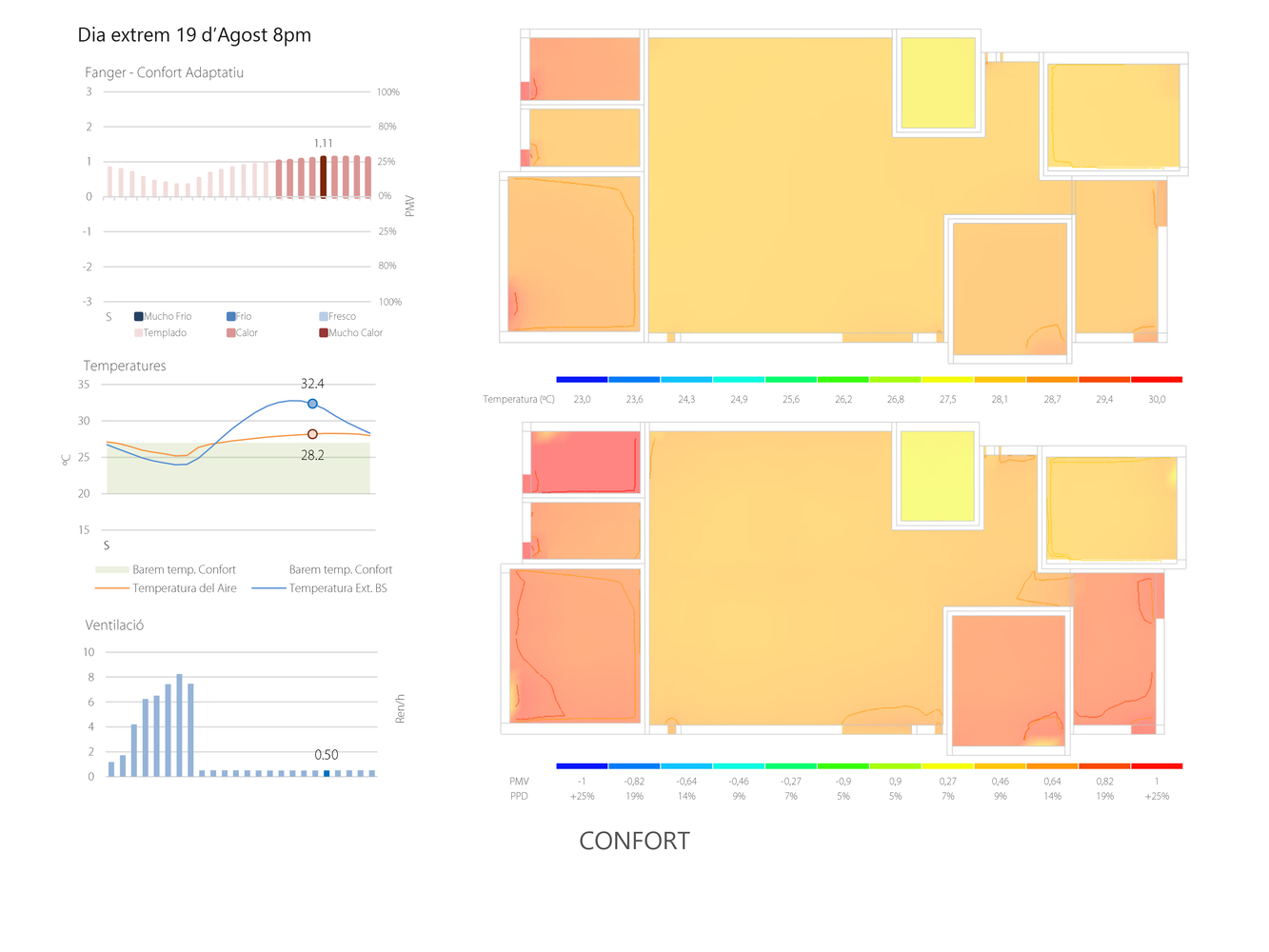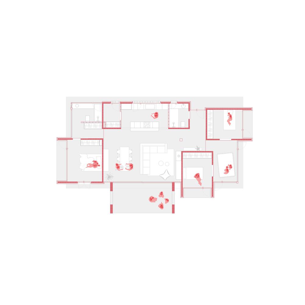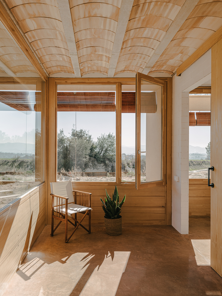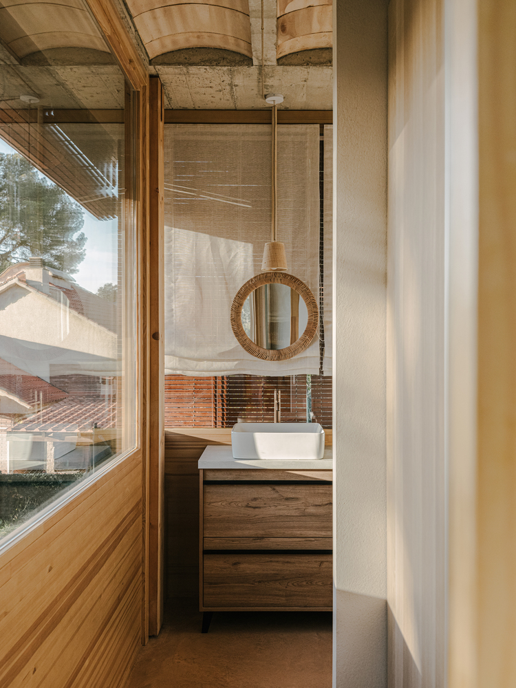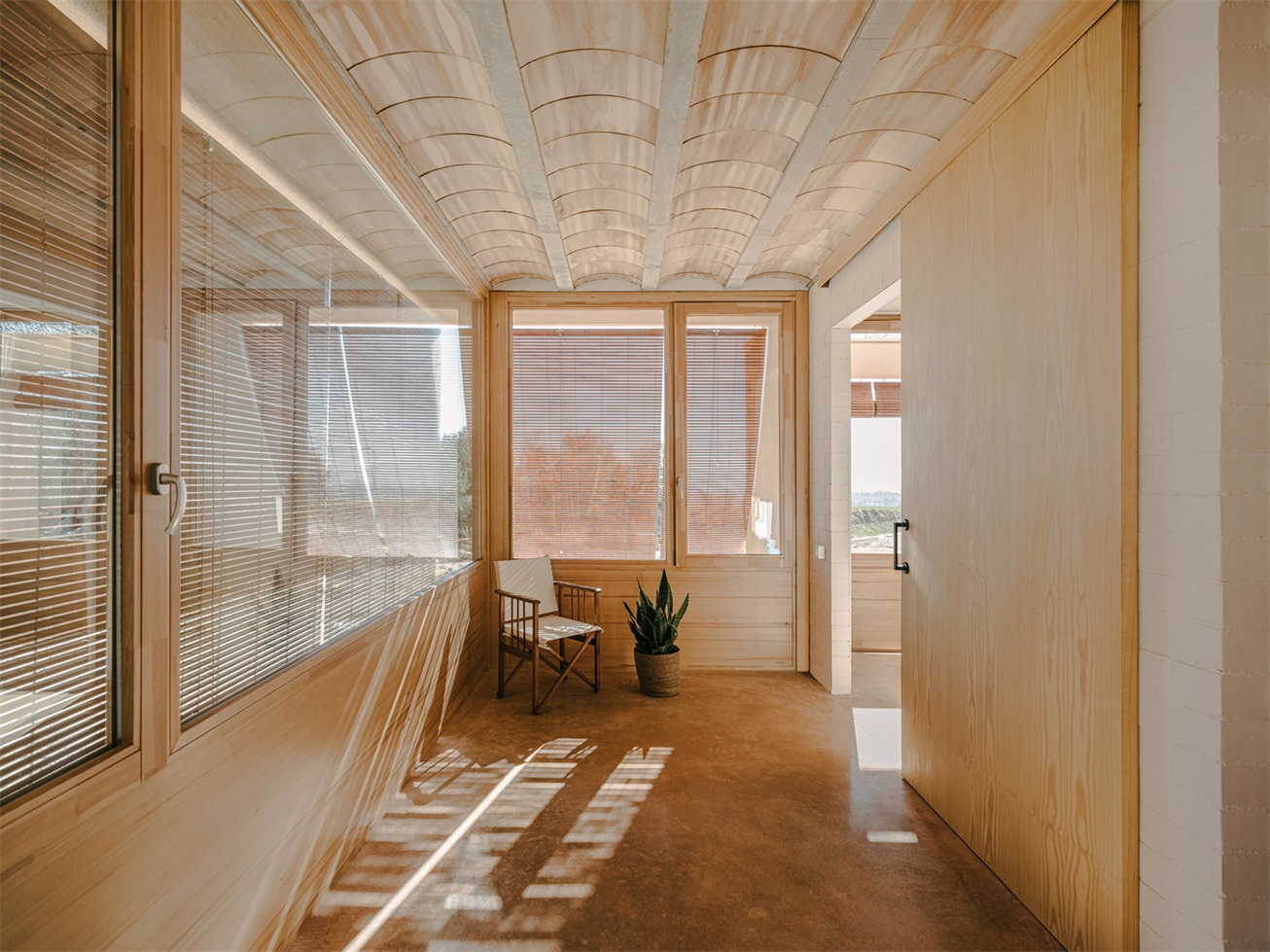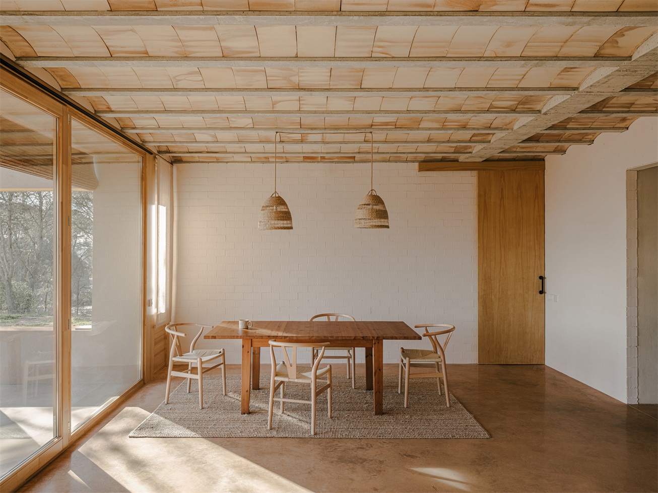 这个项目是该事务所作品的典范,它表明了无需借助复杂且昂贵的系统也能实现高度的舒适度。良好的设计与对高性能围护结构的投入相结合,将能源需求降至最低,无需使用诸如与空气热能相关的供暖系统,在这个项目中,空气热能仅专门用于生活热水(DHW)的供应。用餐区位于中央,被隔间环绕,确保了设计的紧凑性,仅靠一个壁炉和吊扇就能在全年保持舒适。这种方法表明,高效的设计能够在不产生不必要额外成本的情况下保证舒适度和可持续性。