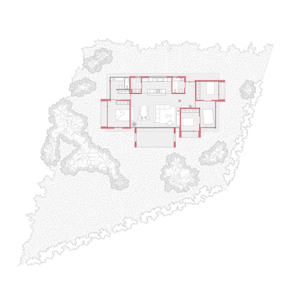 从一开始,设计的基本前提就明确界定好了:自然将决定基本条件。室内与室外的关系成为了设计的指导原则。保留树木曾被视为一种选择,但这真的是最理想的选择吗?可能并非如此。无条件地保留这些松树可能会影响到房屋高效运作所必需的日照获取量。对于现有的植被,必须要谨慎地权衡利弊,找到一个平衡点。