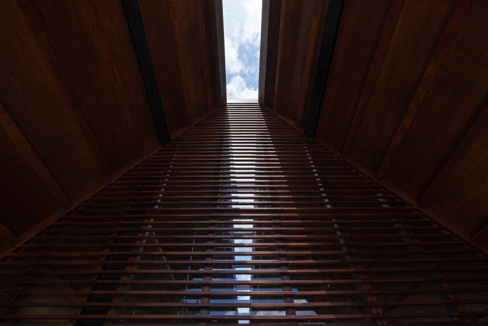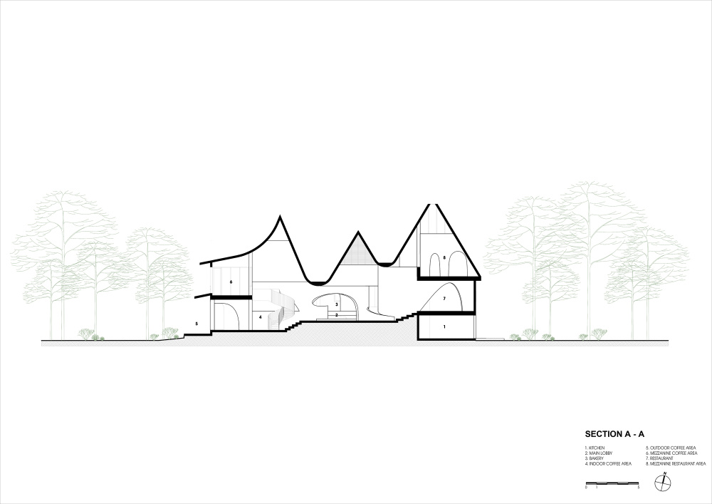 越南西原高地的传统公共建筑“荣屋”,是MA.DE小馆的灵感源头,但设计师并未陷入“形制复刻”的误区,而是完成了一场“精神内核的转译”。荣屋作为地域文化的标志性符号,其核心特质在于“与高地环境的适配性”与“公共空间的聚合感”,这些特质被提炼为小馆的设计语言。最具辨识度的设计,是小馆的屋顶形态——三座高度错落、相互联结的尖顶,构成富有韵律感的建筑轮廓,既呼应了荣屋的坡顶基因,又暗合西原高地连绵起伏的山峦形态。这种“拆解与重构”的设计手法,让建筑既保留地域建筑的熟悉感,又具备现代设计的简洁张力。屋顶与墙体之间刻意留出的间隙,成为自然的“入口”:自然光透过缝隙洒入室内,形成斑驳光影;穿堂风自由穿行,带走高地的潮湿,让建筑与自然达成“被动式节能”的默契。屋顶之下,功能分区呈现“散而不乱”的布局逻辑。看似散落的空间被整体性屋顶串联为有机整体,既满足了复合型服务空间的多元需求,又通过“屋顶统领全局”的设计,延续了荣屋作为“公共聚合空间”的精神内核,让人们在不同功能区穿梭时,始终能感受到空间的连贯与统一。