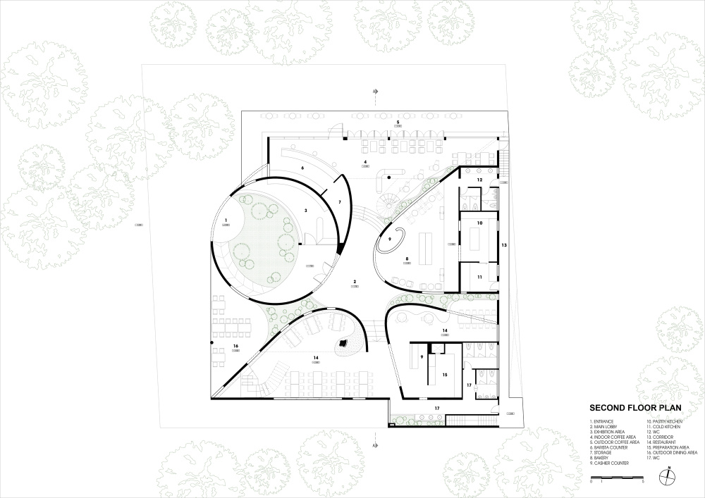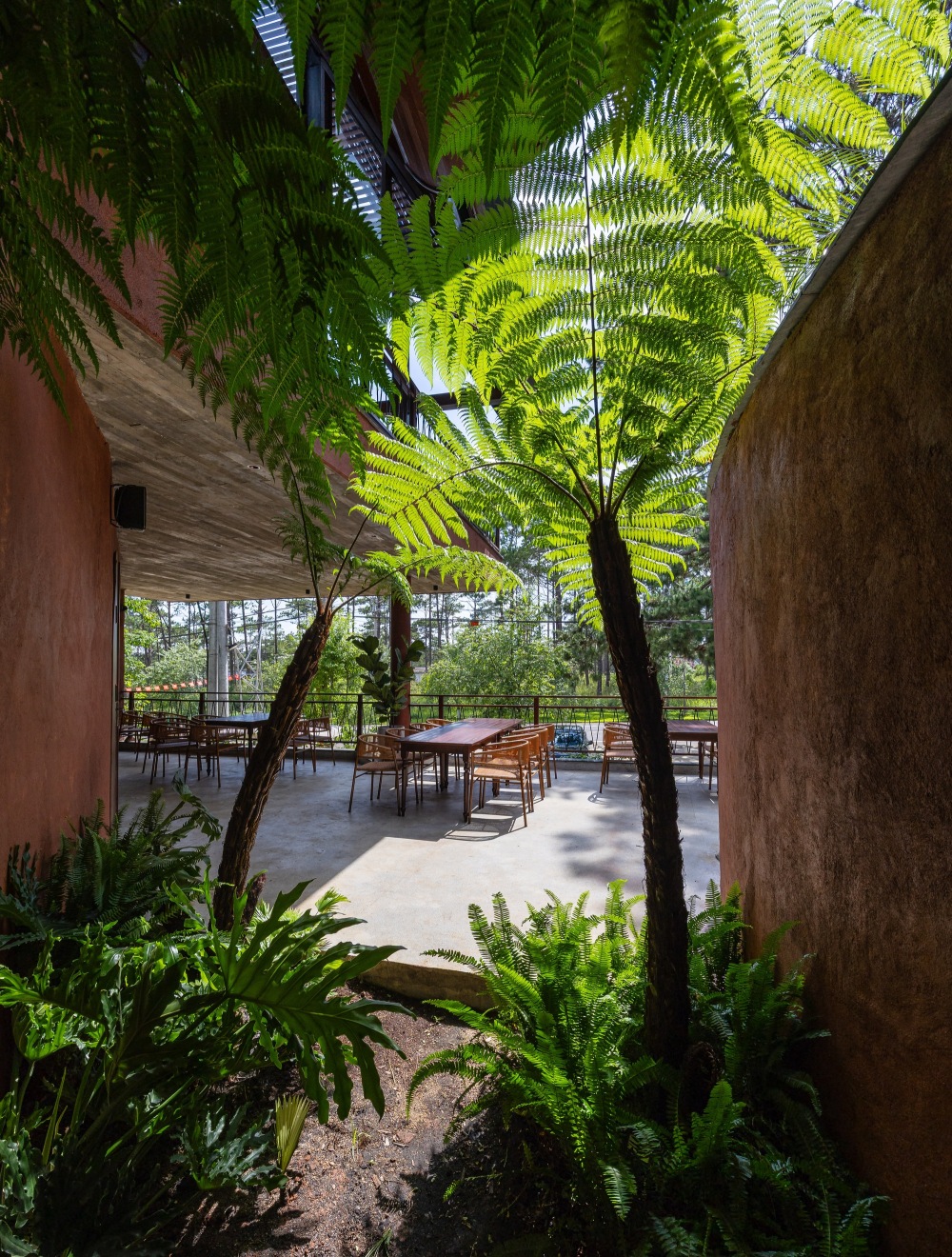 MA.DE小馆的空间体验,以“层层递进的场景变换”为核心,设计师通过“过渡空间的营造”与“框景手法的运用”,让自然与人文在空间中形成对话。主入口处的开放式圆形庭院,是室内外的“柔和缓冲带”——它既延续了越南传统建筑“庭院为核”的布局理念,又为进入室内的人们提供了“从松林到建筑”的情绪过渡,避免了空间转换的突兀感。从庭院向内延伸,各功能空间顺着地势缓缓向松林方向铺展,细微的高差变化成为“天然的空间分隔”,催生出适宜交流的私密氛围。这种“顺应地势”的布局,既减少了土方工程对场地的破坏,又让空间形成“高低错落”的节奏,如同高地的自然地貌。设计师没有将松林景观全盘托出,而是以“框景之法”进行“取舍与提炼”——通过墙体的转折、门窗的尺度控制,将山林之美化为一幅幅凝练的画面,在人们穿行过程中不经意间映入眼帘,让每一次转身都成为与自然的惊喜邂逅。“开合与围合”“光影与明暗”的场景变换,构成了空间的叙事节奏。公共区域以“开敞”为主,大面积的通透设计让松林景观成为空间的背景;私密区域则通过“围合”实现,以矮墙、屏风与绿植形成半私密空间。自然光透过屋顶间隙与门窗,在地面与墙面形成移动的光影,让空间在不同时段呈现不同气质,强化了“与自然同频”的体验感。