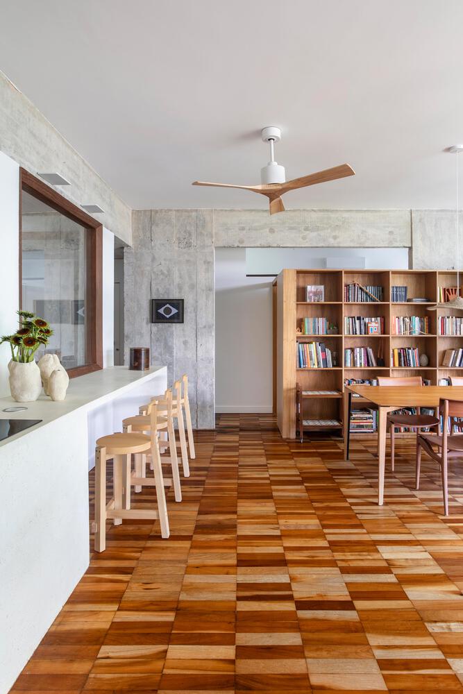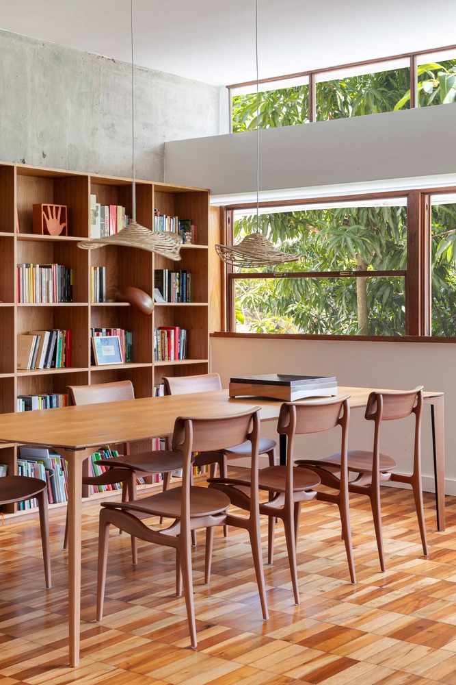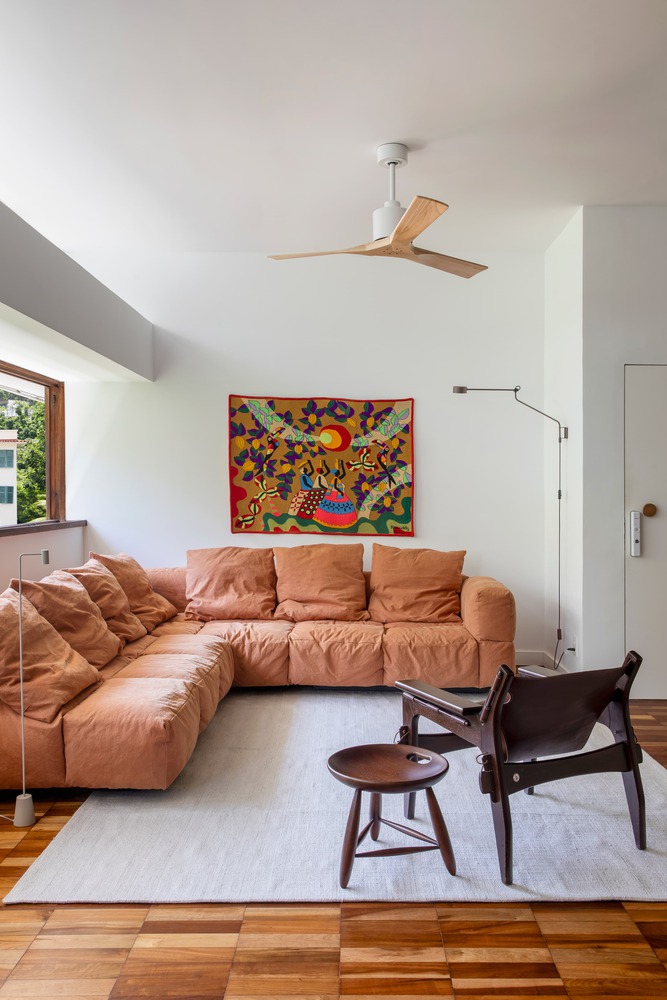 材质的选择与软装的搭配,构建了 “复古而不陈旧” 的空间氛围。巴西本土木材贯穿始终,苏库皮拉木的坚硬质感、弗雷茹木的温润肌理与薄木胶合板的轻盈特性,形成丰富的材质层次,既彰显了地域特色,又传递出自然的温度。白色清水混凝土的粗犷与砖砌镂空墙的细腻形成对比,呼应巴西现代主义与粗野主义的设计脉络。软装装饰则是复古与当代的巧妙平衡。20 世纪 60 年代艺术家肯尼迪・巴伊亚的挂毯、劳尔・莫朗的画作,为空间注入复古艺术气息;塞尔吉奥・罗德里格斯设计的 “Mocho” 长凳、莉娜・博・巴尔迪的 “Girafa” 边桌等经典家具,复刻了现代主义的设计精髓;而 Estudio Bola 工作室的 “Block” 沙发与基林扶手椅,则以当代设计语言丰富了空间的舒适感。色彩上,天然木材色、白色混凝土色、灰色与砖色调相互融合,营造出温馨而具永恒感的氛围,让复古情怀与日常烟火气和谐共生。