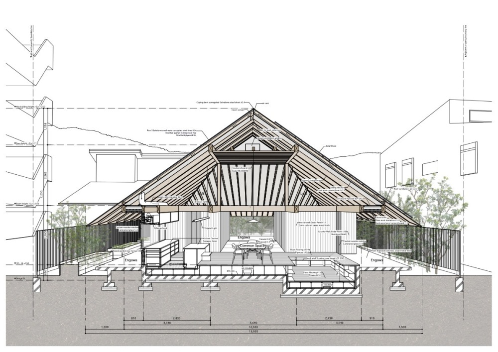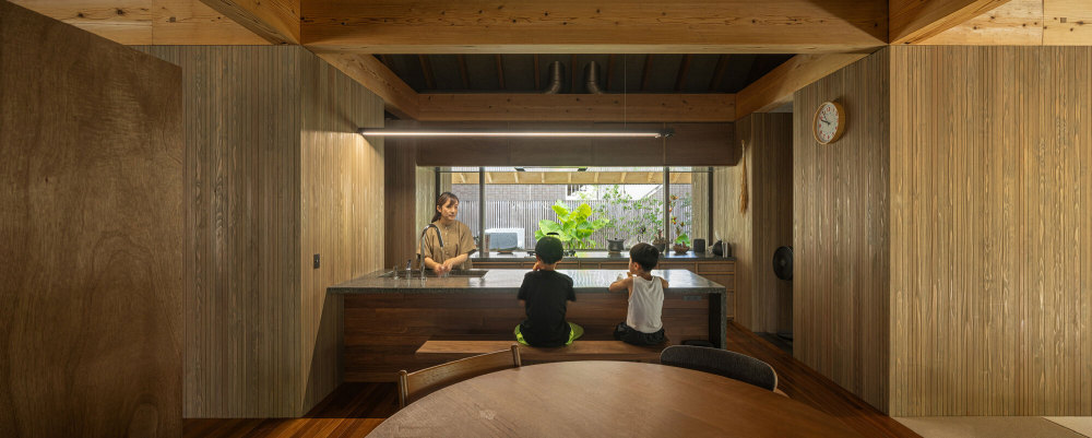 建筑结构参考了当地高架式粮仓 “高仓”(takakura)的设计,底部架空让风从各个方向自由穿过,有效缓解了亚热带气候的闷热感;屋顶则重新演绎了当地的波纹金属屋顶与入母屋造(歇山顶)造型,整合了保温、通风、控光多重功能,宽大的屋檐既能遮挡强烈日照,又能应对突如其来的热带暴雨。每一处空间设计都不是对传统的生硬复刻,而是结合现代生活需求的创新诠释,让本土记忆在当代居住中焕发新生。