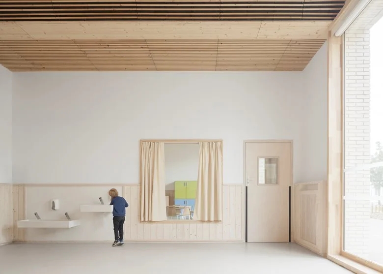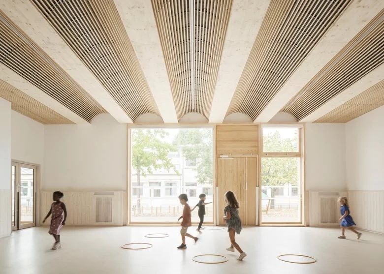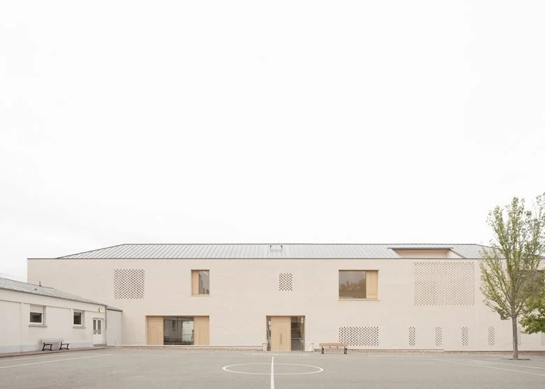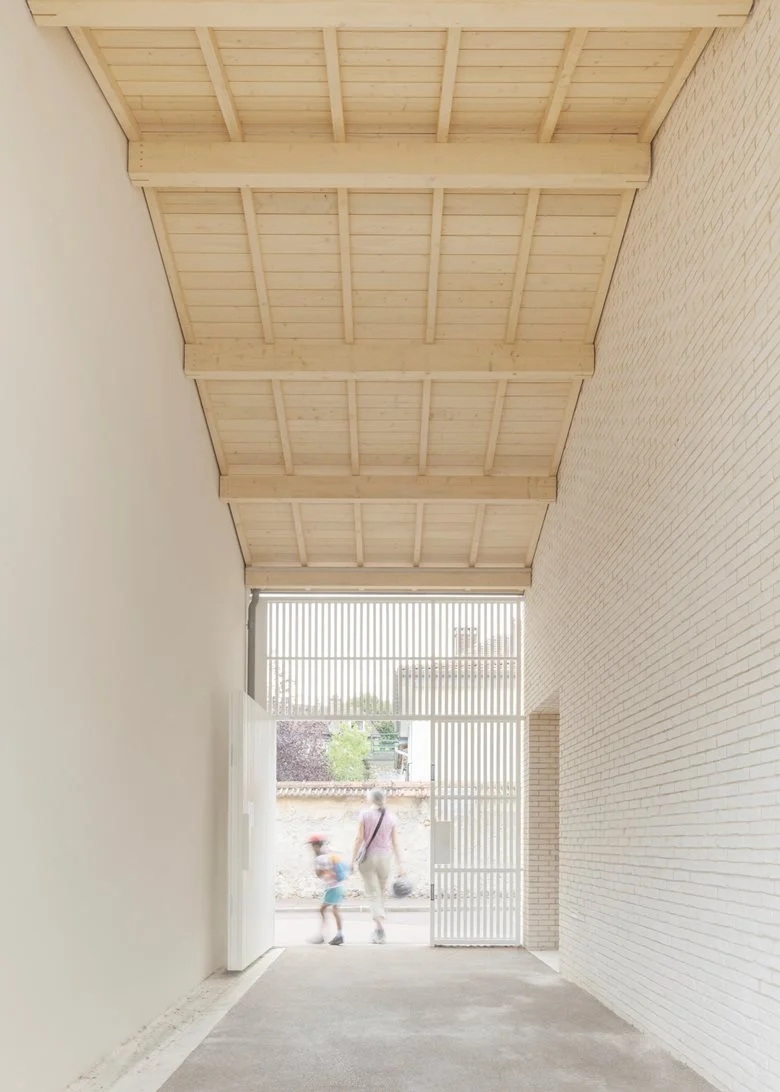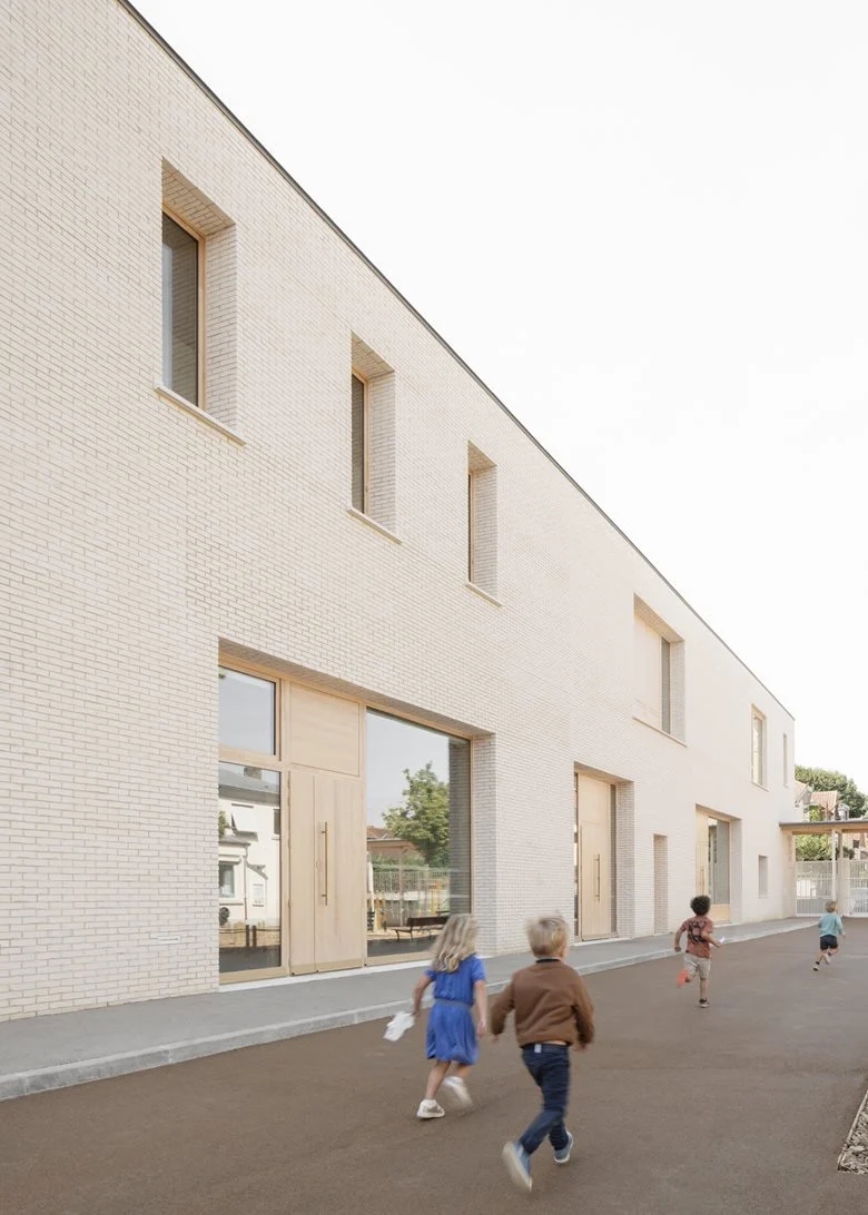 新建筑在城市尺度上并不显眼,但在城市街区尺度上却能被广泛感知。从附近的住宿区可以看到学校的和谐整体。该项目为重新设计通道(幼儿园和小学)提供了机会。新的庭院标志着幼儿园的入口,现在它是合格的,从街上很容易就能看到。