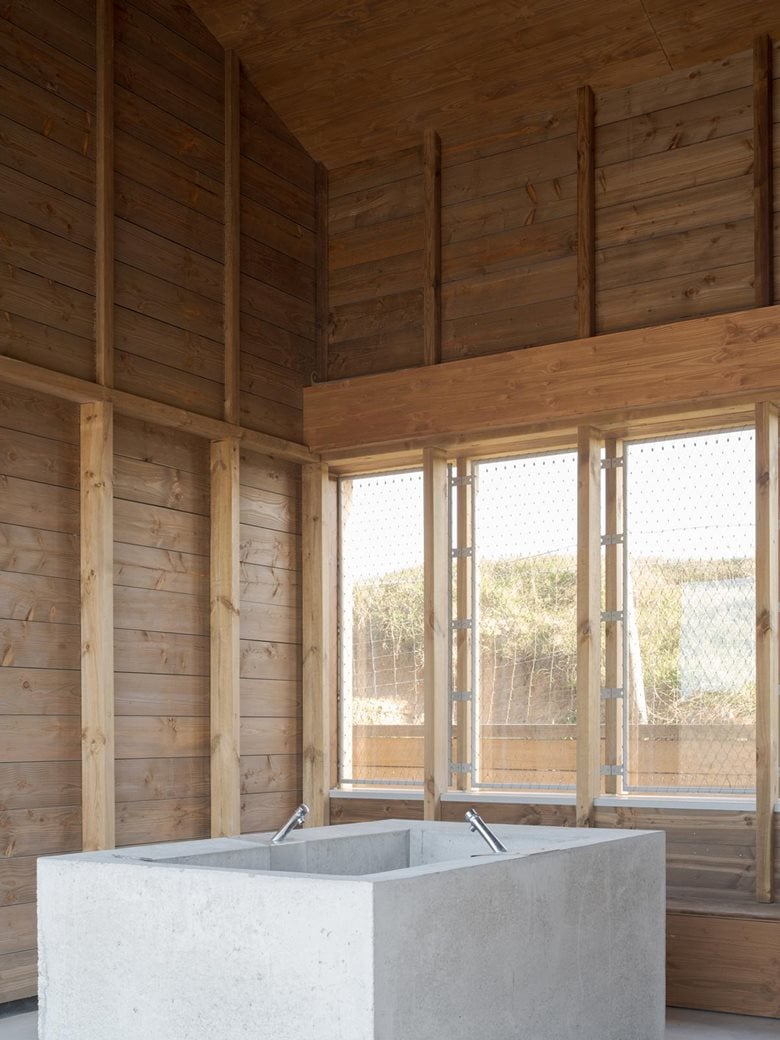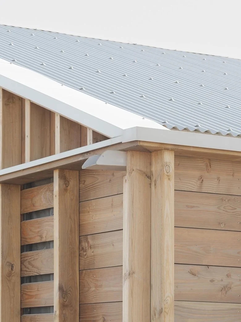 建筑位于海滩入口小径边缘,木质覆面的体量与地形轮廓呼应,采用单坡屋顶和纤细的轮廓,以最小化视觉冲击。覆面设计同步考虑了隐私、气流和维护需求:水平铺设的本地木材板材上叠加垂直板条,形成模块化的光线过滤、防风和自然通风系统 —— 尤其是在封闭的废弃物处理区。