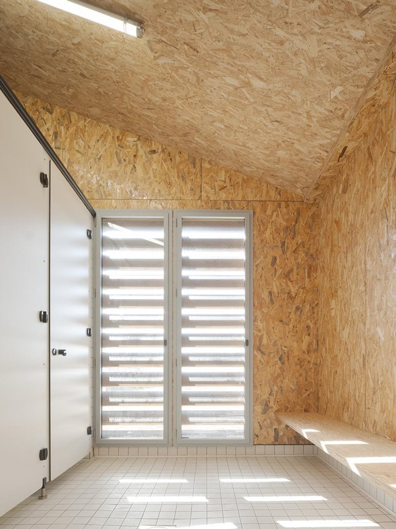 除瓷砖外,建筑结构和内部衬里全部采用法国本土木材,干装配接缝允许整体拆卸和重复利用。夏季运营期间,屋顶光伏板支持建筑离网供电。该 pavilion 造价 38.5 万欧元,占地 115 平方米,展示了小型市政基础设施如何在严苛的生态环境中实现功能适应性与环境责任的平衡。