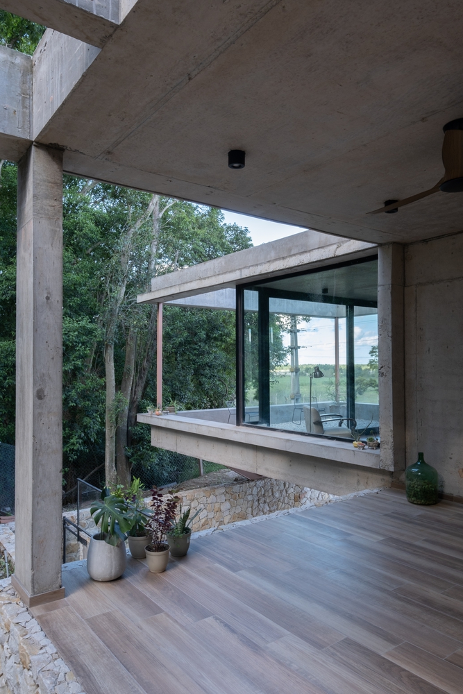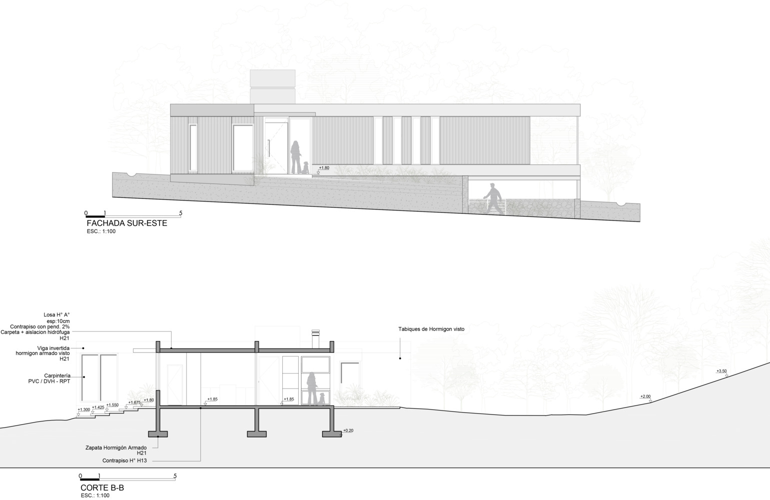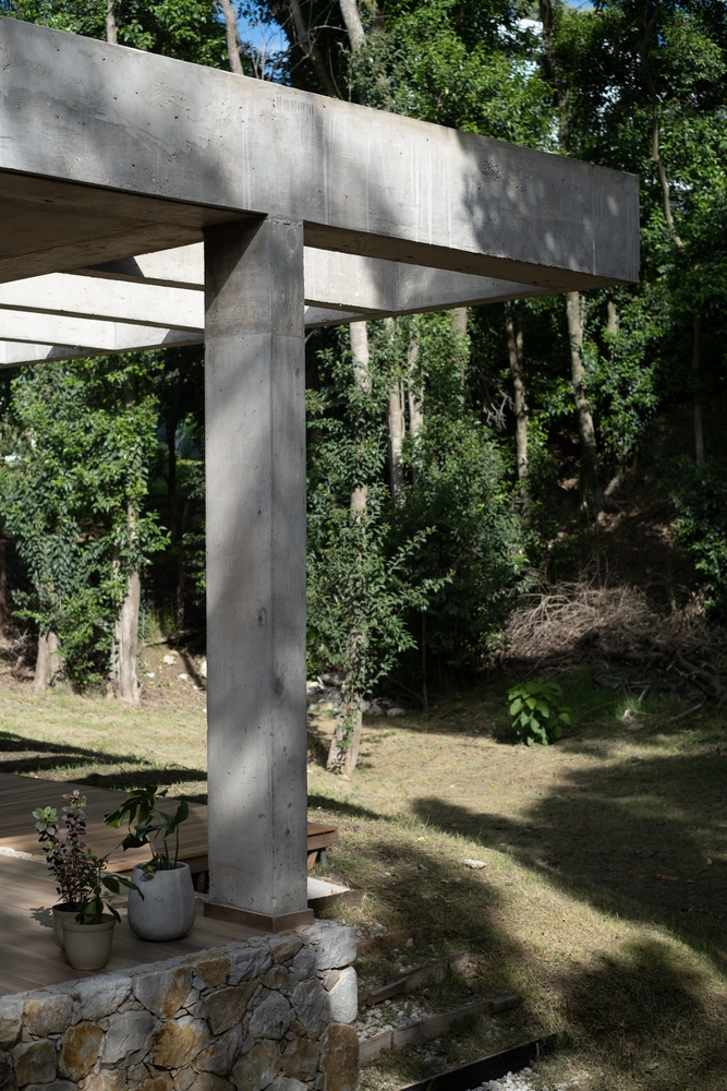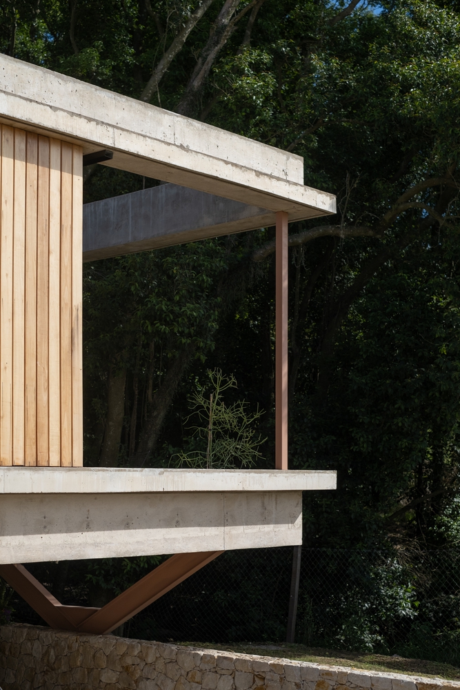 建筑结构方案通过两块混凝土板实现 —— 一块用作地面楼板,另一块用作屋顶盖板 —— 这一设计强化了建筑的水平感。建筑外立面以玻璃材质为主,确保室内与森林形成完整的视觉融合;而对于采光条件较差或需保障隐私的区域,则采用实木饰面砖墙进行封闭。在 ±0 标高以下的基础部分,墙面采用天然石材饰面,为整个建筑增添了厚重感与稳定感。