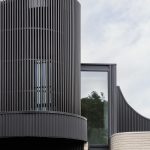 各层清水混凝土也是立面中一个引人注目的设计元素。层与层之间是高隔热材料的实心板,表面是青灰色的石膏,还有从地板到天花板的窗户元素。