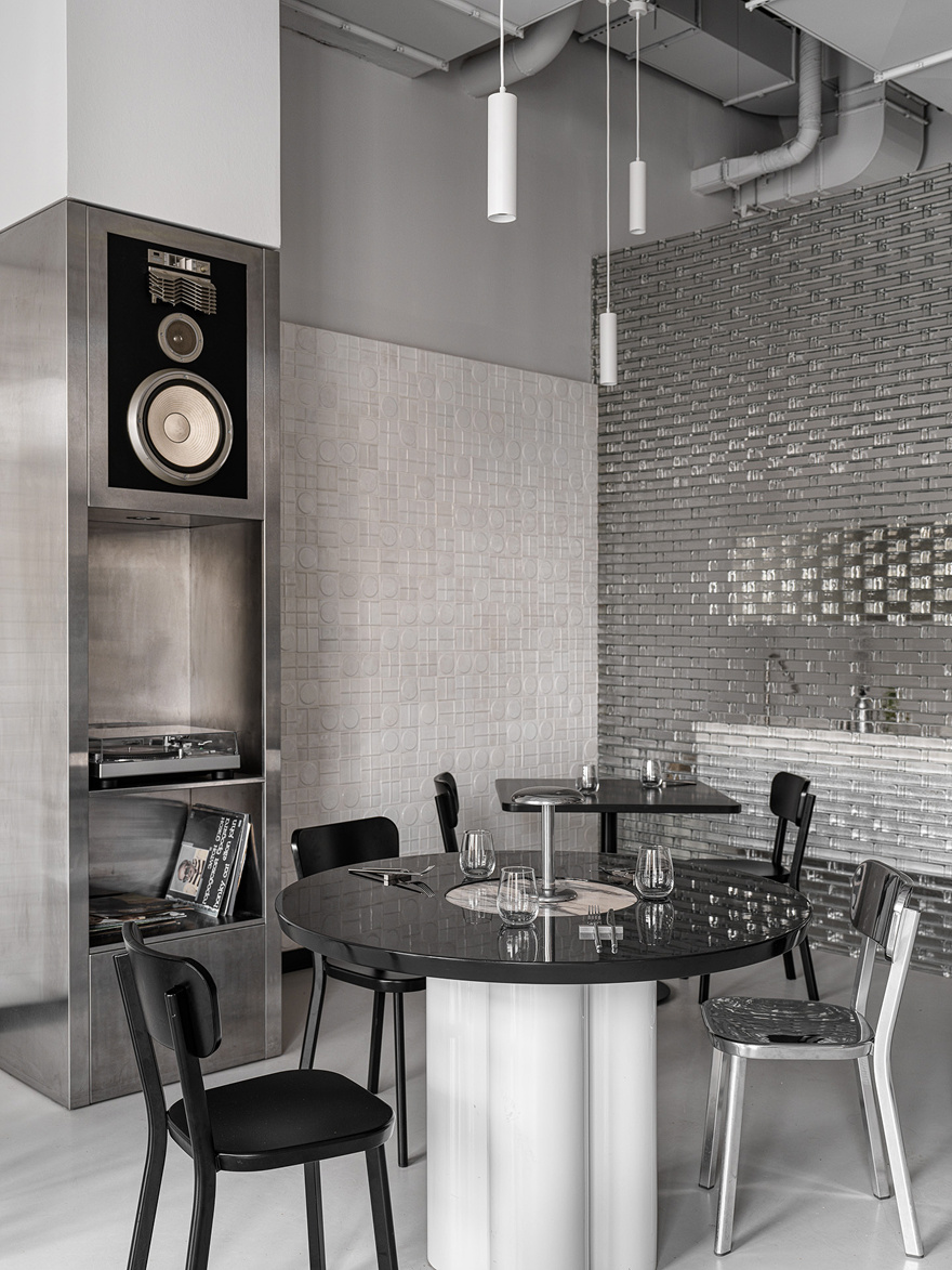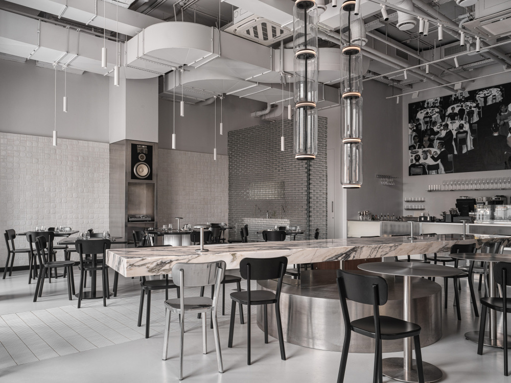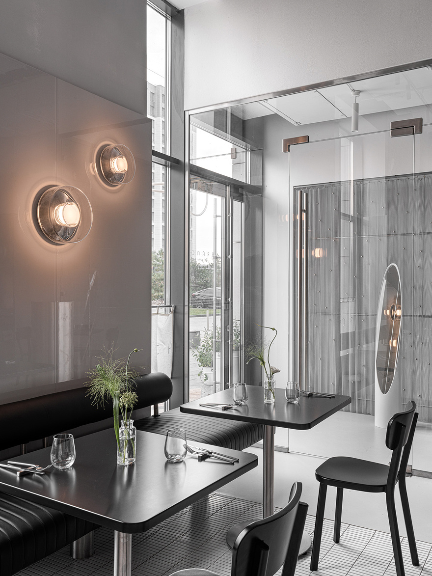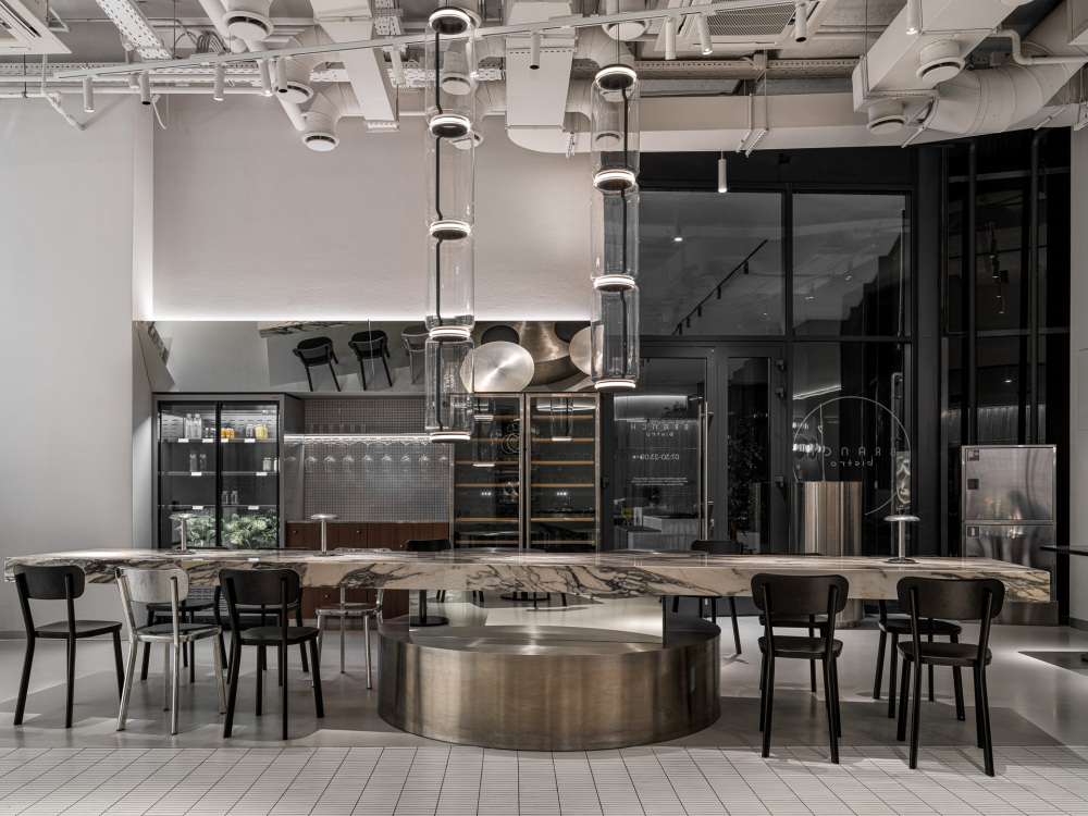 Branch 小酒馆的诞生,根植于喀山 Uno 社区的现代性基因。该社区由 Speech 建筑事务所操刀设计,其 “极简几何 + 功能优先” 的设计语言,为小酒馆的空间创作划定了 “现代主义” 的基调。设计师团队以 “材质的冲突与共生” 为破局点,在 200 平方米的紧凑空间中,植入不锈钢、大理石、玻璃砖等 “强个性材质”,让小酒馆既与社区的现代气质对话,又以自身的材质张力成为街区的视觉焦点。