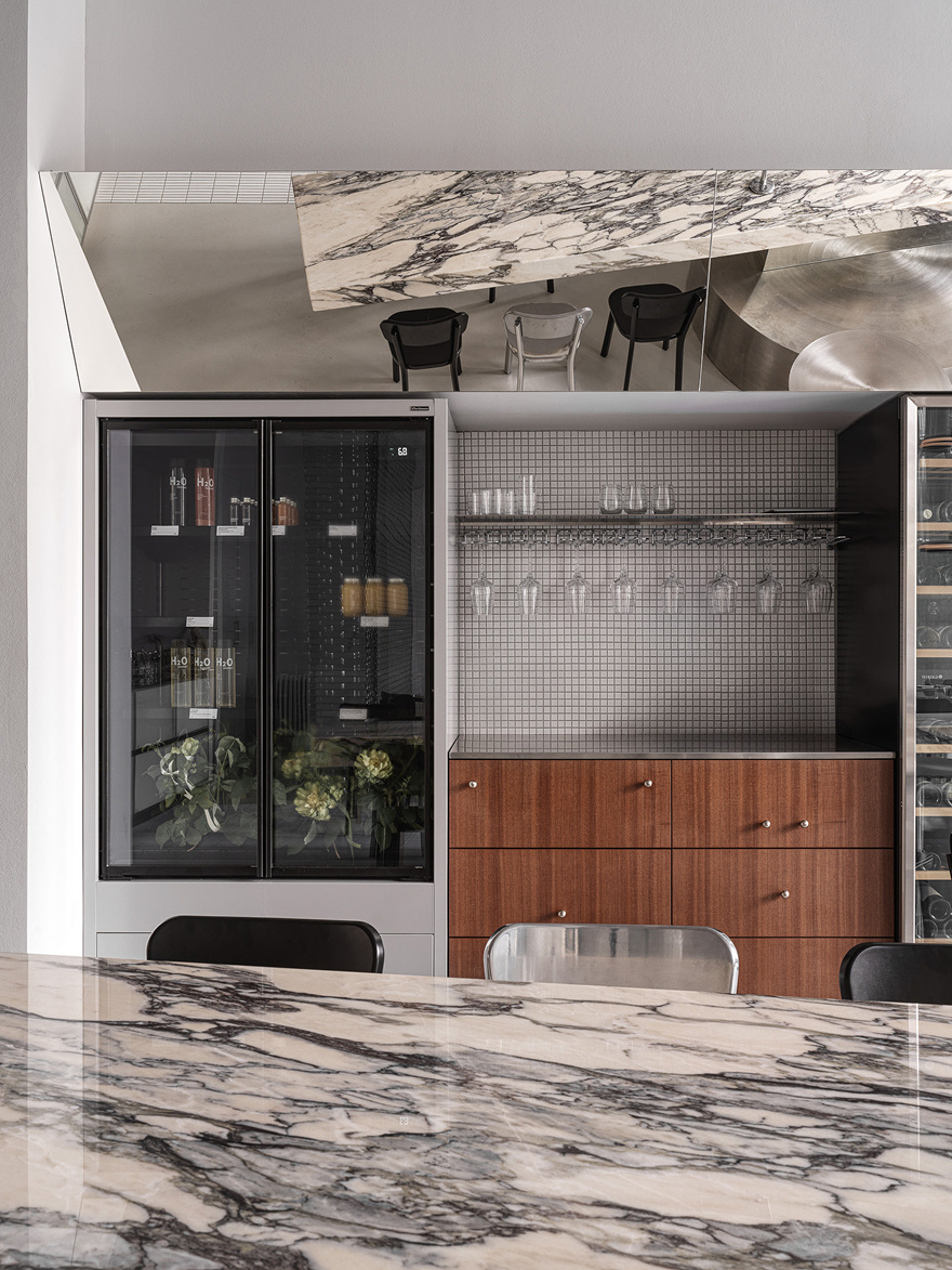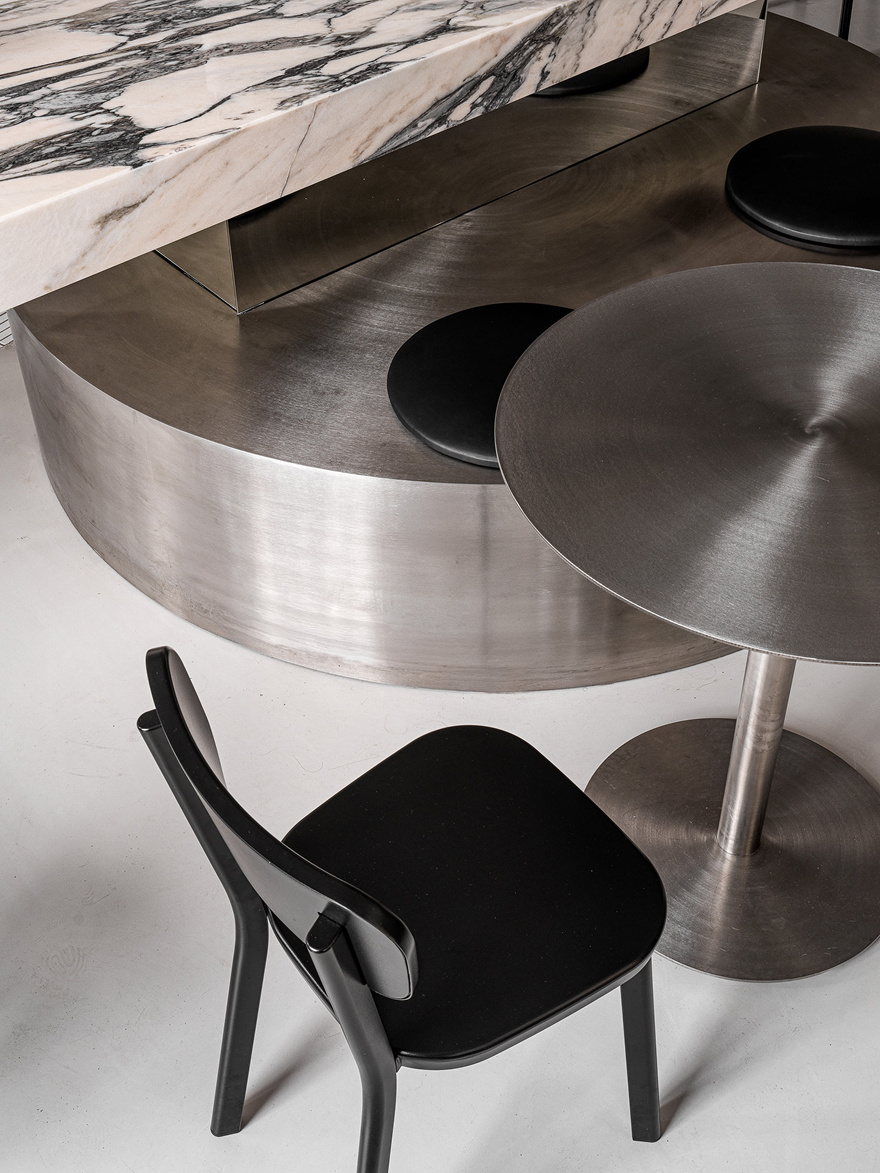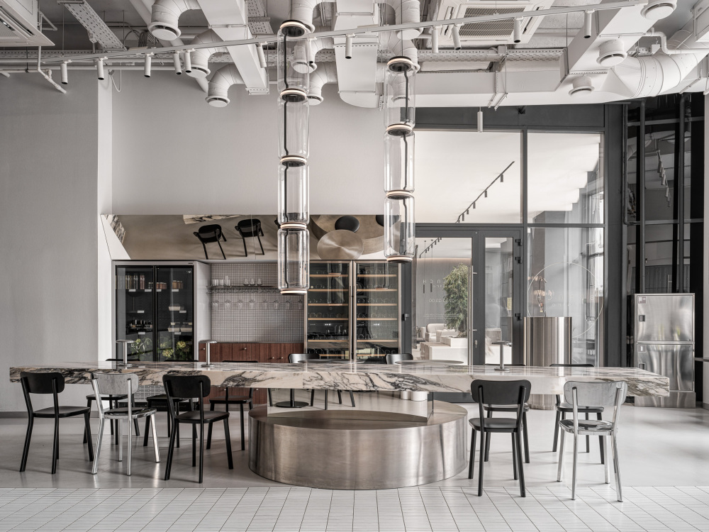 Branch 小酒馆的诞生,根植于喀山 Uno 社区的现代性基因。该社区由 Speech 建筑事务所操刀设计,其 “极简几何 + 功能优先” 的设计语言,为小酒馆的空间创作划定了 “现代主义” 的基调。设计师团队以 “材质的冲突与共生” 为破局点,在 200 平方米的紧凑空间中,植入不锈钢、大理石、玻璃砖等 “强个性材质”,让小酒馆既与社区的现代气质对话,又以自身的材质张力成为街区的视觉焦点。
