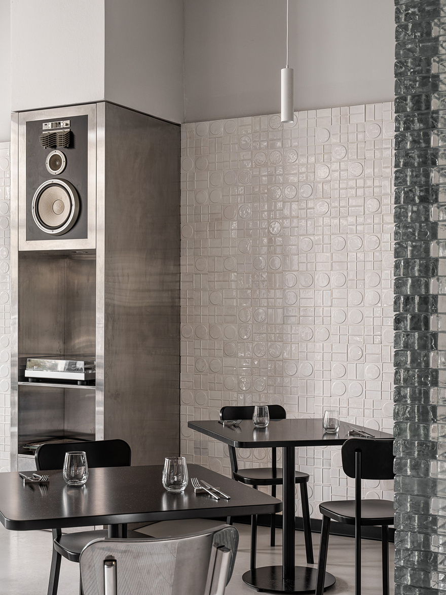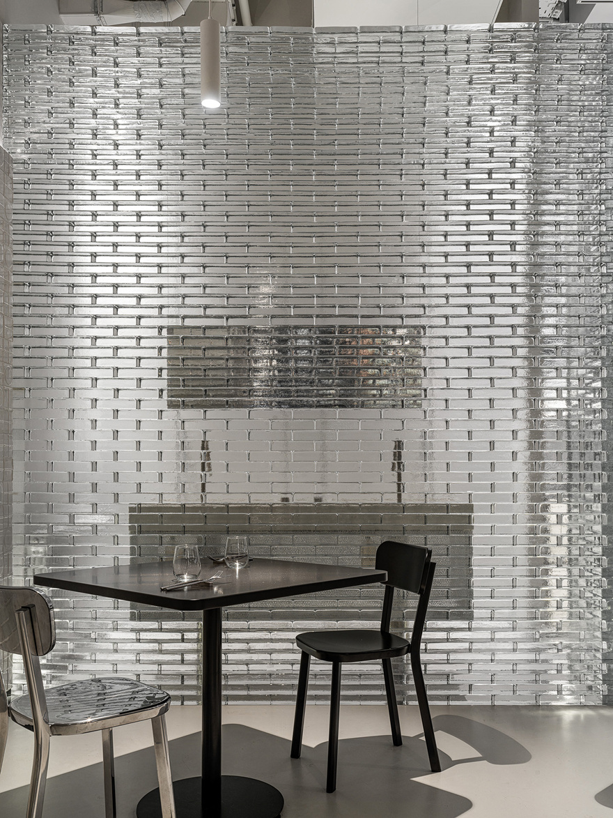 这种设计选择并非刻意的 “风格炫技”,而是对 “小酒馆功能本质” 的深度回应 —— 它需要 “吸引路人的视觉冲击力”,也需要 “留住客人的空间舒适度”,更需要 “承载酒饮文化的场景氛围感”。材质的碰撞,正是实现这三重需求的最优解。入口区域的玻璃砖墙面是空间的 “情绪锚点”。玻璃砖的半透明特性,既遮挡了室内的直接视线,保护了就餐的私密性,又能隐约透出室内的光影与人群,如同一层 “朦胧的滤镜”,激发着路人的探索欲。这种 “遮挡与显露” 的材质互动,让入口立面既具备商业空间的 “吸引力”,又暗含小酒馆的 “私密性”,为体验埋下了第一层伏笔。