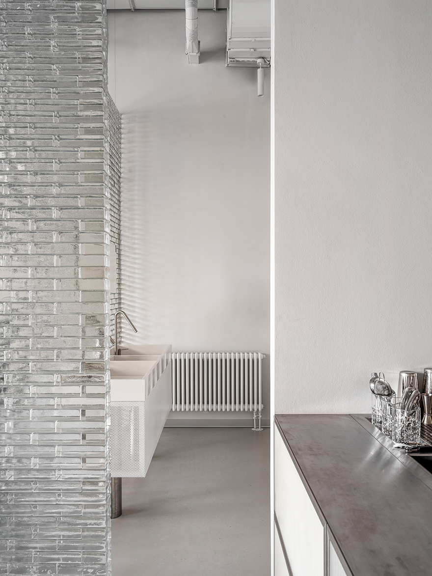 不锈钢的工业感:从吧台基座到音箱柜,再到天花板的管道暴露,不锈钢的冷硬与工业感,传递着 “现代都市的理性气质”,为小酒馆注入了 “克制的力量感”。大理石的奢华感:吧台的大理石台面,以天然纹理的不可复制性,诠释着 “酒饮文化的精致感”,其温润的质感与冰冷的不锈钢形成 “刚柔相济” 的平衡。玻璃砖的朦胧感:入口与隔断的玻璃砖,以半透明的特性模糊了 “内与外”“公共与私密” 的边界,为空间注入了 “诗意的朦胧感”,让材质的冲突在光影的柔化中达成和谐。这种哲学在细节中处处可见:卫生间的全玻璃砖墙面,将 “材质实验” 推向极致,让洗漱场景成为 “光影与材质的艺术装置”;天花板的管道与灯具的工业化暴露,与下方柔软的就餐区形成 “上下材质对话”,让空间的每一处都在诉说着 “冲突与和谐” 的材质故事。