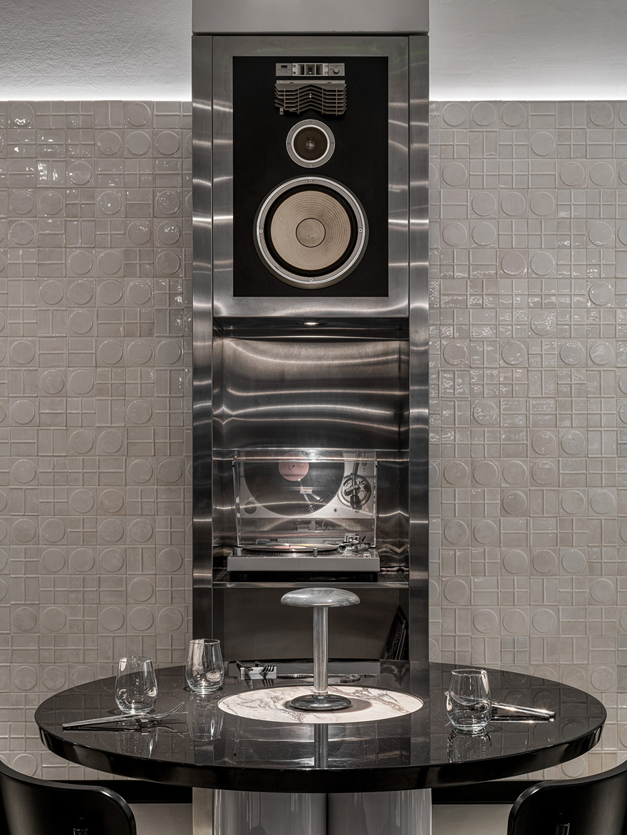就餐区的设计是 “材质温度感” 的集中表达。黑色金属餐桌的冷硬,与黑色皮革座椅的柔软形成 “触觉对比”;墙面不锈钢音箱柜的工业感,被圆形纹理瓷砖的 “手工质感” 中和;而玻璃砖隔断的朦胧光线,又为这组对比注入了 “柔和的过渡”。这种设计让就餐区在 “现代冷峻” 的整体基调中,保留了 “饮酒休憩” 所需的温暖与松弛。值得注意的是,墙面的黑白就餐场景壁画,以艺术的形式强化了 “材质叙事”—— 画中金属餐具的冷硬、织物桌布的柔软,与空间的材质选择形成 “虚实呼应”,让艺术成为材质语言的延伸。