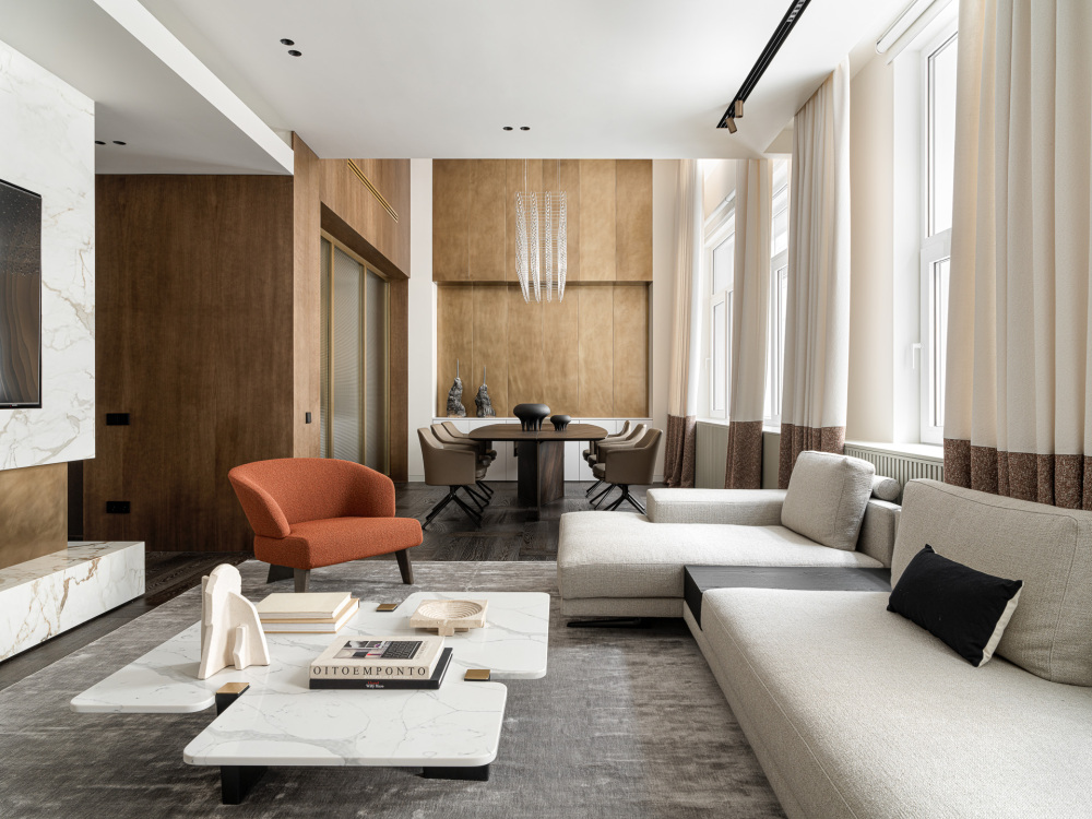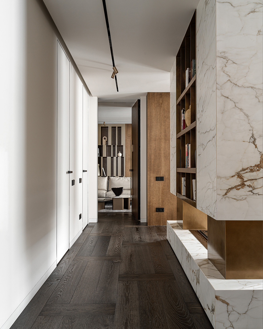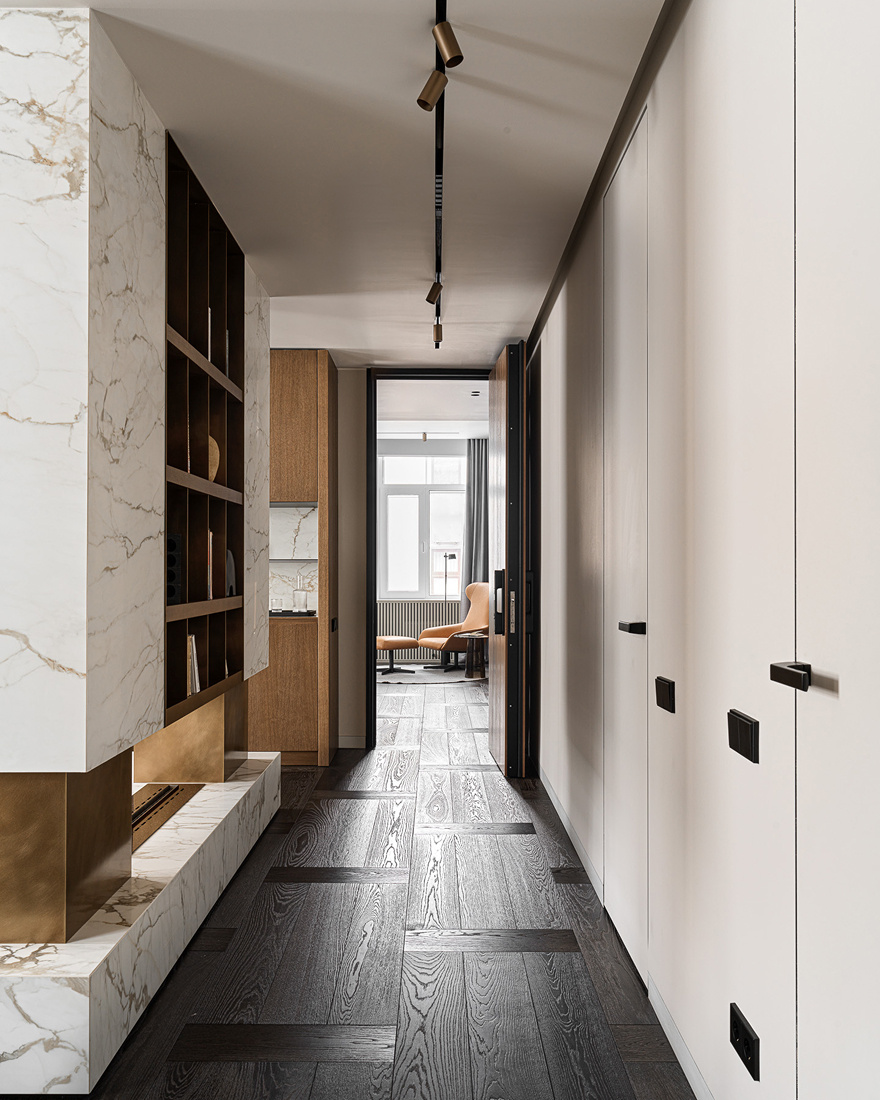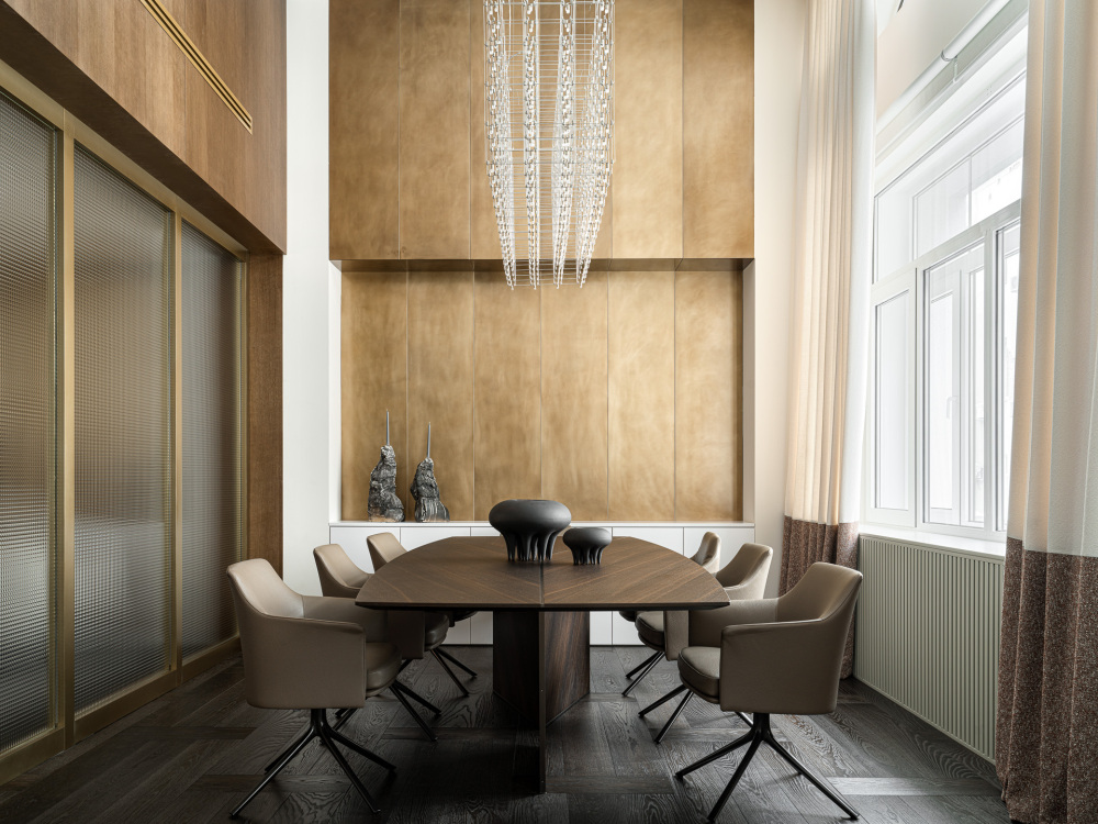 设计团队深度挖掘材质的 “原生性” 与 “表现力”,让每一种材质都成为空间专业气质的 “发声者”,并在碰撞中达成和谐:木材的温暖基底:以深棕与浅木色木材为主基调,从公共办公区的柜体到走廊的展示架,木材的天然纹理与温润质感,为空间奠定 “舒适、自然” 的基底。这种选择既传递出办公空间所需的稳重感,又以现代的加工工艺,让木材呈现出更简洁利落的形态,消解了传统木质空间可能带来的沉闷感;石材的轻奢点缀:大理石材质在空间中扮演 “轻奢点睛” 的角色 —— 会议室的墙面、休闲区的台面,都选用带有自然纹理的大理石。石材的冷冽光泽与木材的温暖形成质感反差,却又在色调的统一(如大理石的暖调纹理与木色呼应)下,达成 “冲突中的和谐”,为空间注入精致感与专业度;金属的现代锐度:不锈钢、黄铜等金属元素,以灯具、柜体边框、五金件等形式出现。金属的冷硬与光泽,为空间增添了现代设计的锐度,与木材、石材的柔和形成对比,让空间在 “雅致” 中不失 “利落”,契合都市办公快节奏与高要求的氛围。