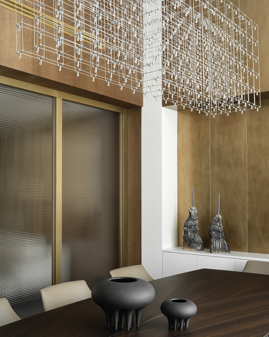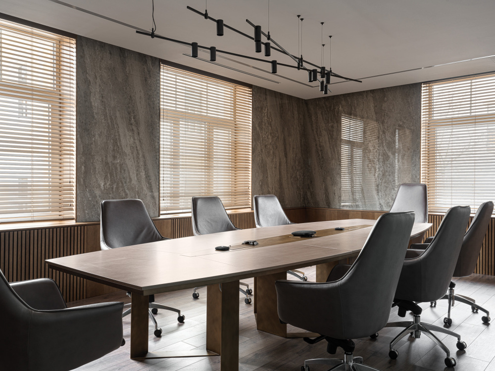 除了宏观的材质与空间设计,细节处的光影运用与软装搭配,为空间注入了 “灵动与个性”,让办公体验从 “实用” 升维至 “艺术感知”:自然光的利用上,大窗户搭配半透窗帘,让光线 “柔和渗透”,在木材与石材表面形成细腻的光影斑驳,随着时间推移,空间仿佛拥有了 “呼吸感”,为办公者营造出舒适的视觉环境;人工照明则以 “分层照明” 为原则,轨道灯、落地灯、台灯等各司其职 —— 轨道灯提供基础照明,落地灯与台灯则营造局部氛围,让空间在不同时段、不同办公场景下,都能呈现出适配的光影效果,如夜晚会议室的吊灯,能营造出 “专注会议” 的氛围,独立办公区的台灯则能满足 “深度工作” 的光线需求。软装选择强调 “简约而不简单”,从开放办公区的艺术摆件,到会议室的装饰画,都以简洁的造型与和谐的色彩,呼应整体设计调性。如开放办公区展示架上的陶瓷摆件,与大理石的纹理形成形态与质感的呼应;会议室的抽象装饰画,以简洁的线条与色调,为严肃的会议空间增添艺术灵动感。这些软装并非 “多余的装饰”,而是空间叙事的 “补充章节”,让办公者能在细节中感受到设计的用心与办公环境的质感。
