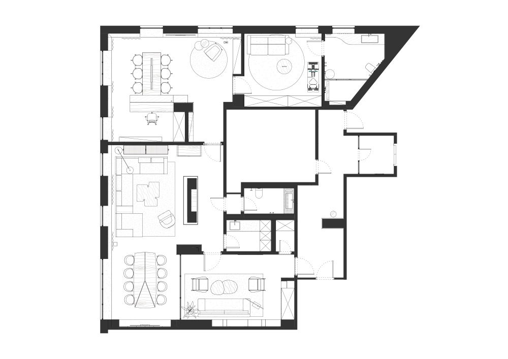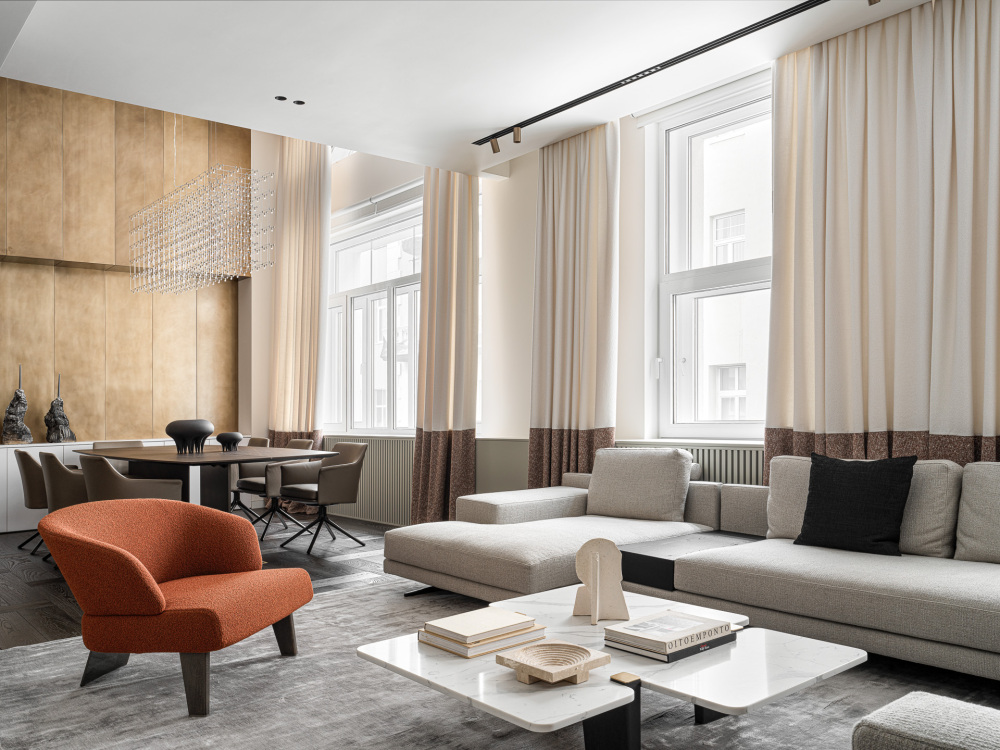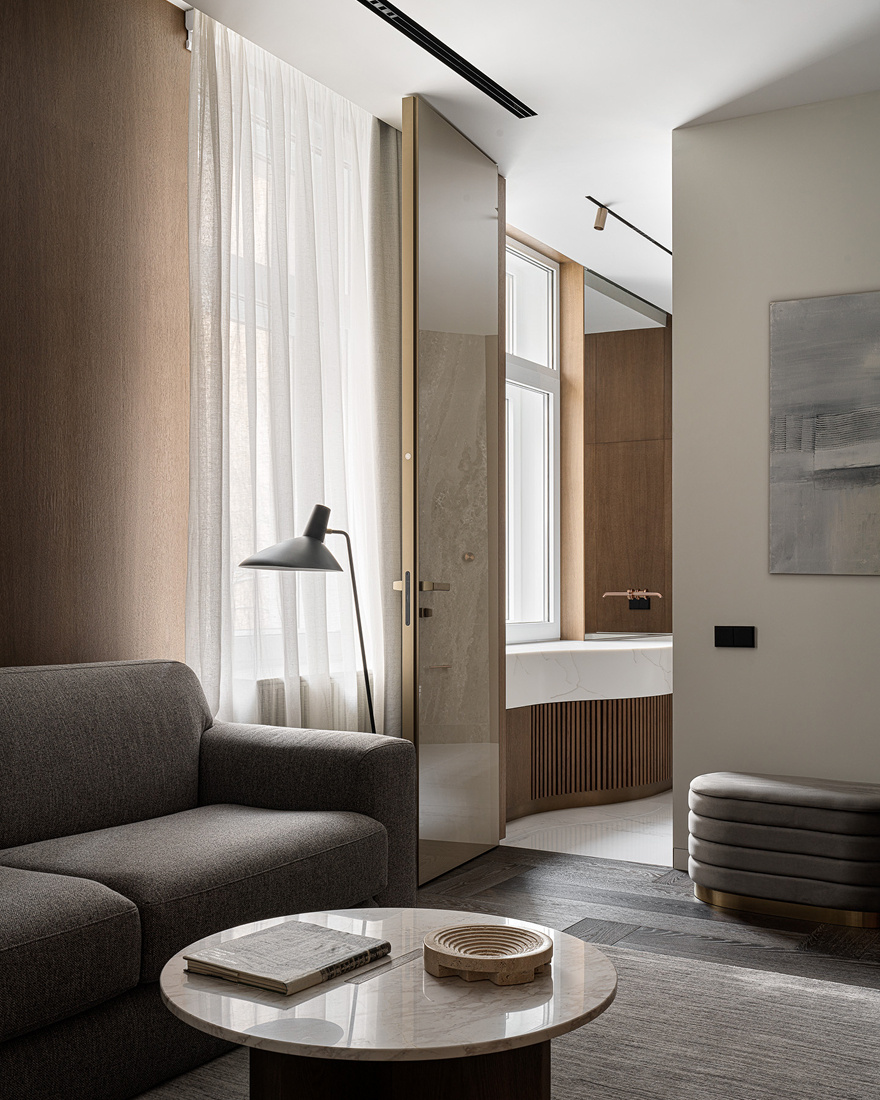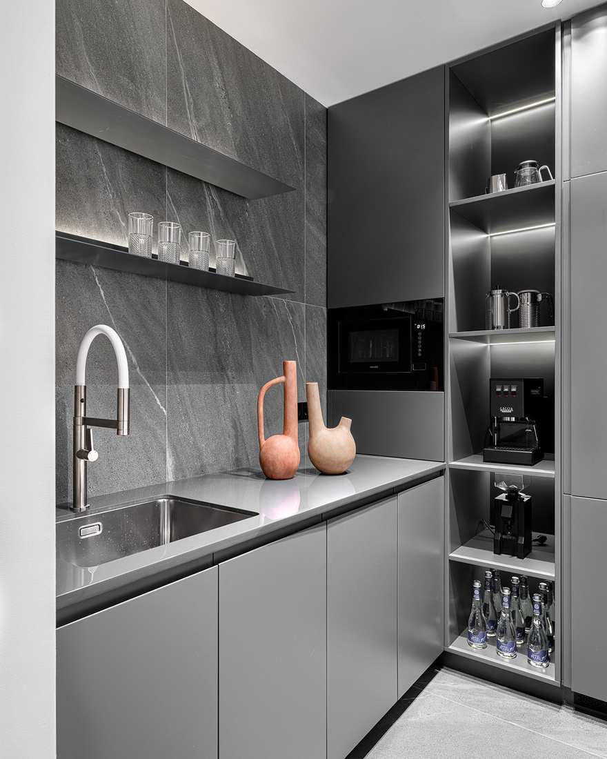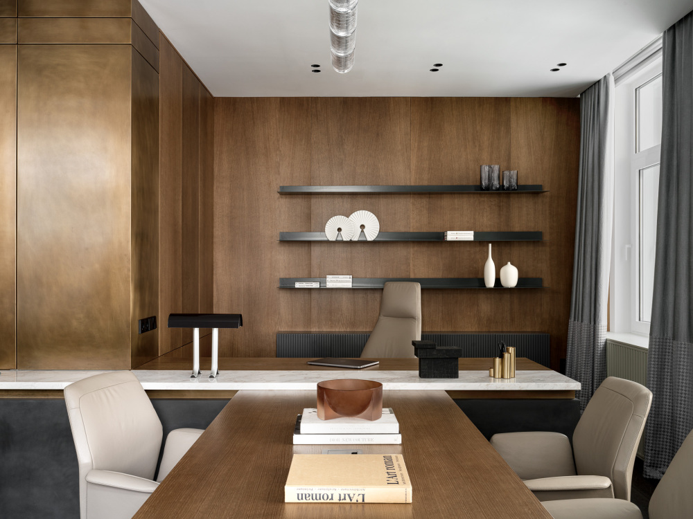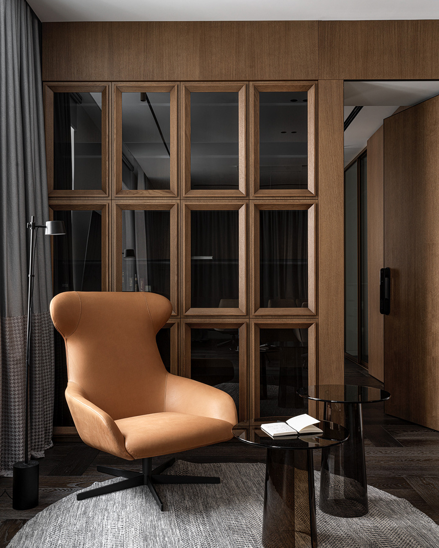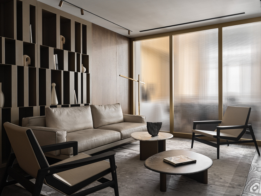 设计的最终目标,是实现 “功能实用性” 与 “美学艺术性” 的精准平衡:收纳系统的 “隐形整合”:从开放办公区的嵌入式展示架,到走廊的书架,再到独立办公区的隐藏式储物柜,收纳功能被 “隐形” 整合于空间设计中,既满足了办公所需的大量资料与物品收纳需求,又避免了大量储物家具对空间美学的破坏,让办公空间始终保持整洁与通透;场景适配的 “功能弹性”:公共区域的沙发、座椅等家具,选择 “舒适与造型兼具” 的款式,既适合日常办公交流,也能承载小型团队讨论的需求;私密区域的会议桌椅、办公座椅等,则更注重 “专业与舒适”,为会议与深度工作提供专属的高效感。该办公空间设计,以材质的和谐对话、空间的层次叙事、细节的氛围赋能,以及功能与美学的平衡,证明了办公空间可以不再是 “单纯的工作容器”,而能成为 “承载高效办公与艺术感知” 的独特场域。它为现代都市办公设计提供了一种思路:在满足办公功能需求的基础上,通过现代设计语言的运用,打造出既具功能性,又能传递专业情感与美学价值的办公空间。
