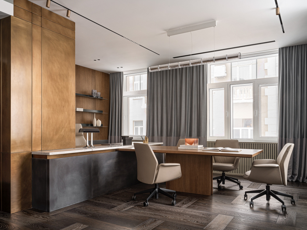 在城市办公空间设计的潮流中,该案例以 “材质的细腻碰撞” 与 “空间的层次叙事” 为核心,突破传统办公空间的刻板印象。通过对木材、石材、金属等材质的精妙运用,以及公共与私密办公区域的巧思布局,既呼应了办公空间对 “专业质感” 的追求,又融入现代设计的简约与灵动,最终塑造出兼具功能性与艺术感的高效雅致办公场域,为都市办公设计提供了 “实用与美学共生” 的创新样本。