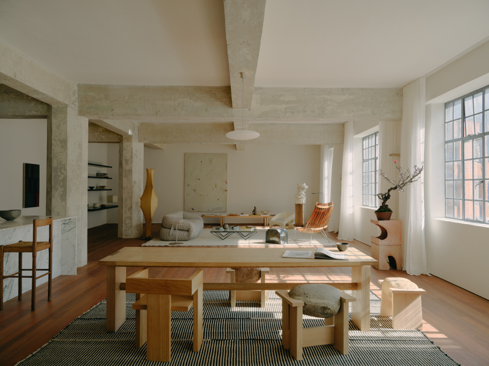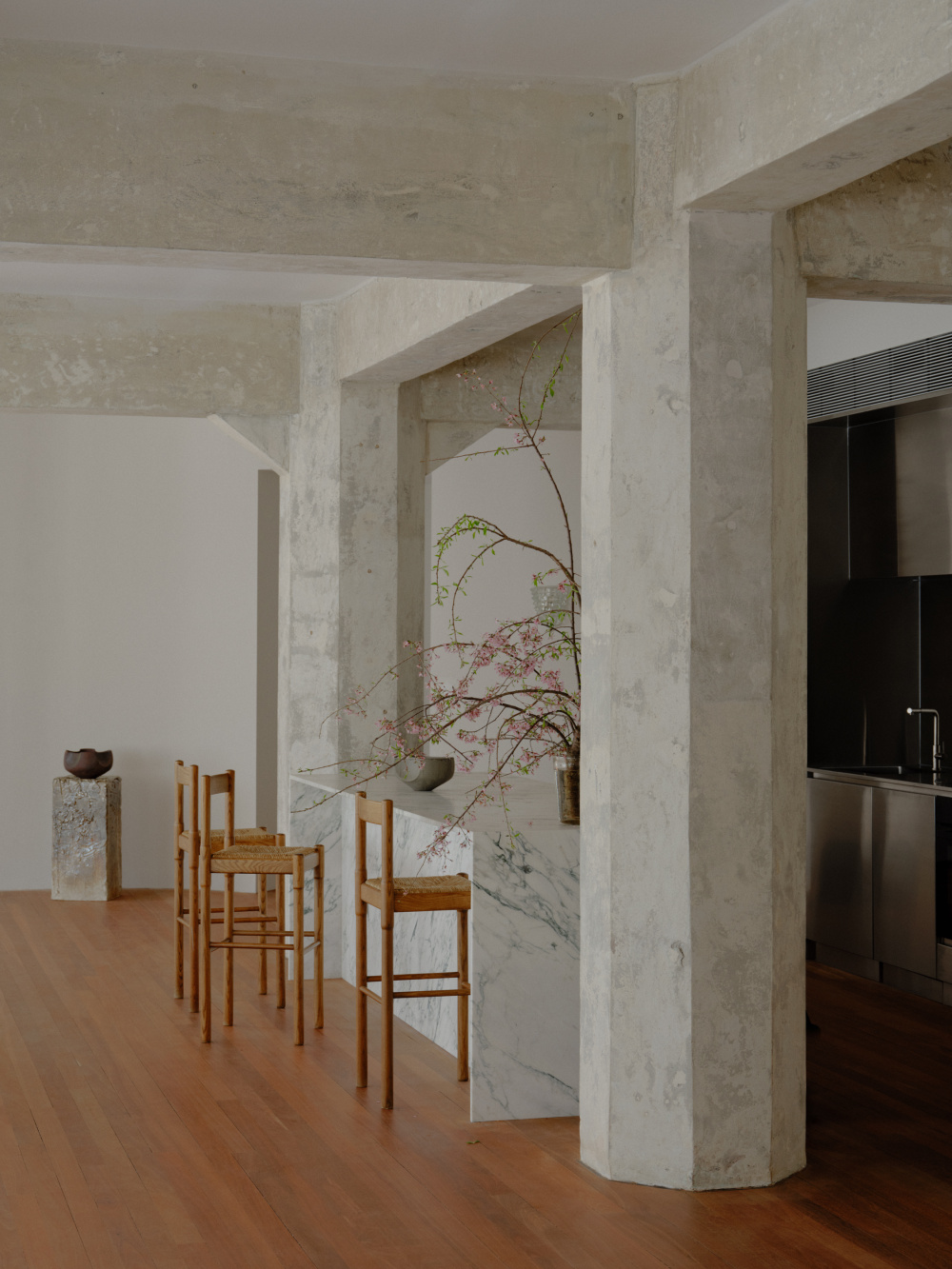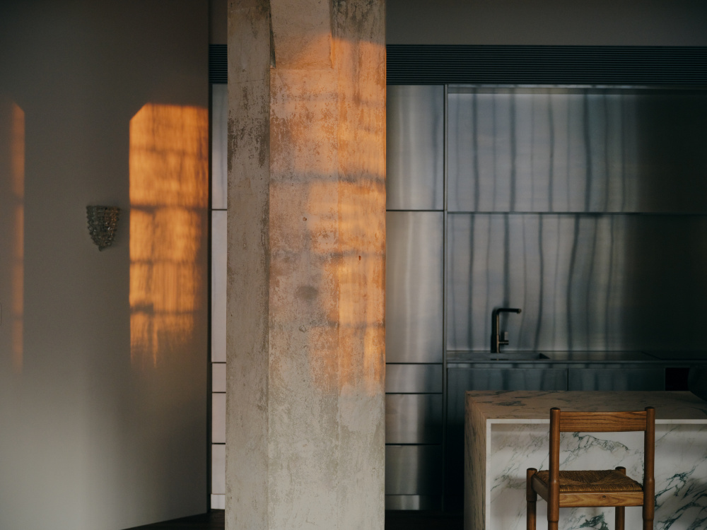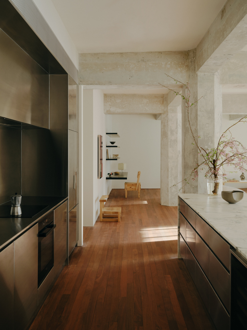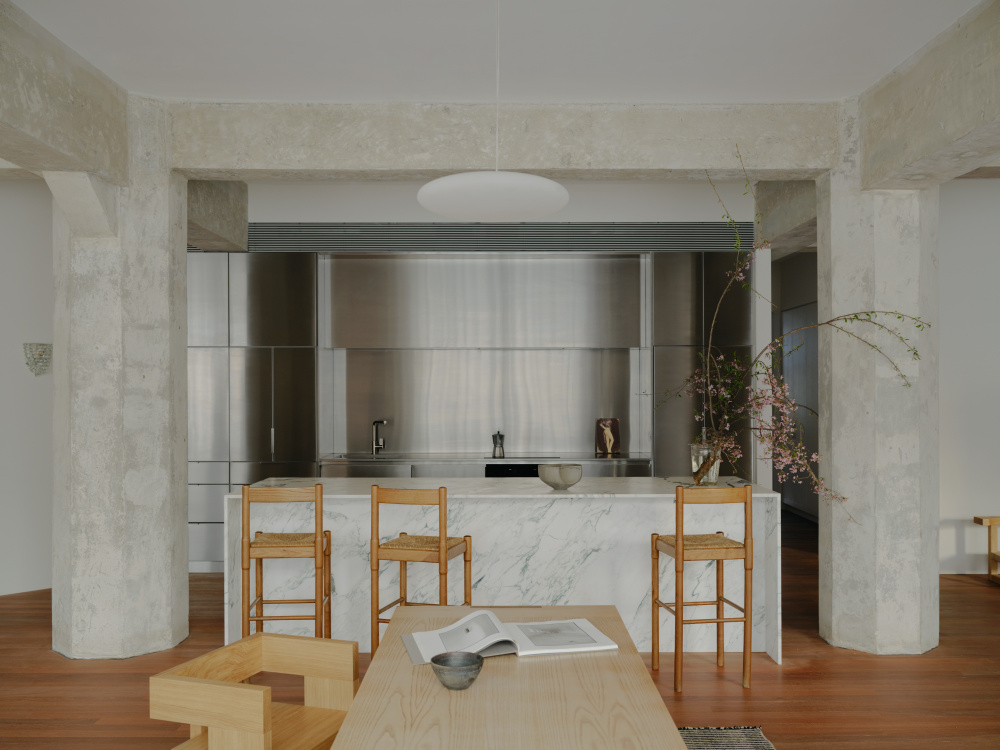 借鉴唐纳德・贾德 “春街 101 号” 的建筑清晰度,空间以简洁的线条、规整的布局为基础,摒弃多余装饰,仅通过材质与光影传递美学。例如,隐藏式旋转门与弧形墙面的加入,既柔化了工业风的硬朗线条,又不破坏原始网格的规整感,让 “极简” 不再是生硬的几何堆砌,而是充满流动感的空间叙事。京都传统旅馆(ryokan)的静谧特质贯穿空间,体现在对 “不完美” 的接纳与 “质朴感” 的追求中。百年木地板的自然磨损、混凝土柱的细微裂缝,都被视为 “时光的馈赠”;简约的家具造型、柔和的色彩搭配,共同营造出 “宁静而不沉寂” 的氛围,让居住者在空间中能卸下外界纷扰,进入自省状态。厨房墙面采用不锈钢材质铺贴,直接致敬盖・奥兰蒂设计的普奇宫(Palazzo Pucci),金属的冷冽质感与旧仓库的工业基因形成呼应,同时以现代工艺的精准度,让 “复古元素” 焕发当代活力。这种对经典设计的 “致敬而非复刻”,让空间既有设计深度,又避免了风格的刻意模仿。