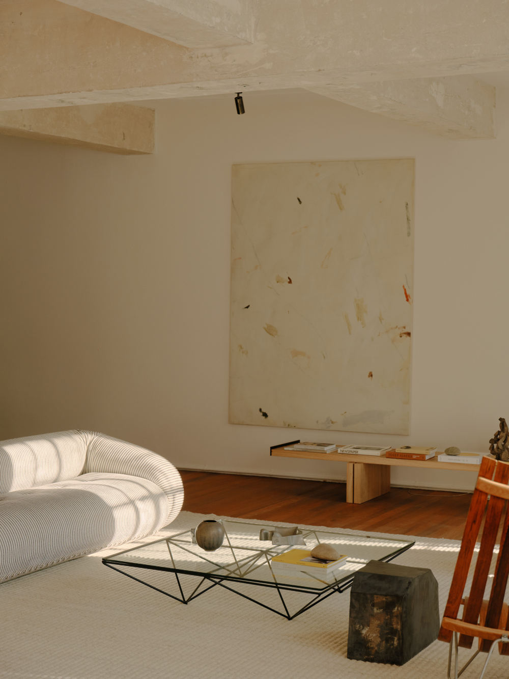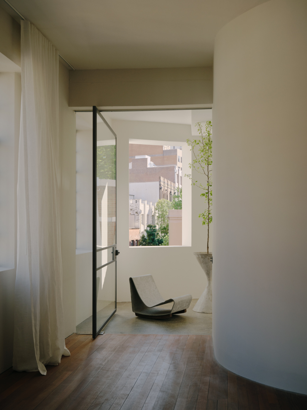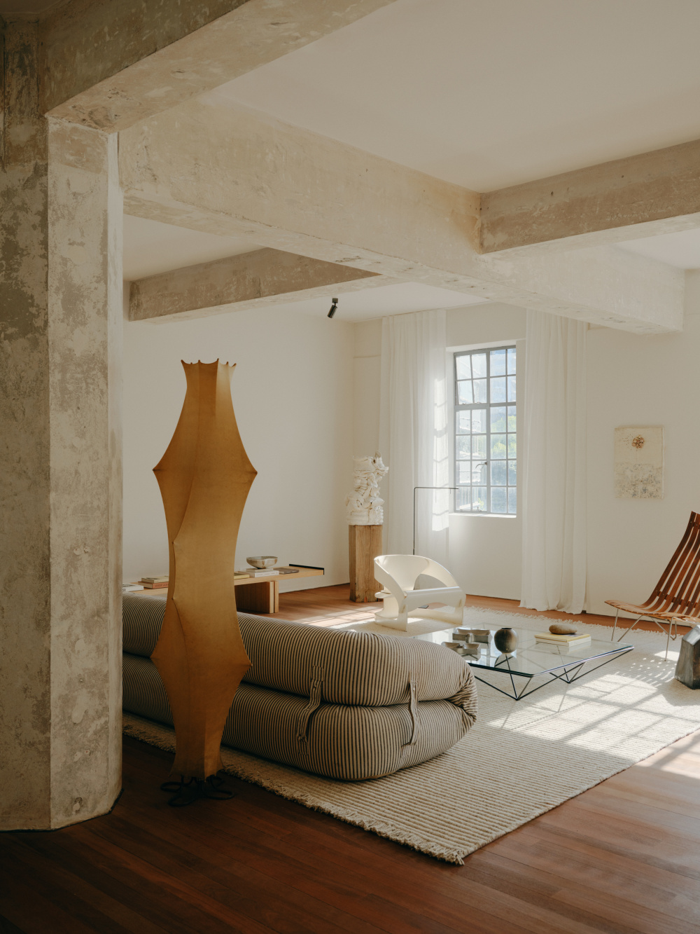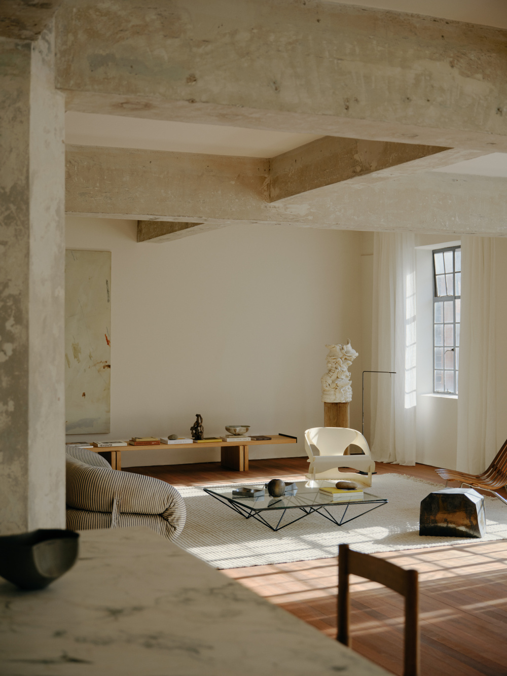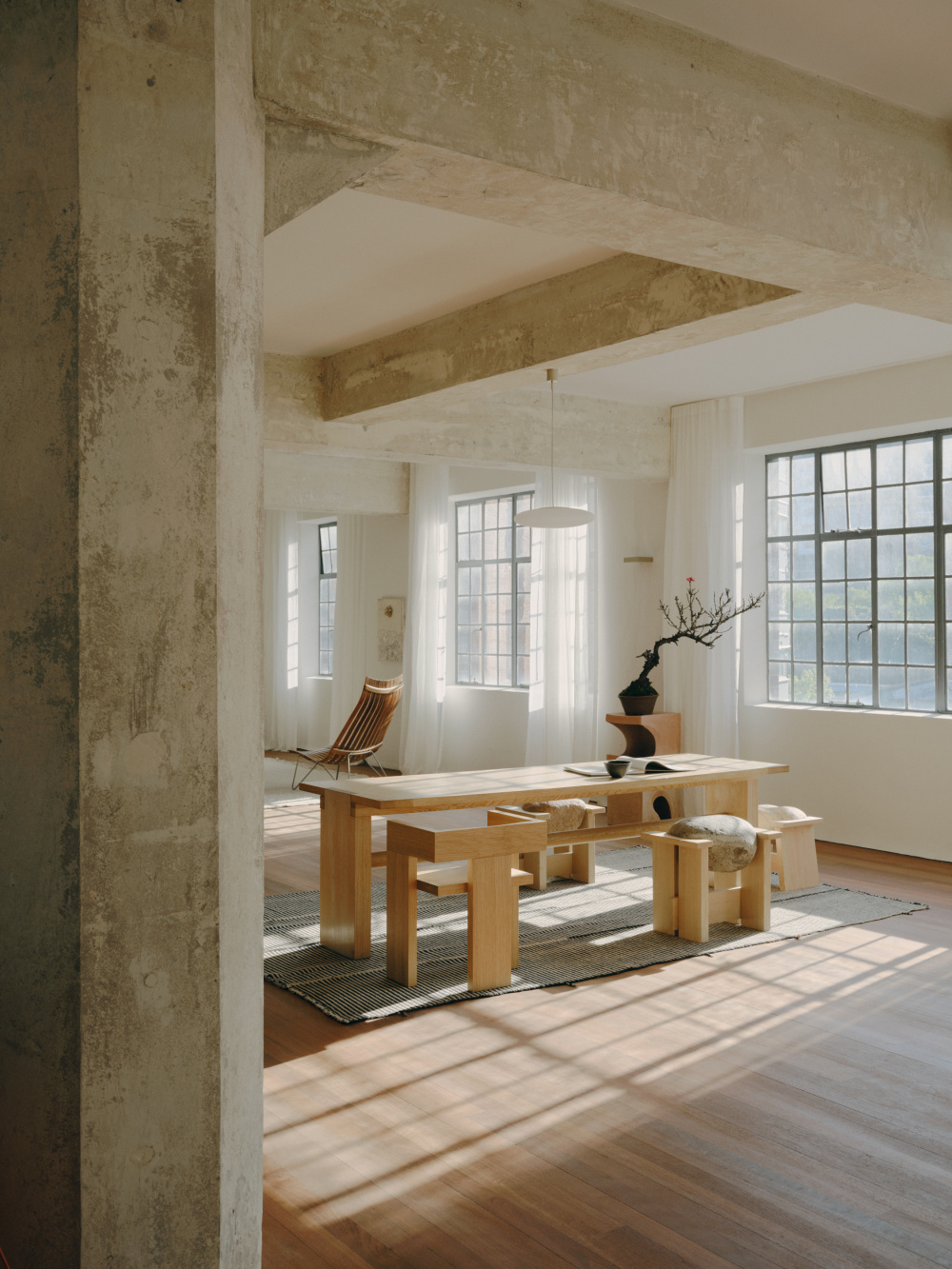 借鉴唐纳德・贾德 “春街 101 号” 的建筑清晰度,空间以简洁的线条、规整的布局为基础,摒弃多余装饰,仅通过材质与光影传递美学。例如,隐藏式旋转门与弧形墙面的加入,既柔化了工业风的硬朗线条,又不破坏原始网格的规整感,让 “极简” 不再是生硬的几何堆砌,而是充满流动感的空间叙事。京都传统旅馆(ryokan)的静谧特质贯穿空间,体现在对 “不完美” 的接纳与 “质朴感” 的追求中。百年木地板的自然磨损、混凝土柱的细微裂缝,都被视为 “时光的馈赠”;简约的家具造型、柔和的色彩搭配,共同营造出 “宁静而不沉寂” 的氛围,让居住者在空间中能卸下外界纷扰,进入自省状态。厨房墙面采用不锈钢材质铺贴,直接致敬盖・奥兰蒂设计的普奇宫(Palazzo Pucci),金属的冷冽质感与旧仓库的工业基因形成呼应,同时以现代工艺的精准度,让 “复古元素” 焕发当代活力。这种对经典设计的 “致敬而非复刻”,让空间既有设计深度,又避免了风格的刻意模仿。