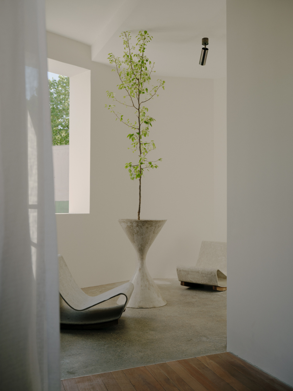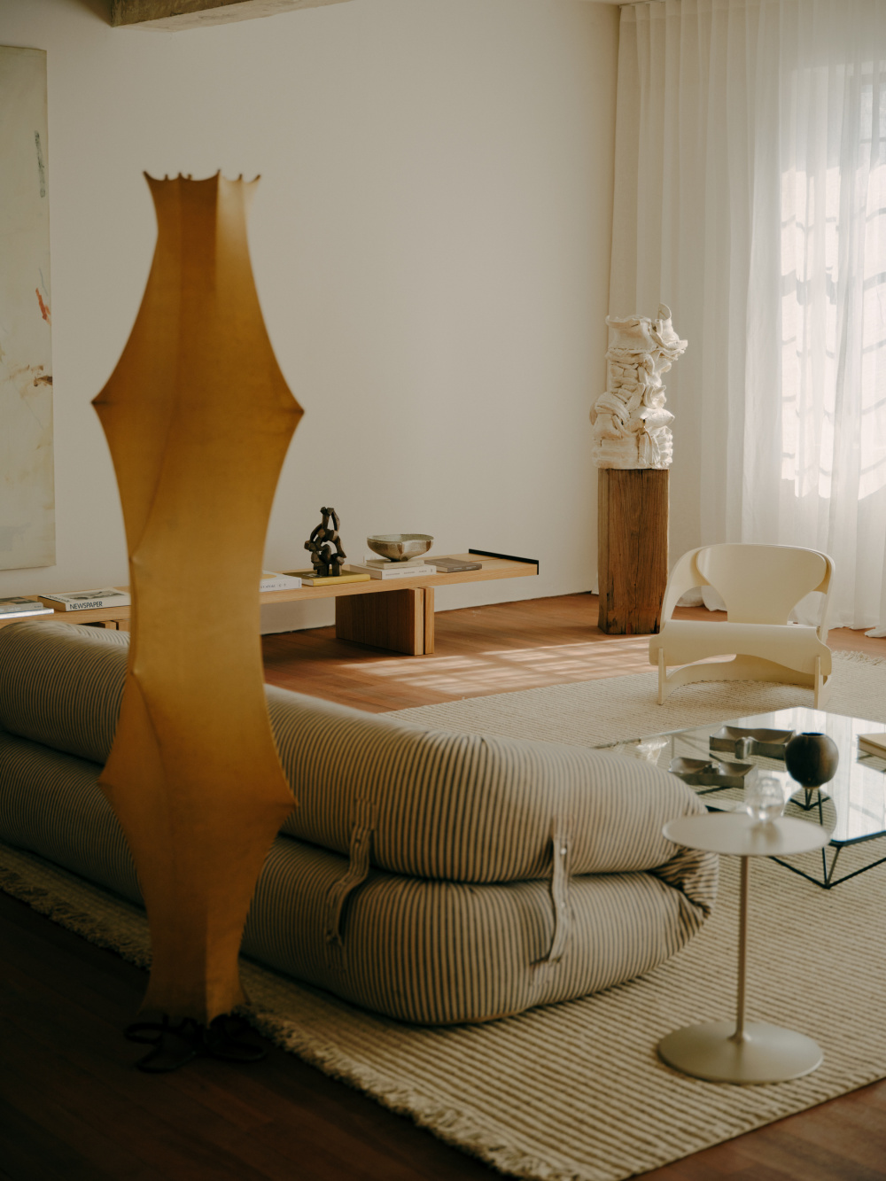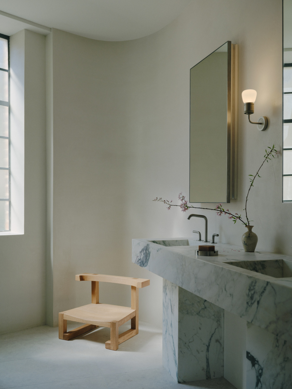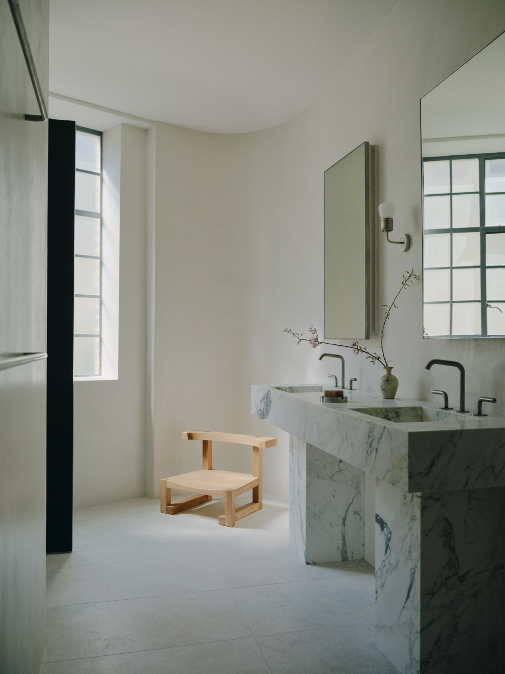 借鉴唐纳德・贾德 “春街 101 号” 的建筑清晰度,空间以简洁的线条、规整的布局为基础,摒弃多余装饰,仅通过材质与光影传递美学。例如,隐藏式旋转门与弧形墙面的加入,既柔化了工业风的硬朗线条,又不破坏原始网格的规整感,让 “极简” 不再是生硬的几何堆砌,而是充满流动感的空间叙事。京都传统旅馆(ryokan)的静谧特质贯穿空间,体现在对 “不完美” 的接纳与 “质朴感” 的追求中。百年木地板的自然磨损、混凝土柱的细微裂缝,都被视为 “时光的馈赠”;简约的家具造型、柔和的色彩搭配,共同营造出 “宁静而不沉寂” 的氛围,让居住者在空间中能卸下外界纷扰,进入自省状态。厨房墙面采用不锈钢材质铺贴,直接致敬盖・奥兰蒂设计的普奇宫(Palazzo Pucci),金属的冷冽质感与旧仓库的工业基因形成呼应,同时以现代工艺的精准度,让 “复古元素” 焕发当代活力。这种对经典设计的 “致敬而非复刻”,让空间既有设计深度,又避免了风格的刻意模仿。