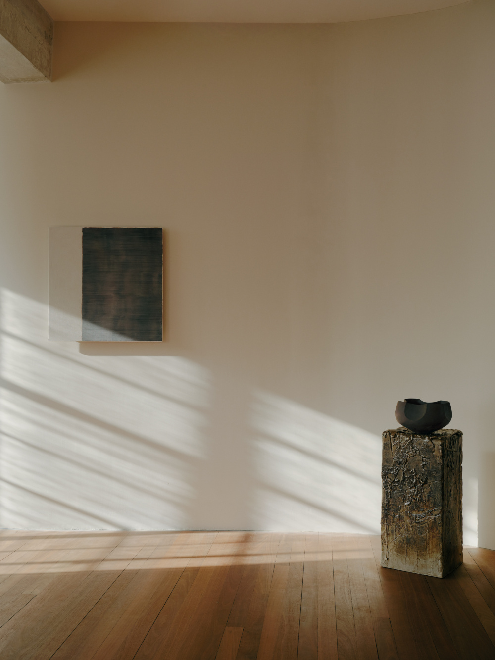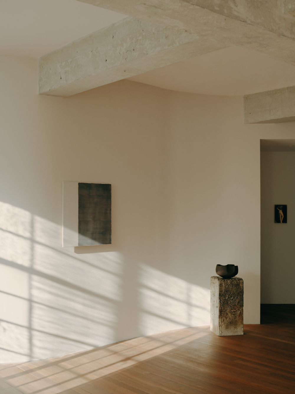 大理石、橡木与不锈钢三种核心材质在空间中和谐共存。大理石的细腻质感(如中岛、洗手台)传递精致感,橡木的温暖纹理(如地板、家具)注入自然温度,不锈钢的冷冽光泽(如厨房墙面)呼应工业基因。三种材质的碰撞与平衡,让空间在 “冷与暖”“粗与细” 的对比中,呈现出丰富的质感层次,避免了极简设计的单调。住宅内陈列的吉迪恩・鲁宾(Gideon Rubin)、劳伦斯・卡罗尔(Lawrence Carroll)等艺术家的作品,并非单纯的装饰,而是 “自省氛围” 的催化剂。艺术品的抽象表达、柔和色调,与空间的极简风格、侘寂气质高度契合,让居住者在欣赏艺术的过程中,引发思考与共鸣,进一步强化了 “空间即自省载体” 的设计理念。