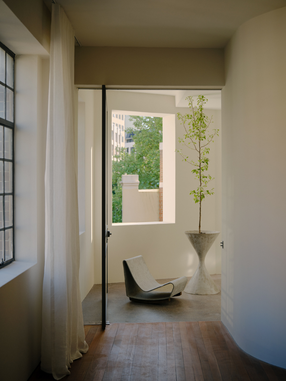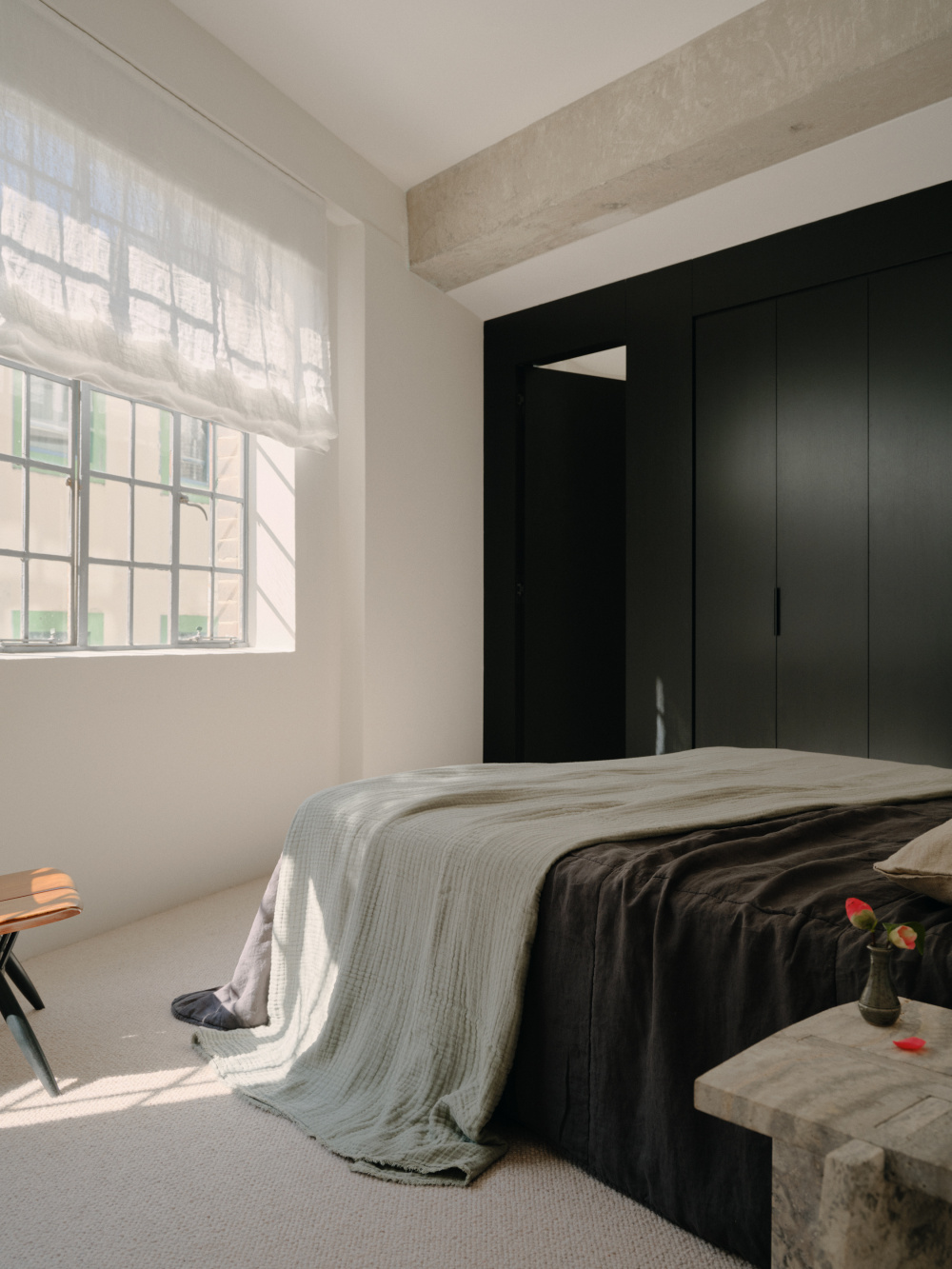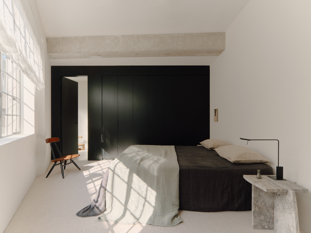 设计团队拆除了建筑历史中累积的隔墙、假天花板与装饰面层,让百年历史的木地板、混凝土柱与横梁重见天日。这些带着时光痕迹的结构元素,成为空间的 “天然装饰”—— 混凝土柱的粗糙肌理、木地板的磨损痕迹,既传递出旧仓库的工业质感,又为极简空间注入 “可触摸的历史温度”,避免了现代设计的冰冷疏离。原始建筑的规整网格布局被完整保留,一排排钢框架窗户嵌入其中,既最大化引入自然光,让光线在空间中自由流动,又能将萨里山的城市景致框定为 “动态的建筑背景”。这种设计让 “历史结构” 与 “当代功能” 无缝衔接,让居住者在享受现代生活便利的同时,始终能与建筑的过去产生联结。