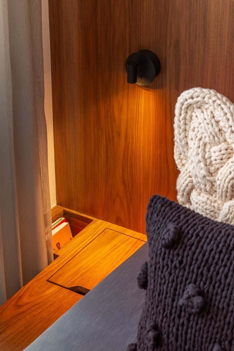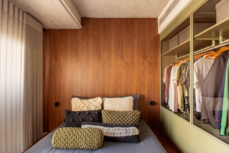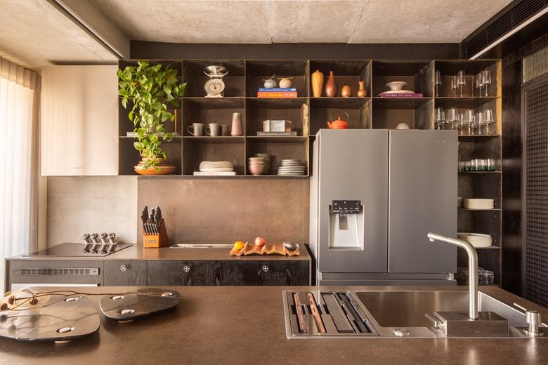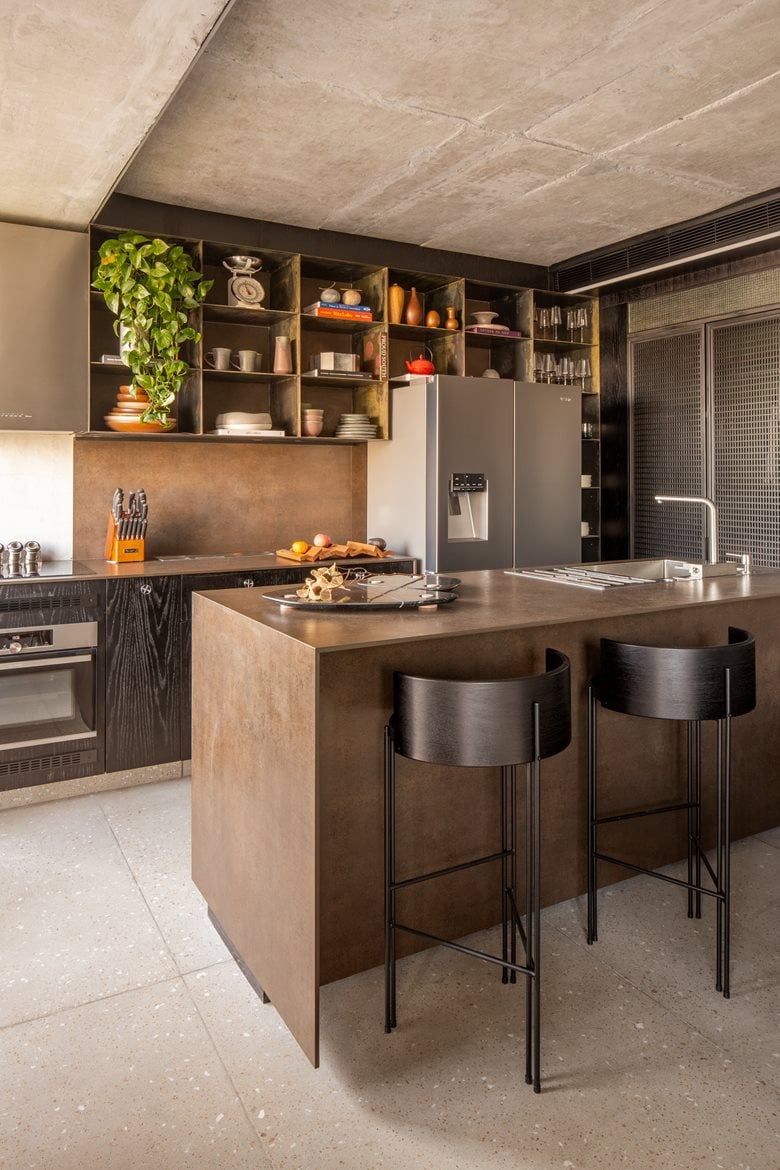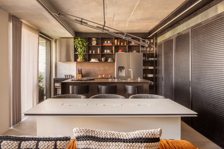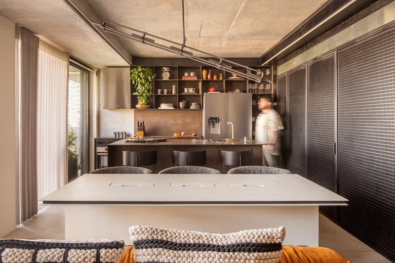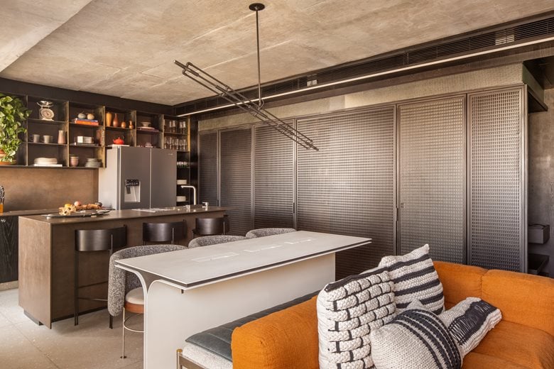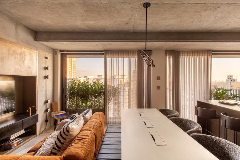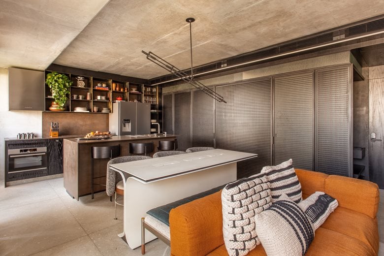 位于圣保罗州马达莱纳镇(Vila Madalena)的 loft风小户型公寓设计,面积为 63 平方米,它承载了住户对功能性与现代感住宅的向往。Zalc 建筑事务所(Zalc Arquitetura)以裸露的楼板和立柱为设计起点,将工业美学与精致家具、创意解决方案相结合,实现了空间的优化与整合。工业风格通过裸露混凝土、氧化金属构件,以及低调的黑灰配色得以凸显。为平衡这些元素并形成对比,建筑师引入了定制设计作品 —— 例如 Estudio Bola 工作室设计的沙发,同时搭配了高端材质。