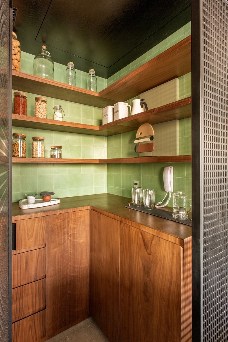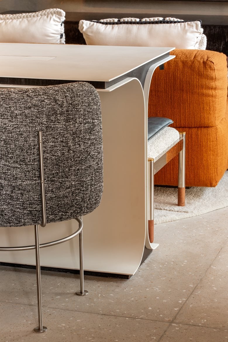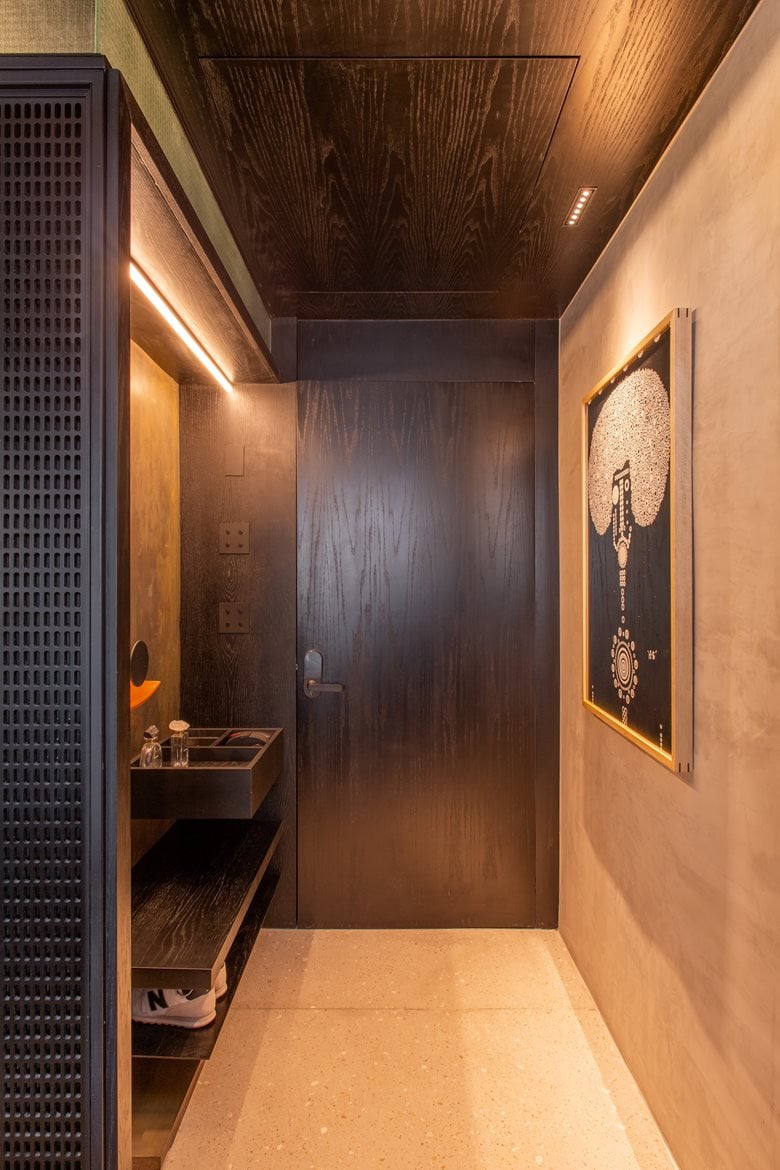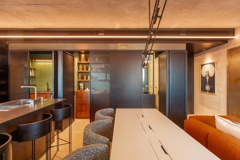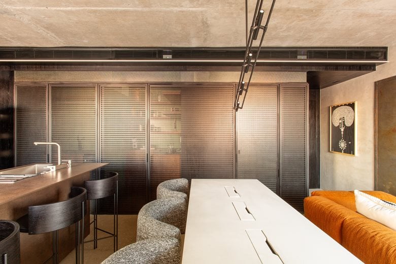 以空间整合与流动性为核心,布局中融入了定制化设计方案。例如,服务区和食品储藏室由穿孔木质结构围合,既保证了部分视野通透,又维持了美学上的连贯性。在社交区域,餐桌长凳直接设置在沙发后方,省去了两者之间的通行空间。工作室设计的餐桌还兼具工作台功能,内置了电源和网络接口。最终呈现的这个项目,将技术精准性与创意相融合,满足了住户的日常需求。