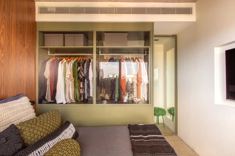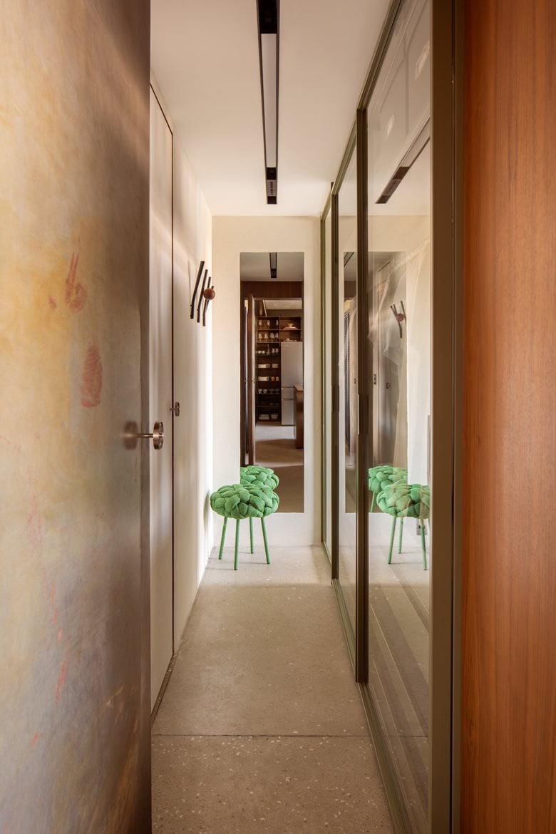 色彩点缀巧妙地出现在物件、家具和绿植中。一个亮点是洗衣区使用的绿色水硬水泥砖,从客厅透过穿孔板便能看到它,为空间增添了轻盈感与独特气质。照明设计尊重公寓的原始结构。由于混凝土楼板保持裸露状态,电力网络被整合到线性照明型材中,嵌入混凝土梁和木作之中。壁灯与吊灯完善了整个照明系统,为室内增添了温暖感与辨识度。