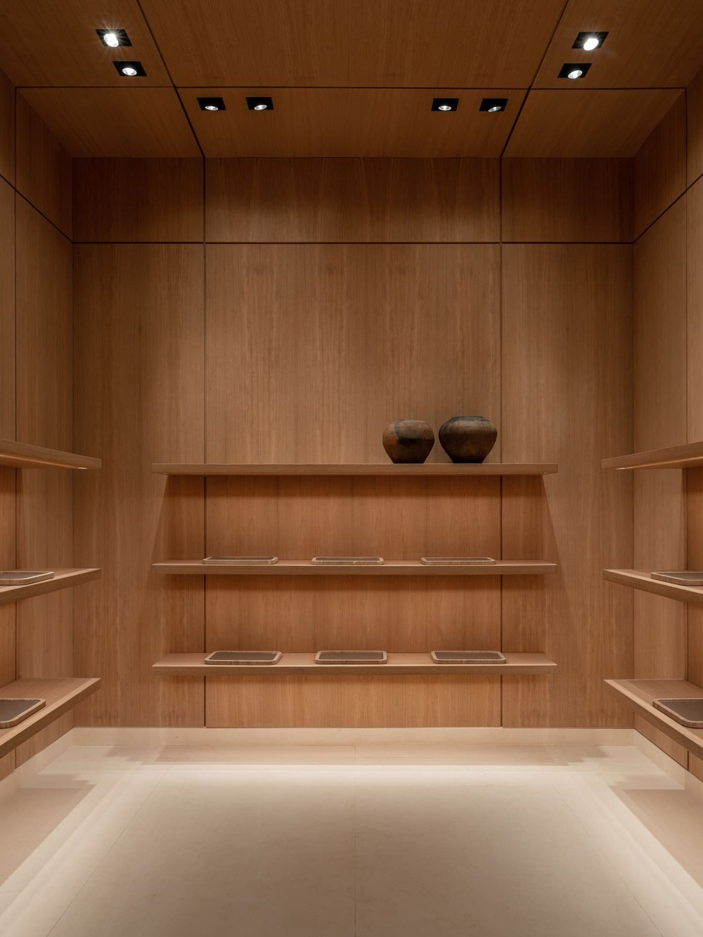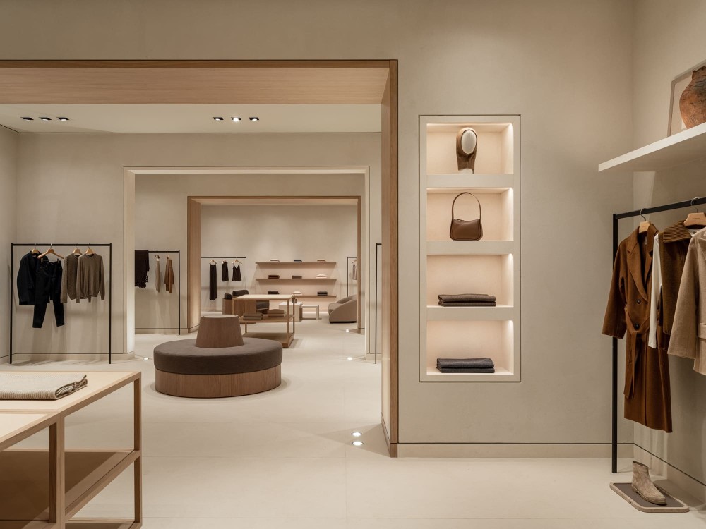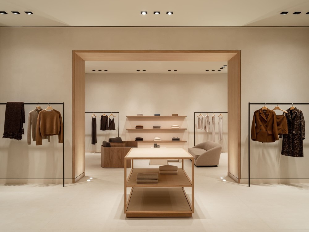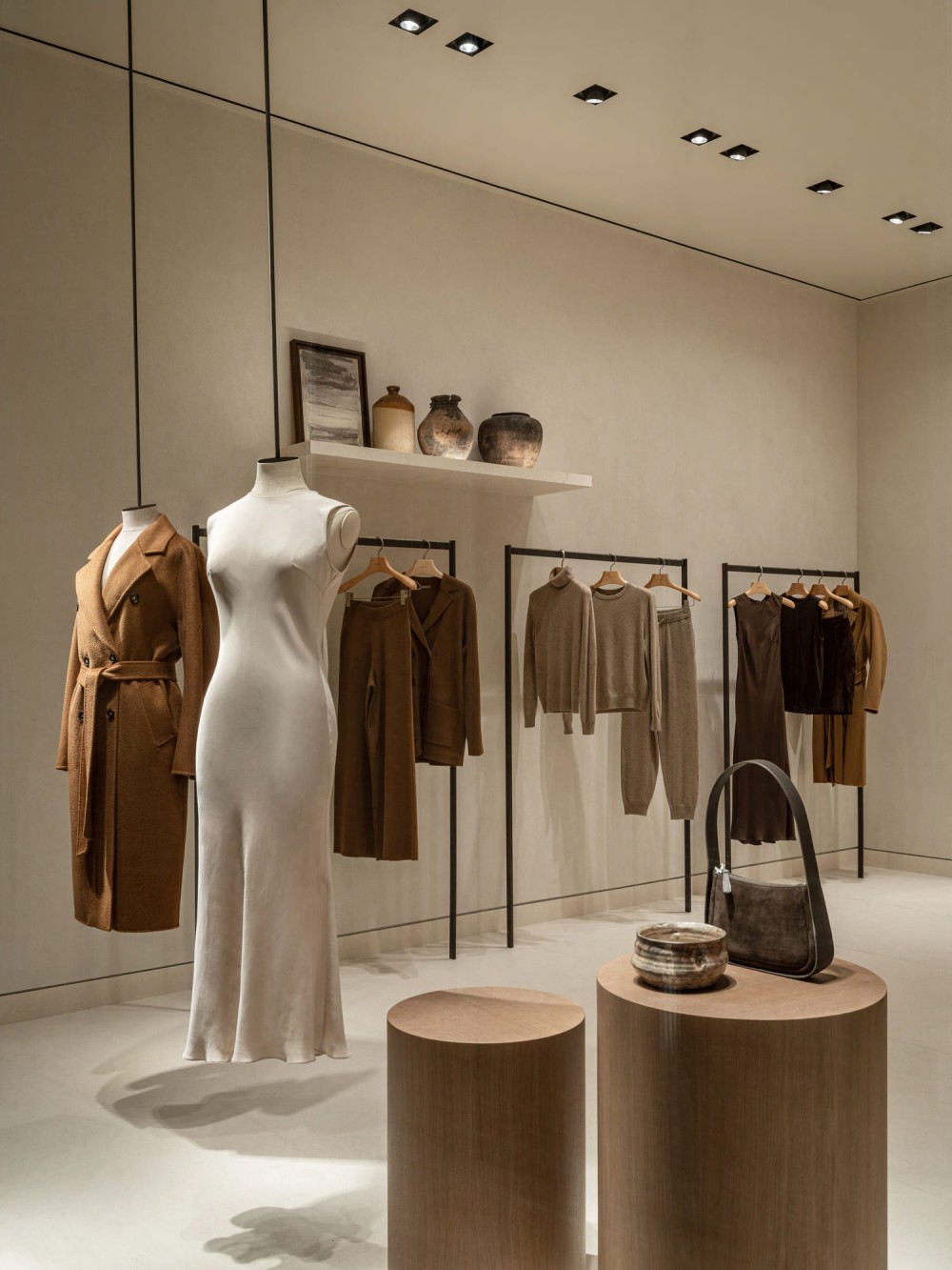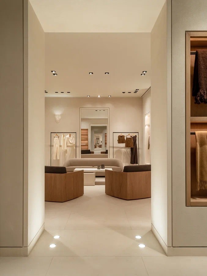 自然光的引入是点睛之笔。尽管身处商业空间,设计师仍通过高窗与镜面反射,让光线在洞石墙面与木质展架间跳跃。白天,自然光为空间披上一层柔和的滤镜,时装在光影中呈现出更接近日常的穿着效果;傍晚,人工灯光的暖调则让空间变得愈发温馨,为晚场的购物体验注入 “家的松弛感”。空间的细节设计处处呼应着 “时装的精致主义”。服装架的木质衣架与品牌的调性严丝合缝,避免了金属衣架对服装廓形的破坏;墙面的艺术装置—— 如古朴的陶罐、极简的线描画,与时装的设计语言形成跨媒介的对话,暗示着品牌对 “艺术化生活” 的追求。甚至收纳区域也暗藏巧思:嵌入式的木质搁板以 “非对称布局” 呈现,叠放的羊绒衫、折叠的丝巾如陈列品般精致,让 “收纳” 本身成为空间美学的一部分。这种对细节的偏执,恰如高级时装对 “工艺” 的执着,让整个空间从 “物理容器” 升华为 “时装精神的物质载体”。