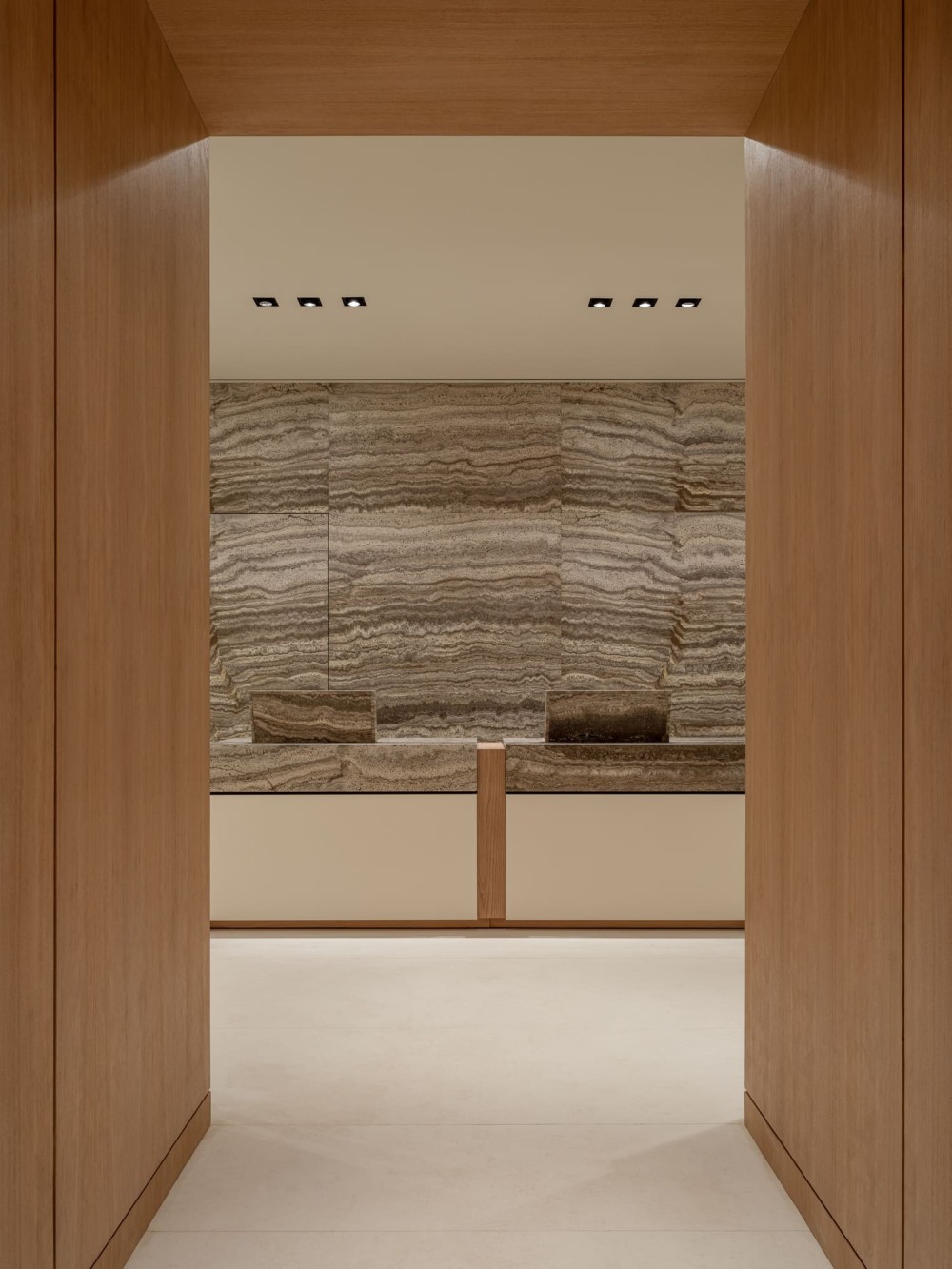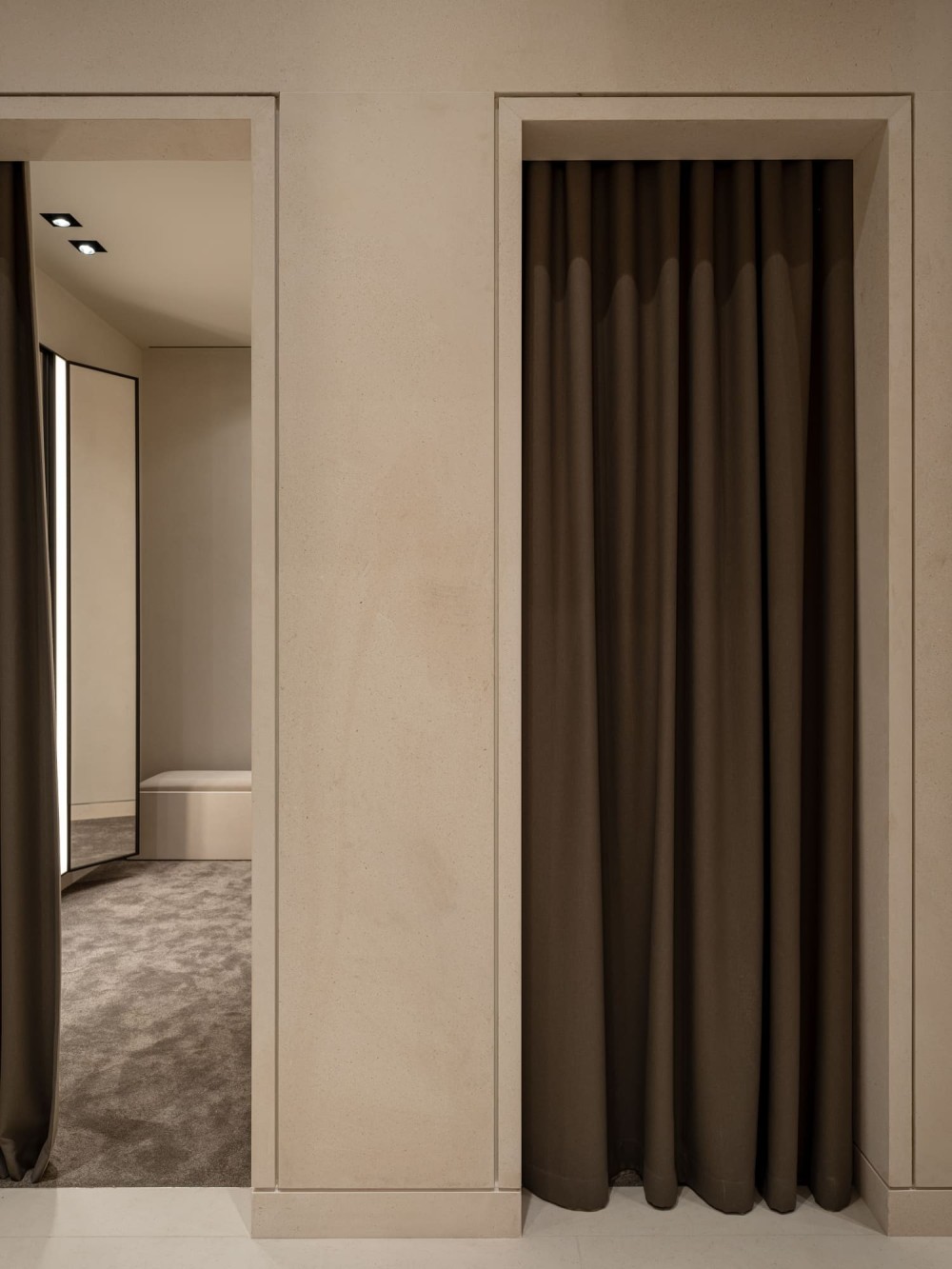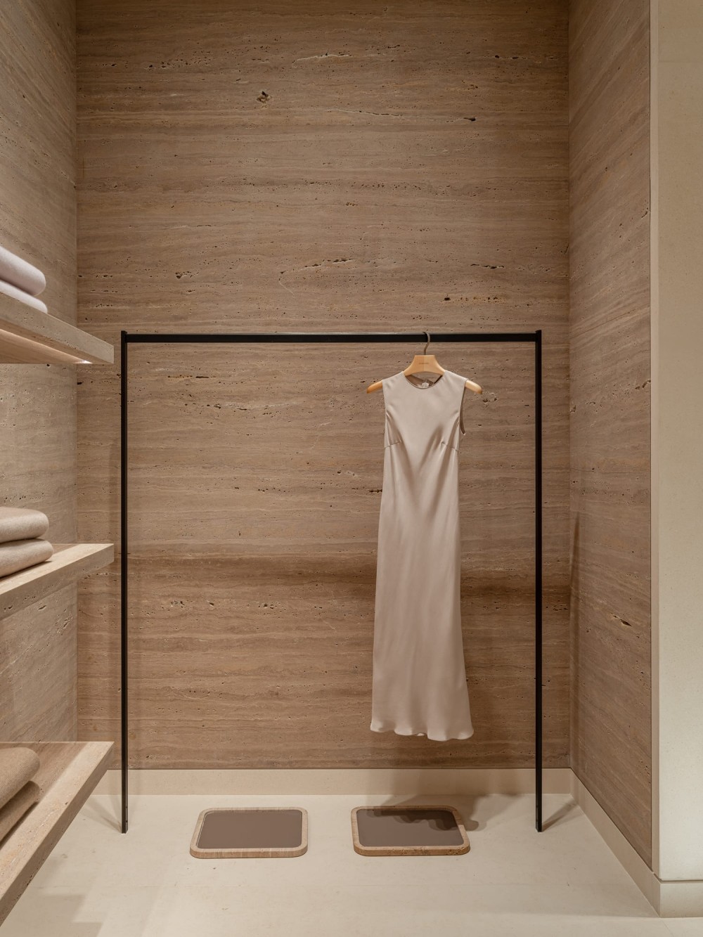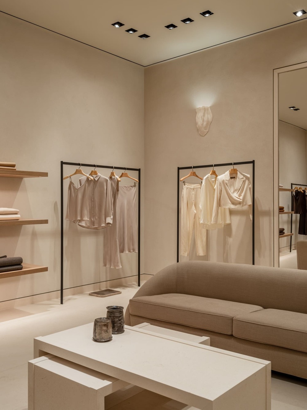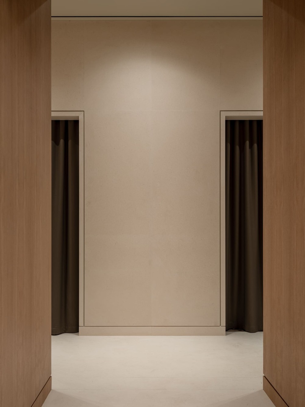 这间服装店的设计,是对 “零售空间美学” 的一次深刻革新。它以侘寂美学为内核,用材质的本真、空间的叙事、光影的留白,为时装打造了一处 “会呼吸的容器”。在这里,购物不再是匆忙的交易行为,而是一场 “人与时装、空间与美学” 的深度对话 —— 每一件服装的触感、每一块材质的肌理、每一束光线的明暗,都在共同谱写着 “质感生活” 的当代注解。它证明,优秀的时装零售空间,应当是品牌精神的 “三维表达”:当访客在木与石的环绕中触摸时装的质感,在光影的变幻中感知设计的巧思,这场 “空间与时装的共生之舞”,便已超越了商业的范畴,成为一段关于 “美与质感” 的沉浸式记忆。