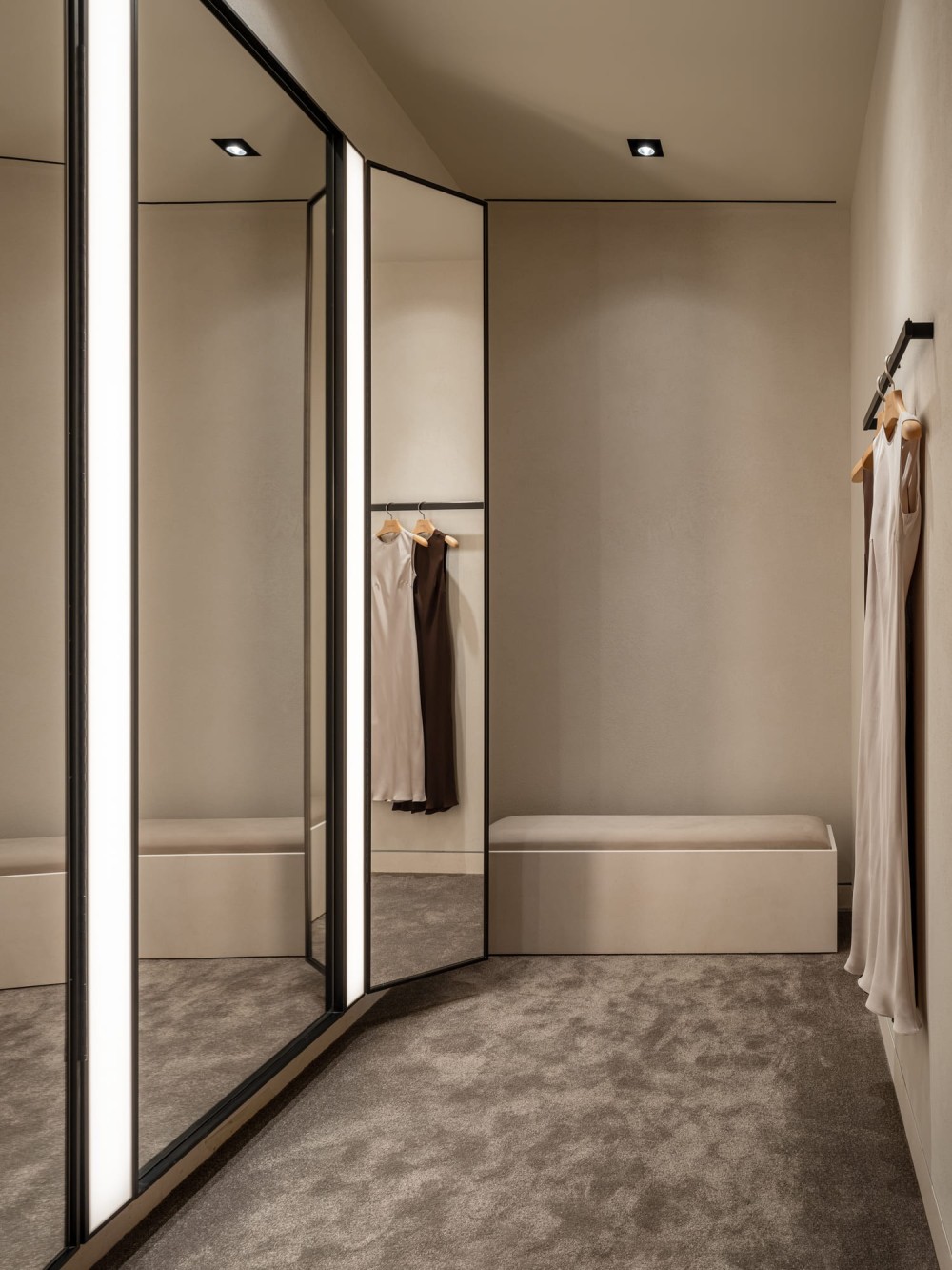 空间的布局暗藏叙事逻辑,每一个转角都是 “时装故事” 的章节切换。入口处的木质拱门如幕布般拉开,将访客的视线引向中岛展台的核心展示区 —— 这里的服装陈列如艺术装置,每件单品都在灯光的聚焦下成为主角,而背景墙的简约留白,让时装的色彩与廓形得以完整释放。试衣间区域的设计堪称 “私密与仪式感的平衡术”。深棕色布帘的垂坠感营造出专属的试衣氛围,帘后却是另一番天地:带灯镜的三面环绕设计,让试衣者能 360° 捕捉服装细节;地面的灰色地毯柔软踩感,消解了试衣时的局促感,让 “试穿” 成为一场 “沉浸式的自我表达实验”。