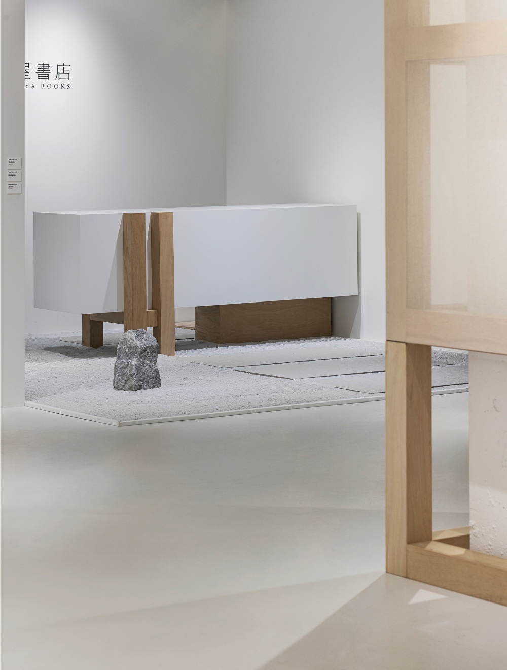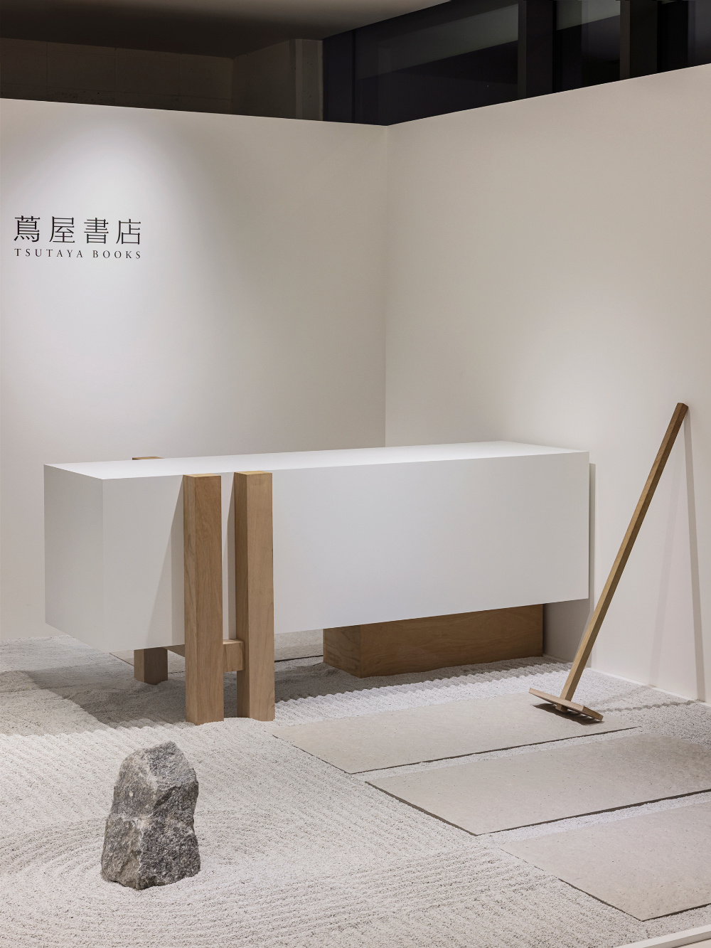 艺术展示台采用 “简洁的白与木结合” 的造型,如同 “家中的置物台”。台上陈列的艺术作品,与台下 “枯山水石材”“木质结构” 形成 “生活场景与艺术创作” 的对话 —— 艺术不再是 “高高在上的展品”,而如同 “生活中被珍视的器物”,契合侘寂美学 “在日常中发现美” 的精神;“茑屋书店” 的标识以 “简洁的黑色字体”,低调地呈现在白墙上,没有过度的装饰,如同 “生活中不经意的印记”。这种 “融入式” 的品牌表达,既保持了空间的 “侘寂纯净感”,又让品牌与 “侘寂美学场景” 自然融合,传递出 “茑屋书店是文化与生活融合载体” 的品牌理念。
