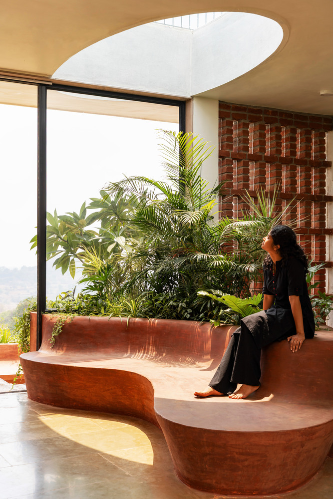 在 Prakriti 别墅,人们可以通过多种亲生物设计,从视觉、嗅觉或听觉上感受森林在室内外的 “呼吸”。这座别墅如同从萨希亚德里山脉肥沃土壤中诞生的大地生物,以赤陶色调 “孕育” 出各种绿色元素。设计采用适应气候的被动式太阳能策略,双坡屋顶和深悬挑通过阳台和露台遮挡强烈阳光,砖制窗花格引入漫射光。居住空间实现穿堂风,确保全年热舒适。