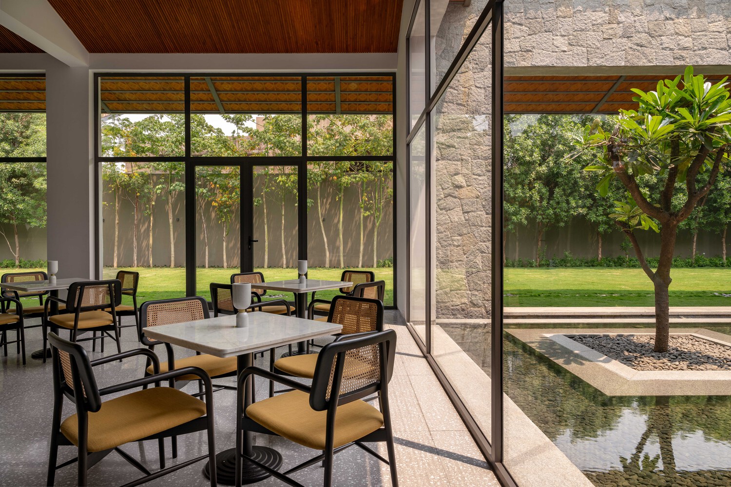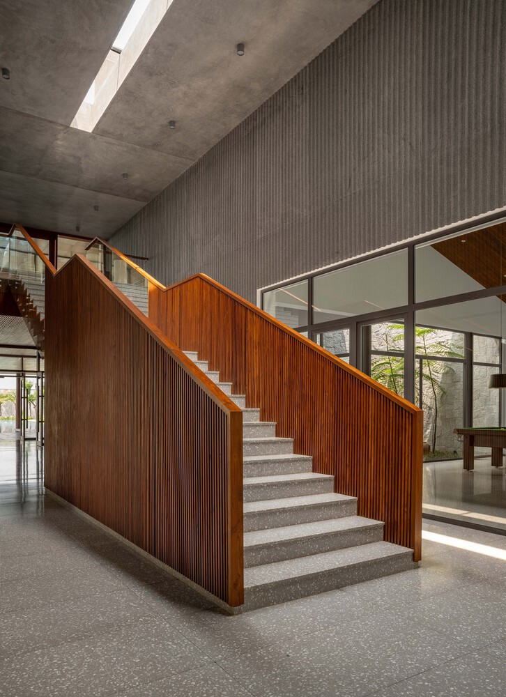 覆盖着降温赤陶瓦的主坡屋顶大幅向外悬挑,为建筑遮挡赖布尔夏日的酷热阳光。一条有顶通道从入口延伸至餐厅,其屋顶由钢支柱支撑,避免了立柱的使用,确保花园景观视野不受遮挡。材料选择以天然材质为主:干砌的 Sadharhalli 花岗岩、竖纹花岗岩、经河流冲刷质感处理的 Kota 石(用于步道)、抛光灰色水磨石地面,以及抛光水泥天花板。这些富有触感的表面营造出层次丰富的材质体验。入口和泳池处的主要立柱采用醒目的红氧化物饰面,成为极具张力的设计元素。