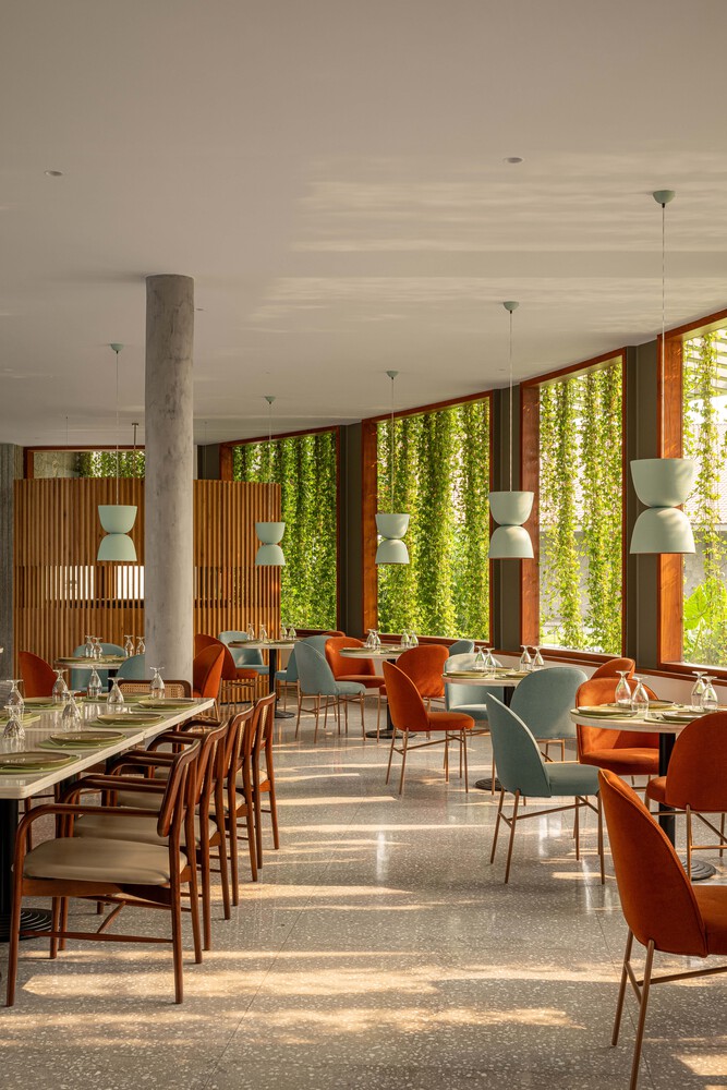 室内设计 —— 从建筑角度而言,该建筑以线性、正交和水平元素为特征。为平衡这种风格,我们引入了流畅的室内设计元素 —— 家具的曲线线条、通透的格栅屏风,以及柔和的土色调(绿色、赭石色、青绿色和铁锈色),与自然环境相呼应。