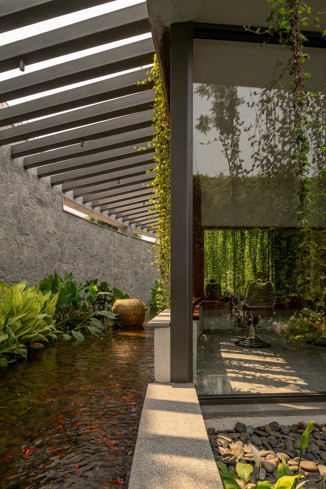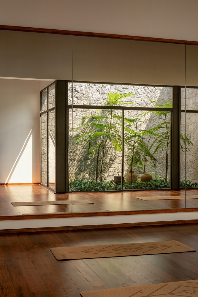 在功能上,会所包含宴会厅、短住客房、剧院、壁球馆、羽毛球馆、图书馆、咖啡厅、游戏室、餐厅、游泳池、水疗中心、瑜伽室和健身房。每个区域都设计为向自然敞开的形态:图书馆和咖啡厅毗邻宁静的水域,周边种植着寺庙树(temple trees);圆形餐厅和水疗中心则俯瞰着热带水景,水景由爬满植物的 pergola(花架)框定。