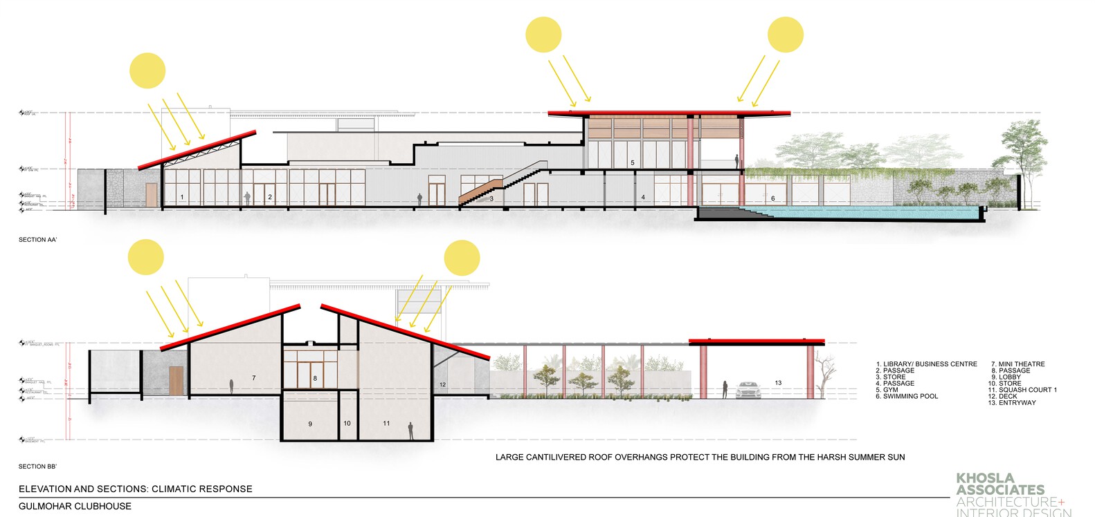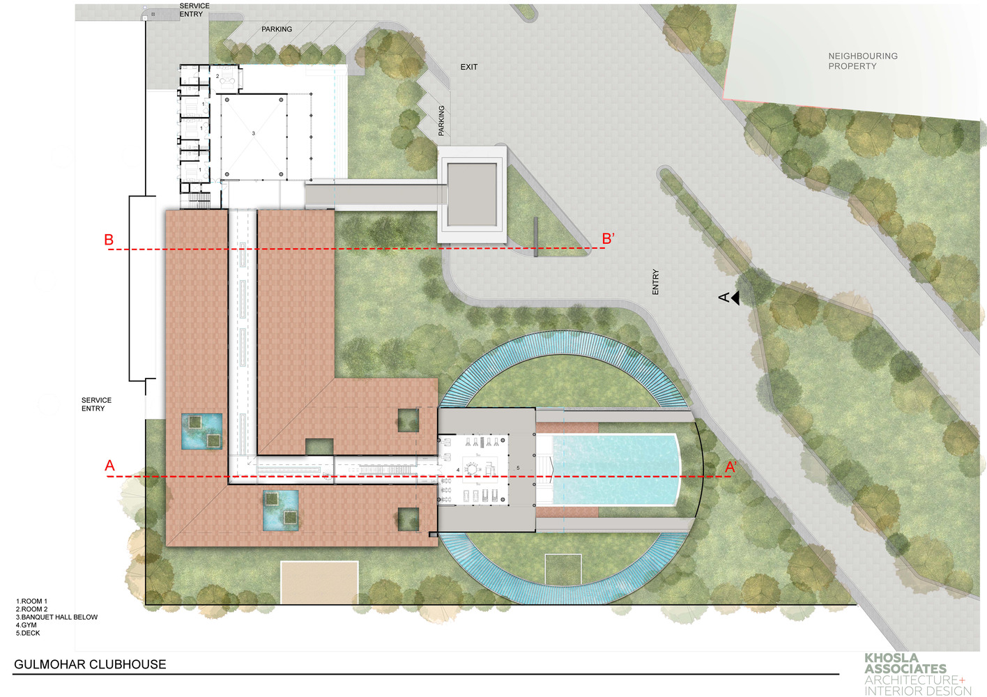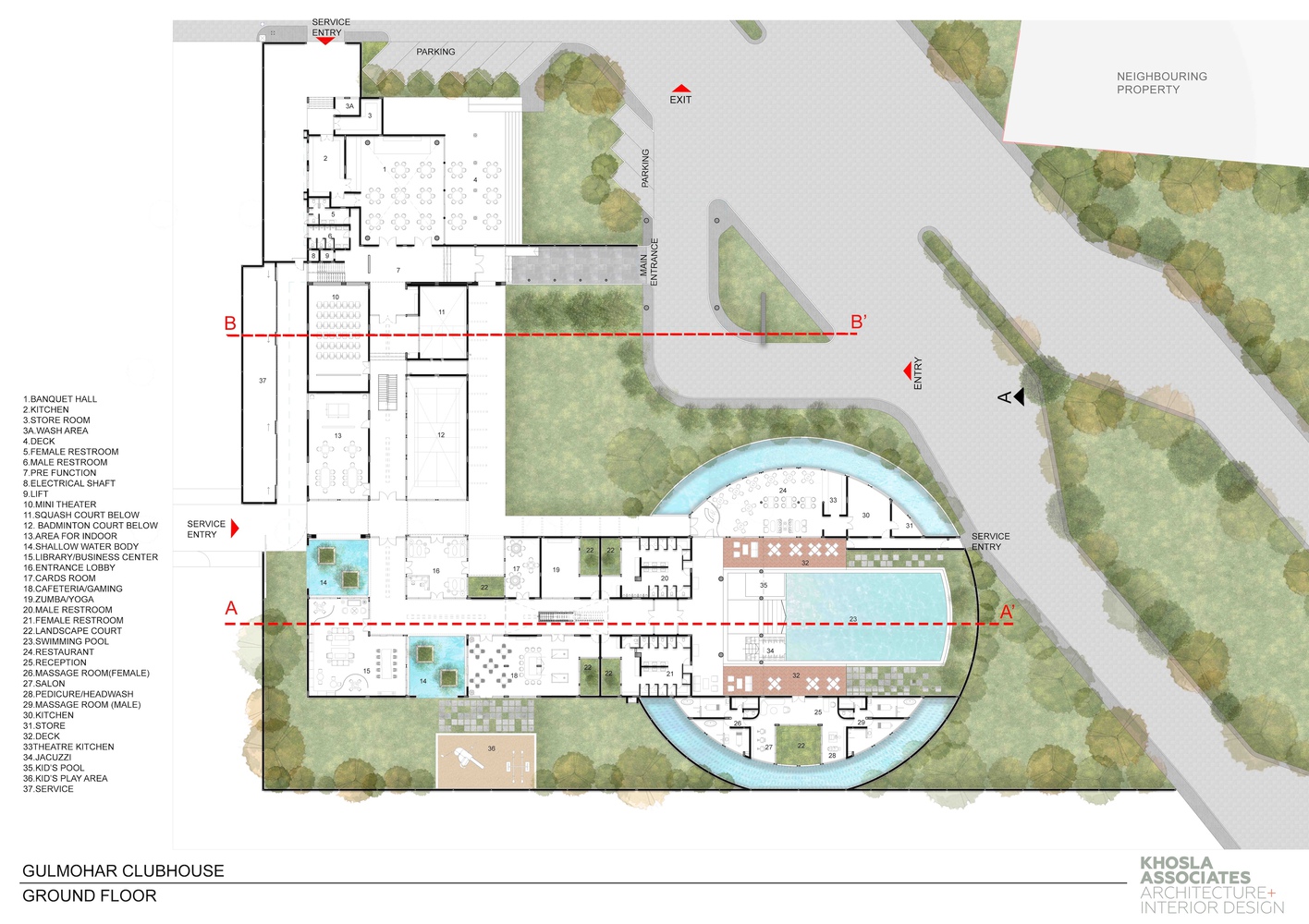 场地与环境 —— 会所位于印度恰蒂斯加尔邦赖布尔市,当地气候干燥酷热,夏季气温可达 42 至 45 摄氏度(108 至 113 华氏度)。这座会所坐落于我们总体规划的 42 英亩别墅开发区内,位于入口处的三角形地块上,方便居民和访客进出。场地独特的形状启发了设计方案:两个矩形以直角相交,末端以一个圆形收尾。交接处设有一座图书馆,圆形部分则容纳了餐厅、水疗中心和游泳池。每个空间都向精心设计的花园或庭院敞开,让光线、空气能够渗透到室内。