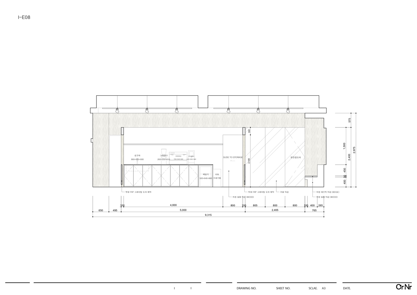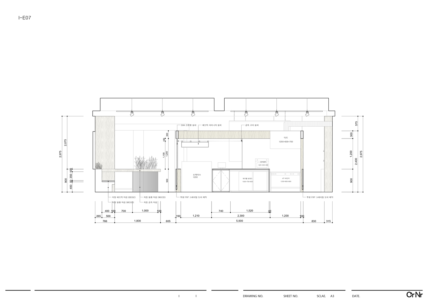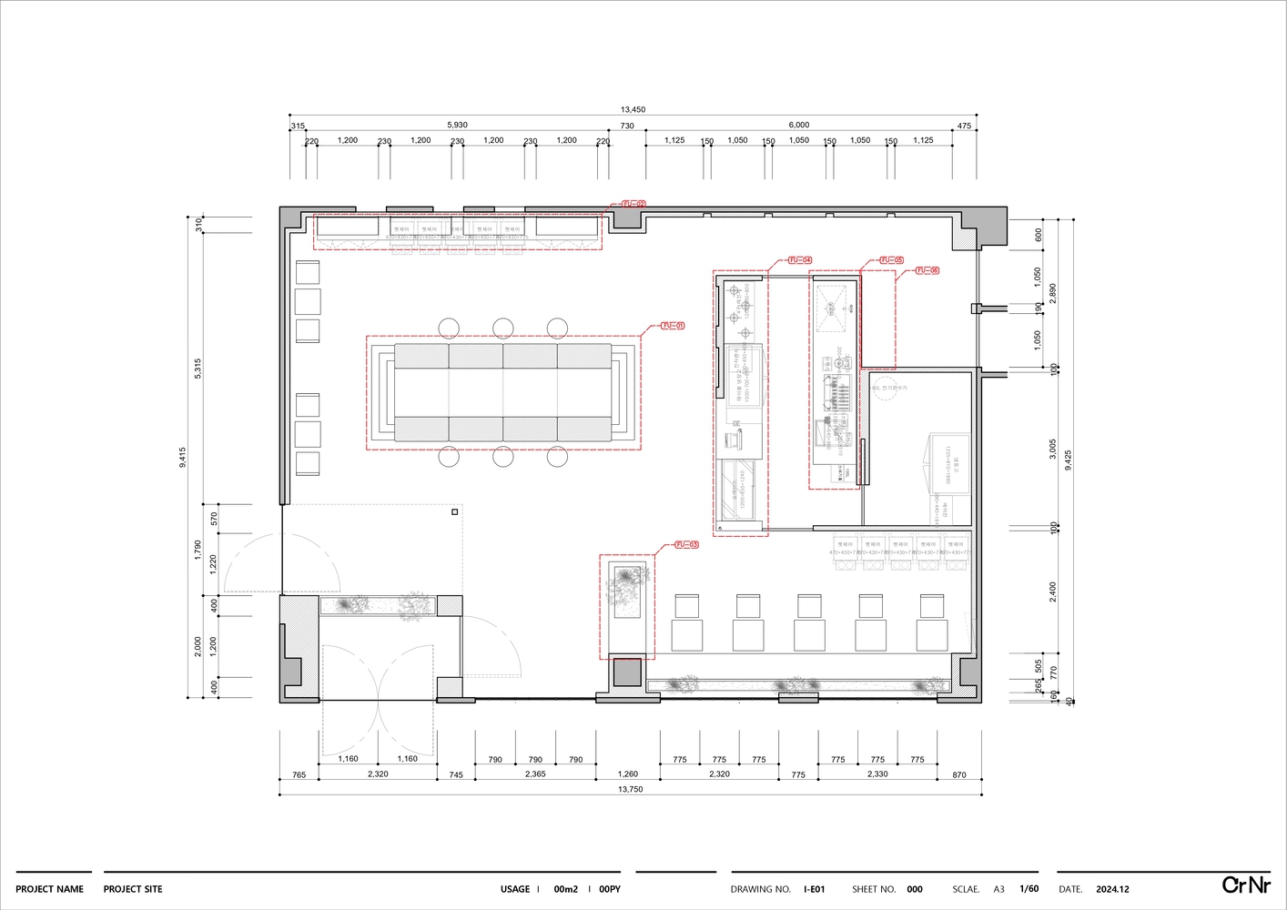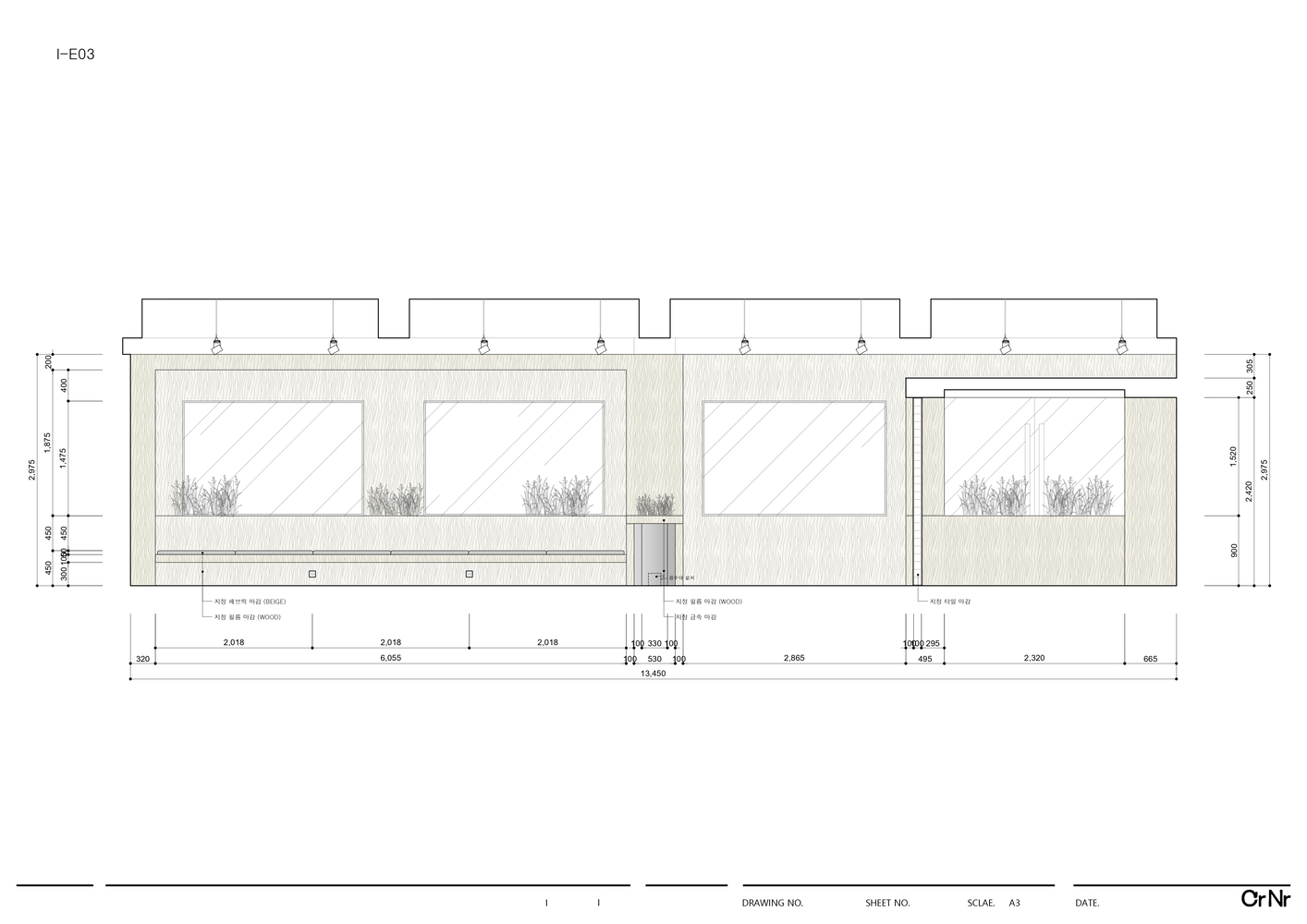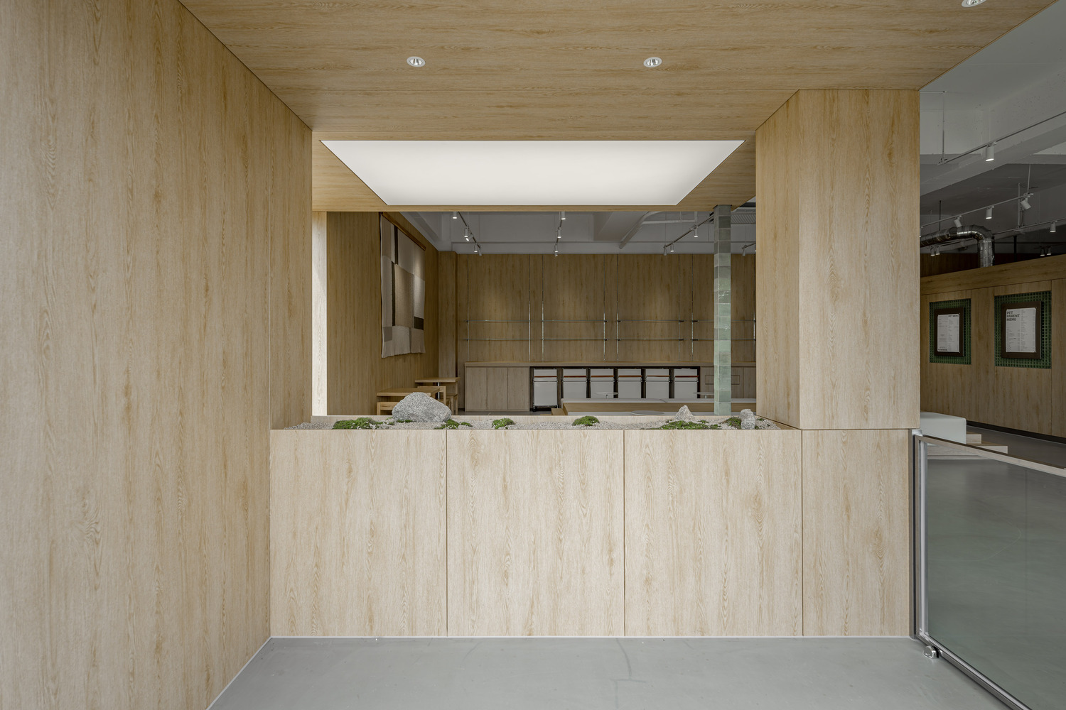 整体的色彩搭配和材料以各种质感的绿色系为统一基调。铜绿色的瓷砖包裹着柱子,半透明的 FRP 格栅置于菜单板后方,拼布面料的定向编织则增添了深度和触感。尽管材料各不相同,但它们都朝着同一个方向发挥作用 —— 营造出一种韵律和视觉流动感,将空间体验与品牌标识巧妙地连接起来。