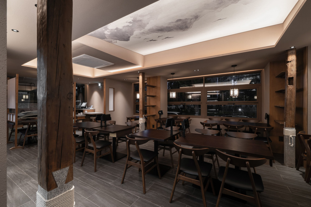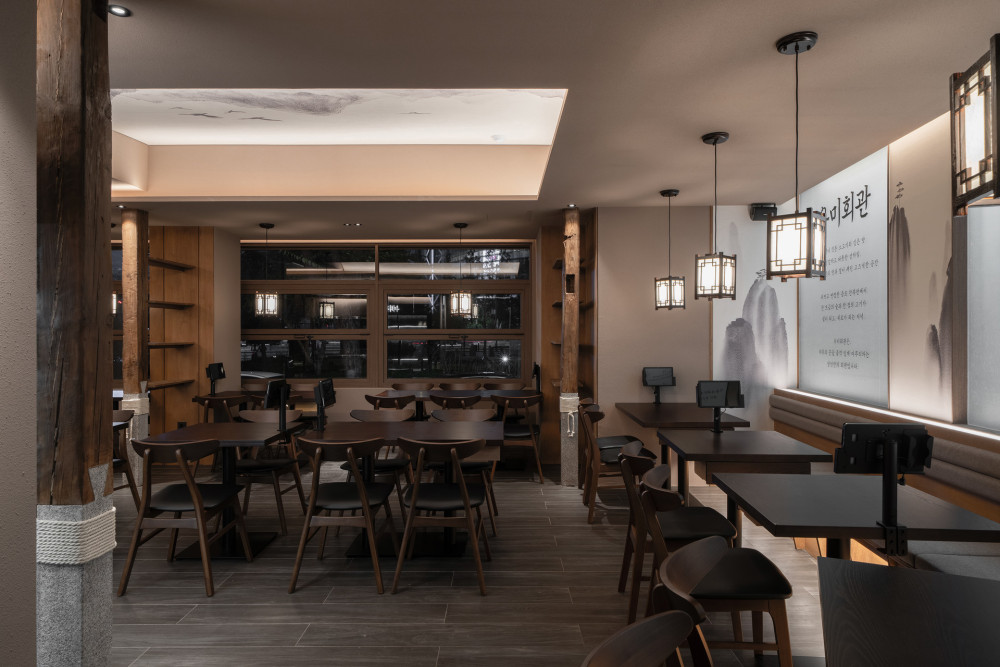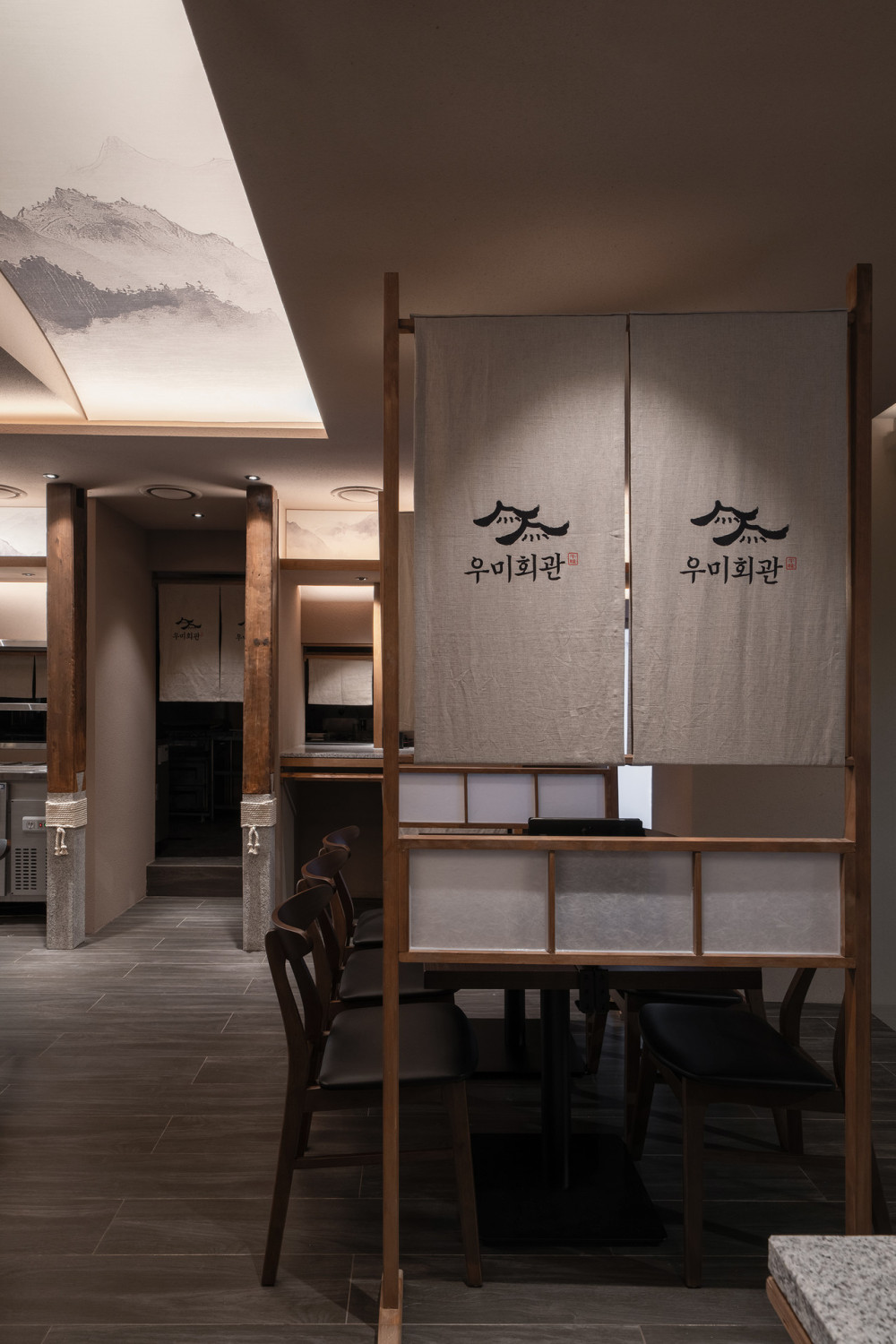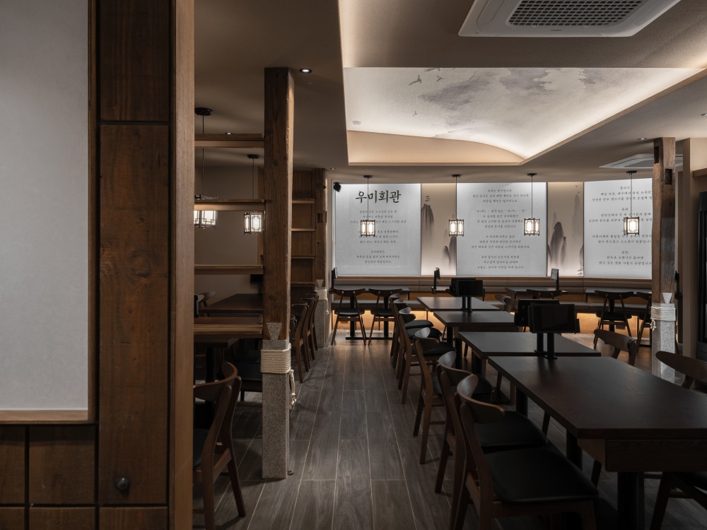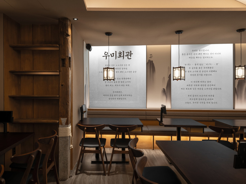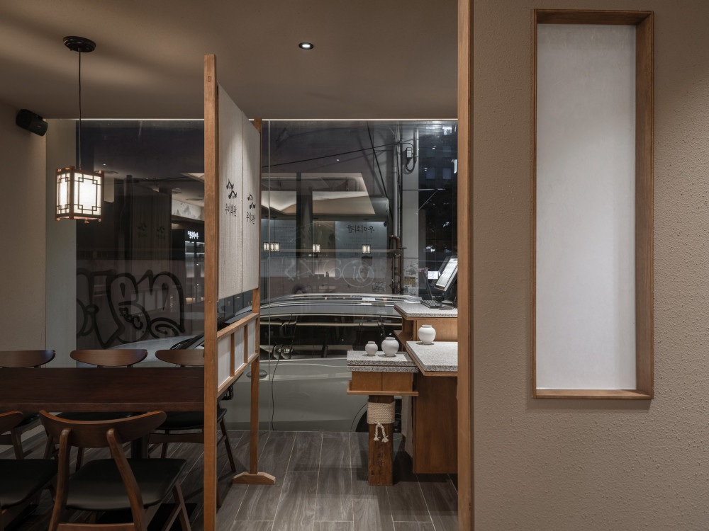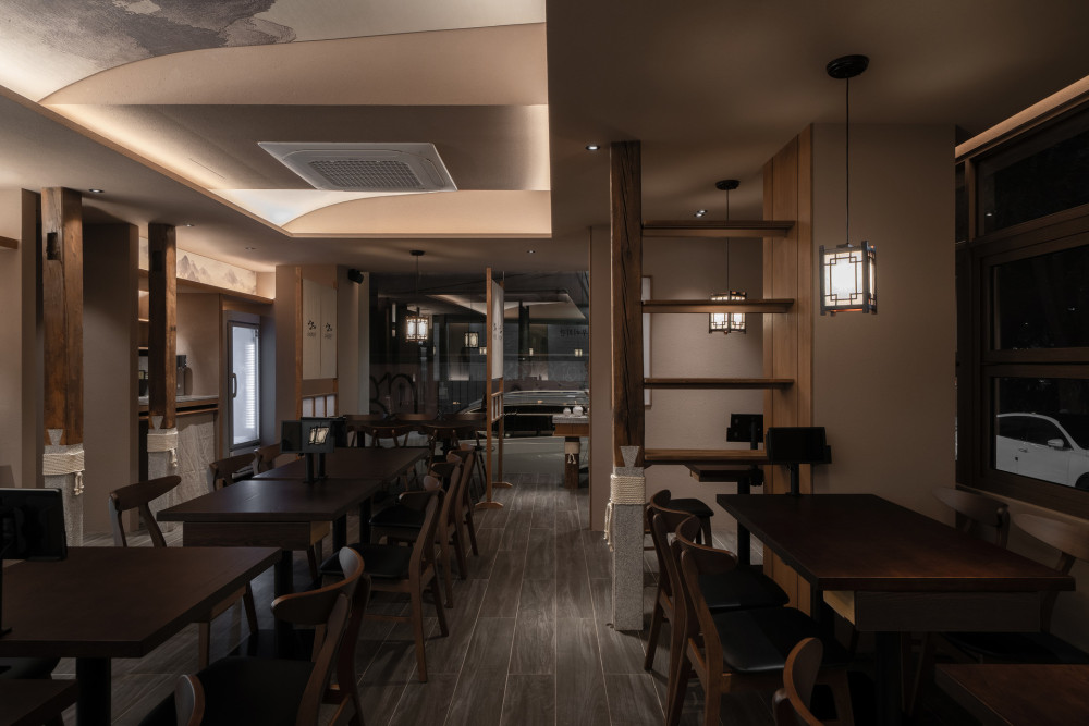 造型设计是空间文化识别性的核心,此空间对韩式传统造型元素进行了现代转译。立柱的设计保留了原木的天然形态,未经过多修饰,展现出韩式传统建筑中 “材美工巧” 的理念;灯具采用了韩式传统灯笼的造型,却以现代的材质与工艺进行制作,既保留了传统的神韵,又符合现代的审美需求;墙面的水墨装饰与文字展示,将韩式传统书画艺术融入空间,成为空间中极具文化感的视觉焦点。这些造型元素的运用,并非简单的复古,而是在传统与现代的碰撞中,打造出既具文化记忆点,又符合当下审美的独特空间形态。