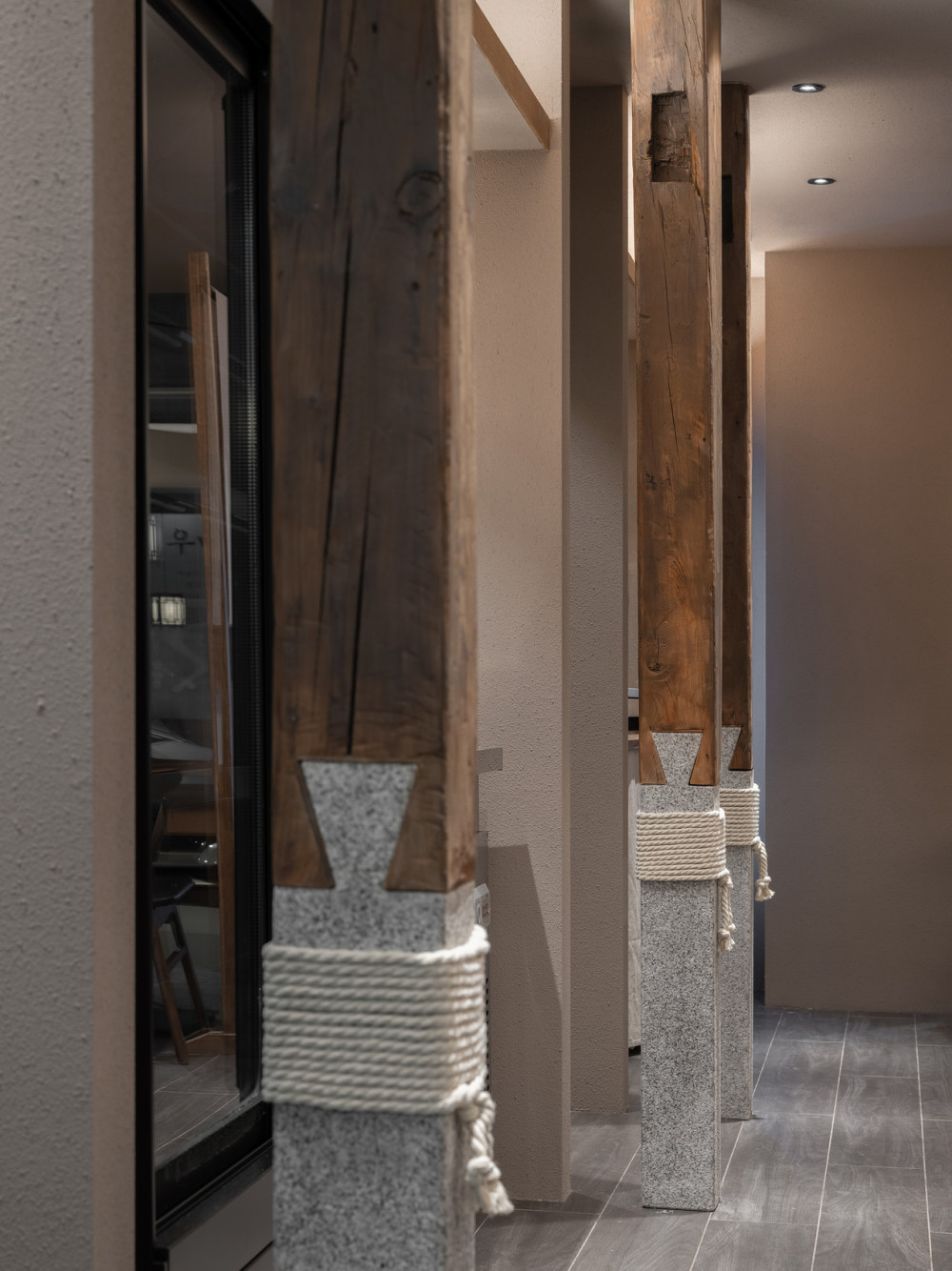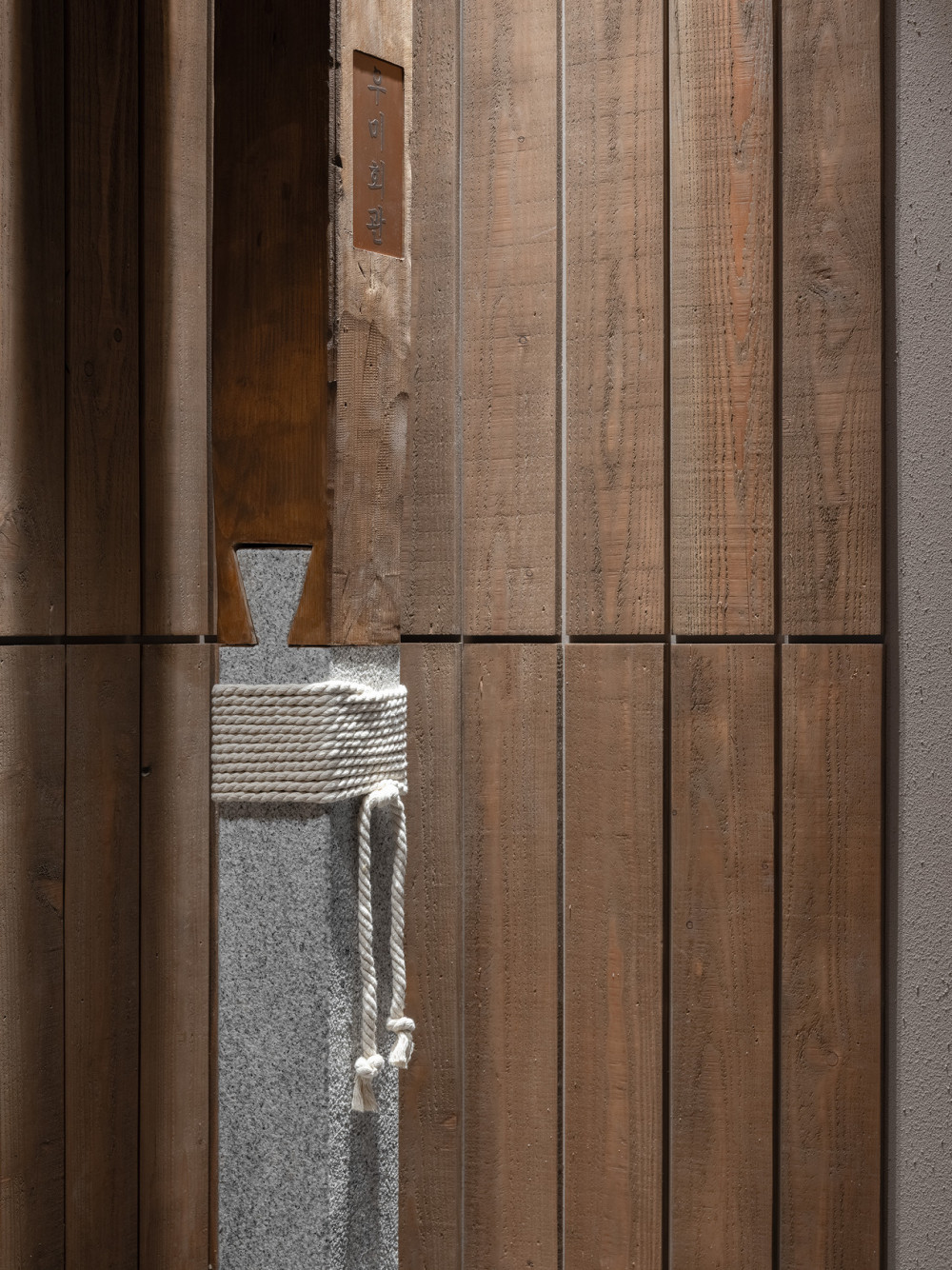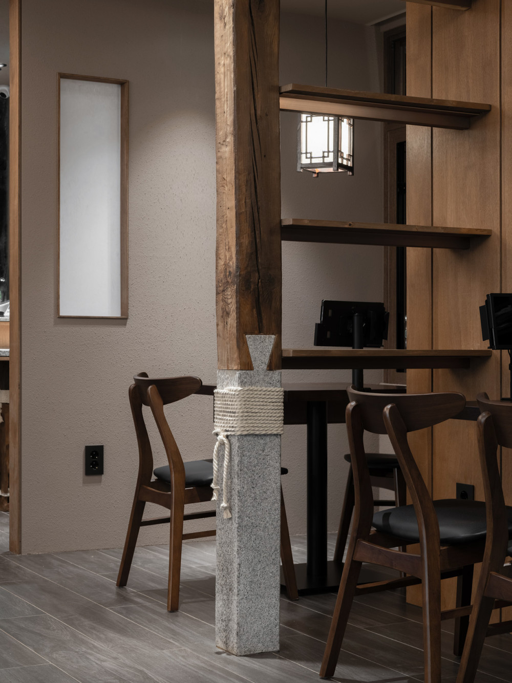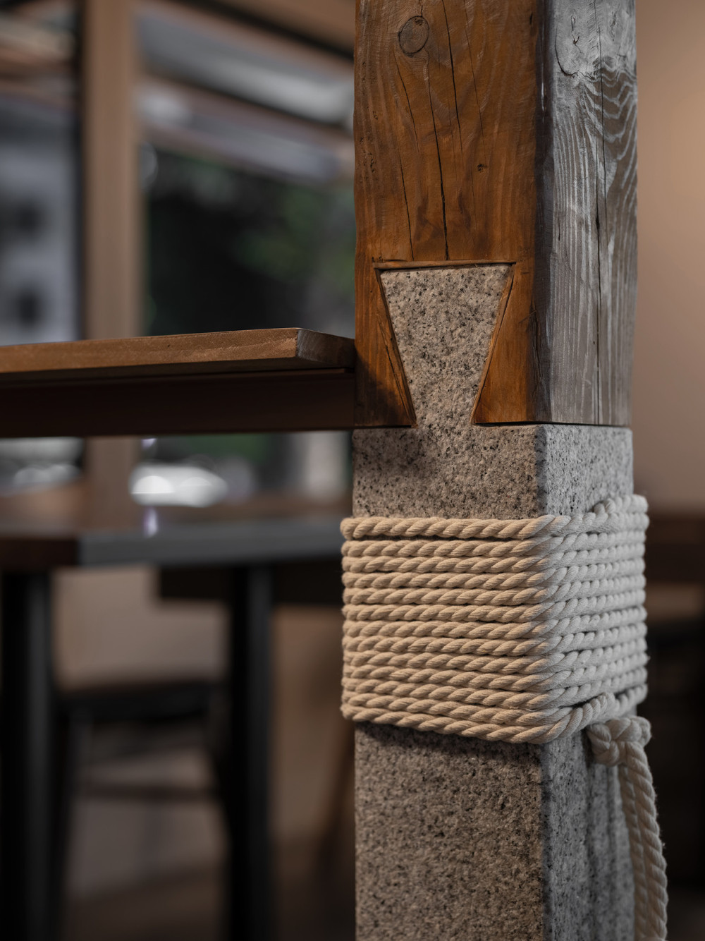 材质是空间质感与文化氛围的重要载体,此餐饮空间在材质选择上尽显巧思。大量天然木材的运用,如桌椅、立柱、置物架等,木材的天然纹理与温润触感,传递出韩式传统建筑中对自然材质的崇尚,营造出质朴、温暖的空间基调。同时,石材的融入,在立柱底部等位置,以其冷冽的质感与木材形成对比,既强化了结构的稳固感,又丰富了空间的材质层次。麻绳的缠绕装饰,更是为空间增添了手工艺术的温度,呼应了韩式传统工艺中对细节与自然材料的重视,让食客在触摸与感受中,便能体会到空间所蕴含的文化底蕴。